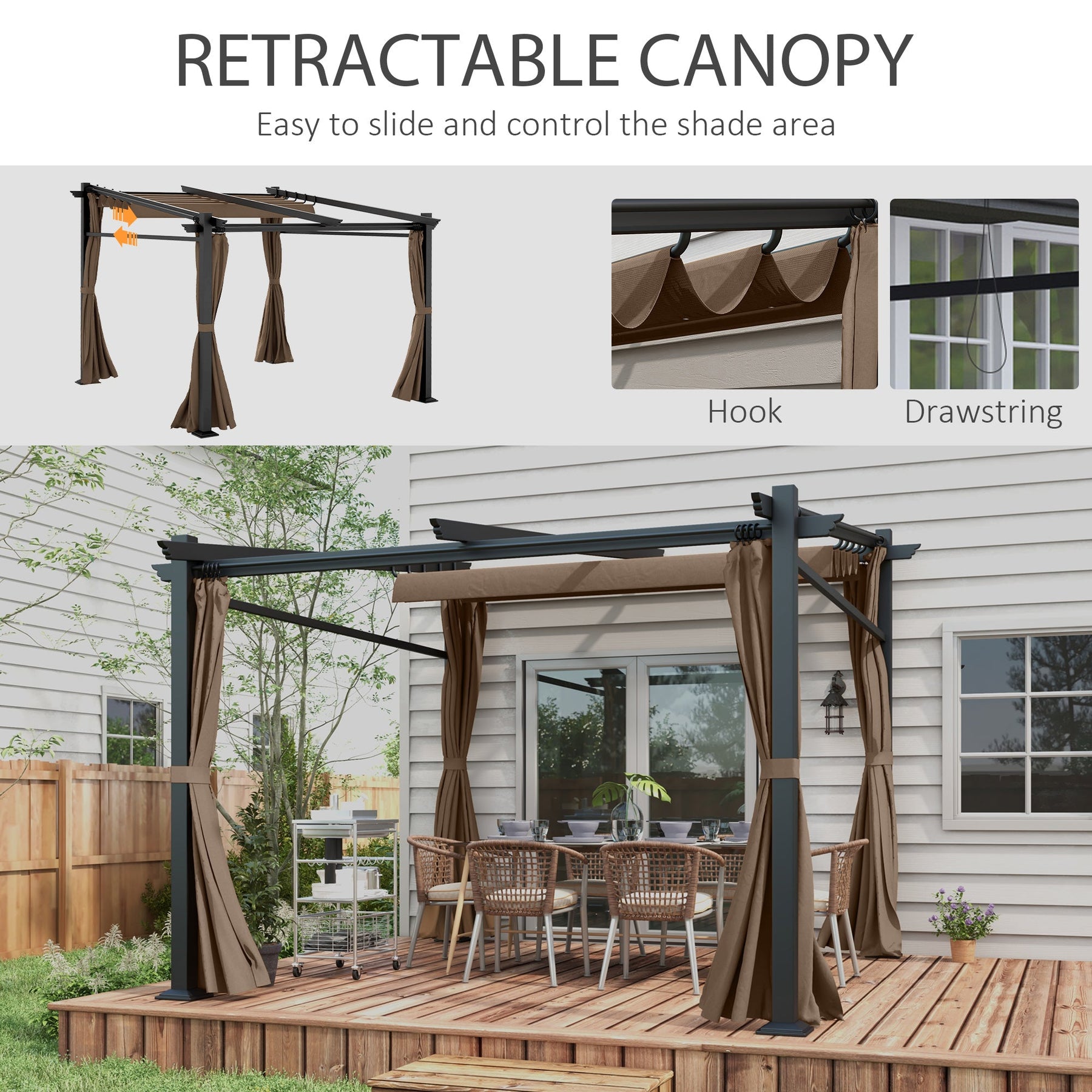 Transform your outdoor space into a stylish and private retreat with this Retractable Outdoor Pergola. Designed with convenience and comfort in mind, this pergola features a retractable canopy that can be easily adjusted using a pulley system, giving you the ability to control the amount of shade and sunlight. The PA-coated canopy provides protection against harmful UV rays, ensuring you stay cool and safe while enjoying the outdoors. The pergola is equipped with 4 removable curtains to block the sun and eliminate glare, offering added privacy and a cozy atmosphere. Constructed with a rust-resistant, powder-coated steel frame, this durable pergola is built to withstand the elements and provide long-lasting enjoyment. With 8 grommets for water drainage, the canopy remains protected from rain and prevents potential falls due to water buildup. This pergola is an excellent addition to your backyard, patio, or garden, perfect for relaxing or entertaining guests.