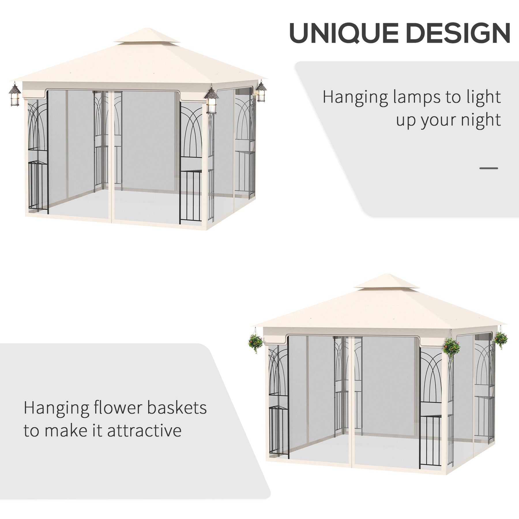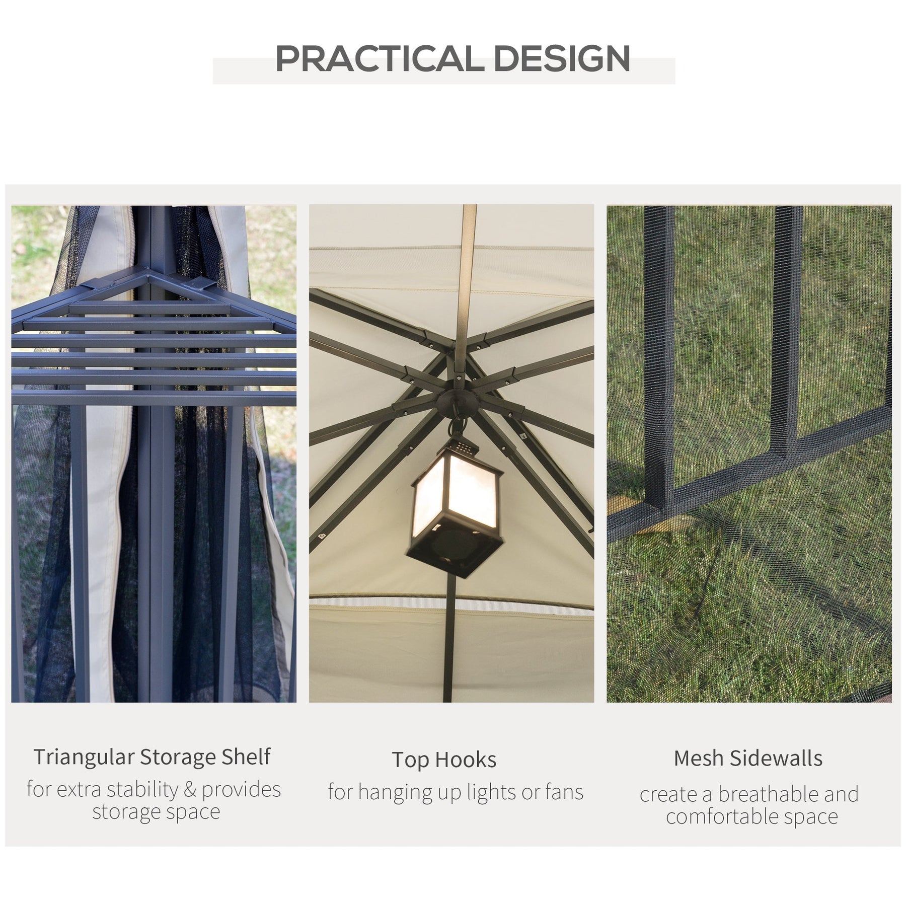 Enjoy your outdoor space like never before with this Double-Tier Roof Gazebo. Designed with functionality and comfort in mind, this gazebo features a two-tiered roof with mesh netting that enhances airflow, keeping you cool on warm days. The polyester canopy with a PA coating offers reliable sun protection and durability. The ceiling and eaves corner hooks provide convenient spots to hang lamps or fans, allowing you to create the perfect ambiance for your gatherings.
