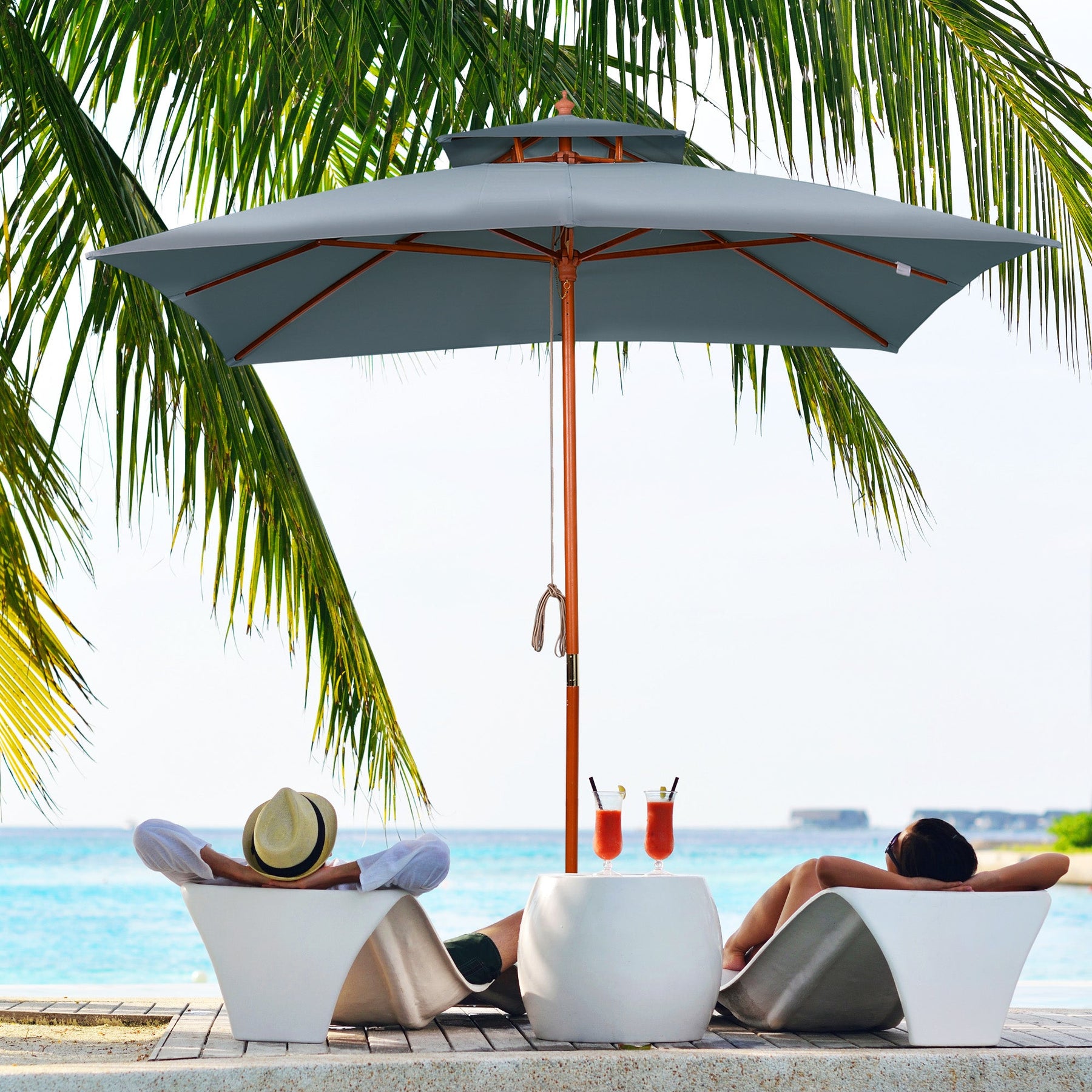 Enhance your outdoor space with this elegant 10x10ft double-tier patio umbrella, crafted with a bamboo and poplar frame in a stylish pagoda design. The eight sturdy bamboo ribs provide strong support for the water-resistant, anti-UV polyester canopy, ensuring reliable shade and protection from the sun’s harmful rays and light rain. The ventilated double-tier design allows for excellent air circulation, keeping you cool while adding a touch of sophistication to your garden, backyard, or patio. The convenient pull rope with a double-pulley system makes opening and closing the umbrella effortless. Whether you're relaxing by the pool or enjoying a meal outdoors, this premium deck umbrella offers the perfect blend of function and elegance.