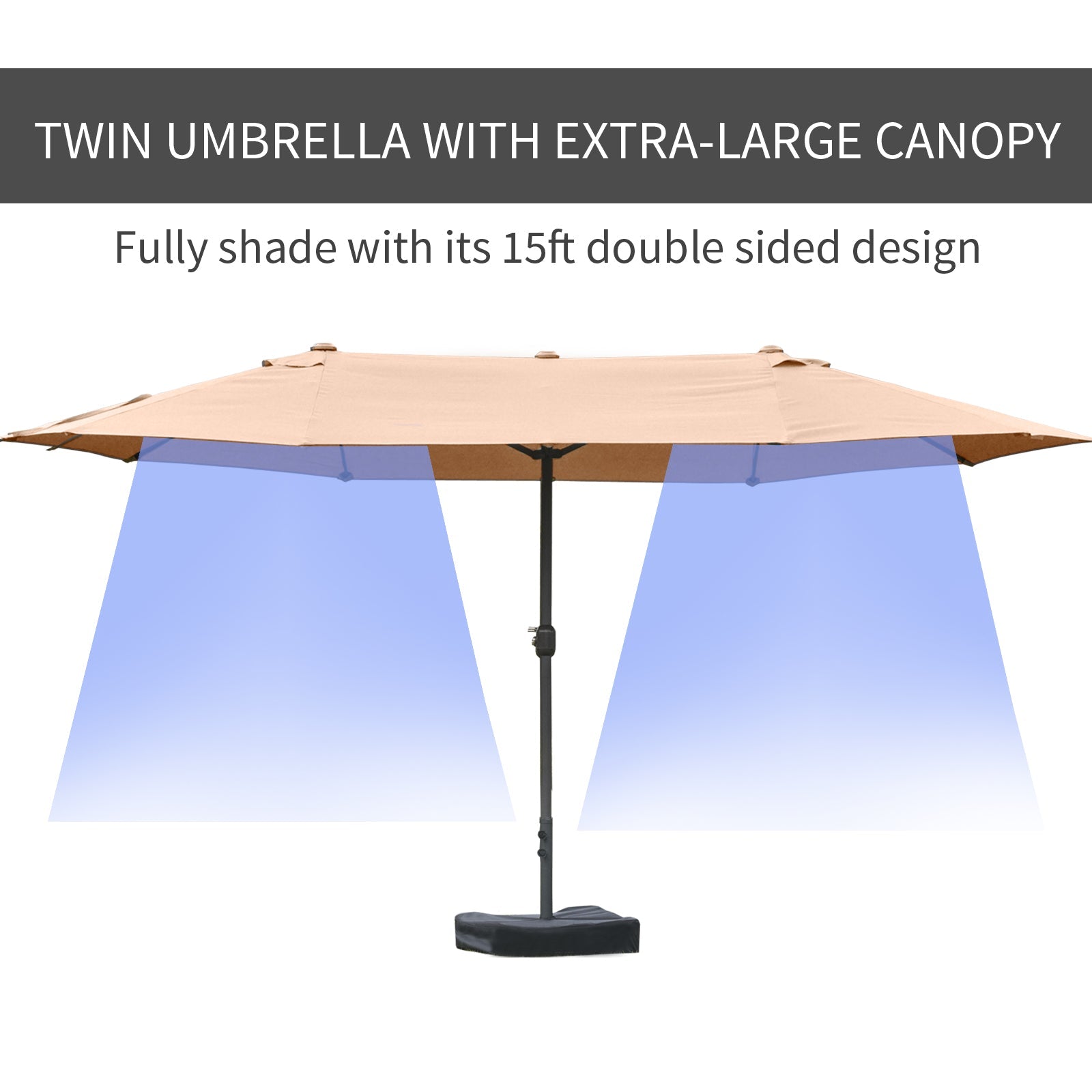 Enhance your outdoor experience with the Outsunny 15-foot Twin Umbrella, designed to provide expansive shade and superior protection for your outdoor spaces. This extra-large, double-sided umbrella features two 8.7-foot diameter canopies, perfect for patios, gardens, beaches, pools, parks, and backyards. The umbrella is supported by a rust-resistant steel pole and reinforced with 12 steel ribs, ensuring long-lasting durability and strength. The high-quality 180gsm polyester fabric allows air to flow through, keeping the area beneath cool and comfortable. The easy-to-use crank mechanism makes opening and adjusting the umbrella a breeze. Cross base and sandbags are included for added stability. Note that this umbrella should not be used during extreme weather conditions such as strong winds, heavy rain, or snow.