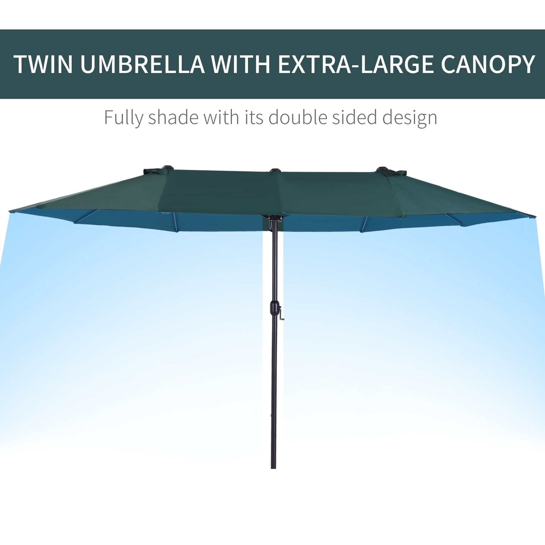 The Outsunny 15-foot Twin Umbrella offers expansive shade and protection with its extra-large double-sided design, featuring two 8.7-foot diameter canopies. This outdoor umbrella is perfect for parks, gardens, patios, backyards, beaches, and pools, providing complete shade for your outdoor gatherings. It is supported by a rust-resistant steel pole and 12 durable steel ribs, ensuring longevity and stability. The high-quality 180gsm polyester canopy allows air to flow through, creating a cool, comfortable atmosphere underneath. The umbrella features a smooth crank mechanism for easy opening and adjustment. Note: The stand is not included, and the umbrella should not be used during extreme weather conditions (strong wind, heavy rain, or snow).