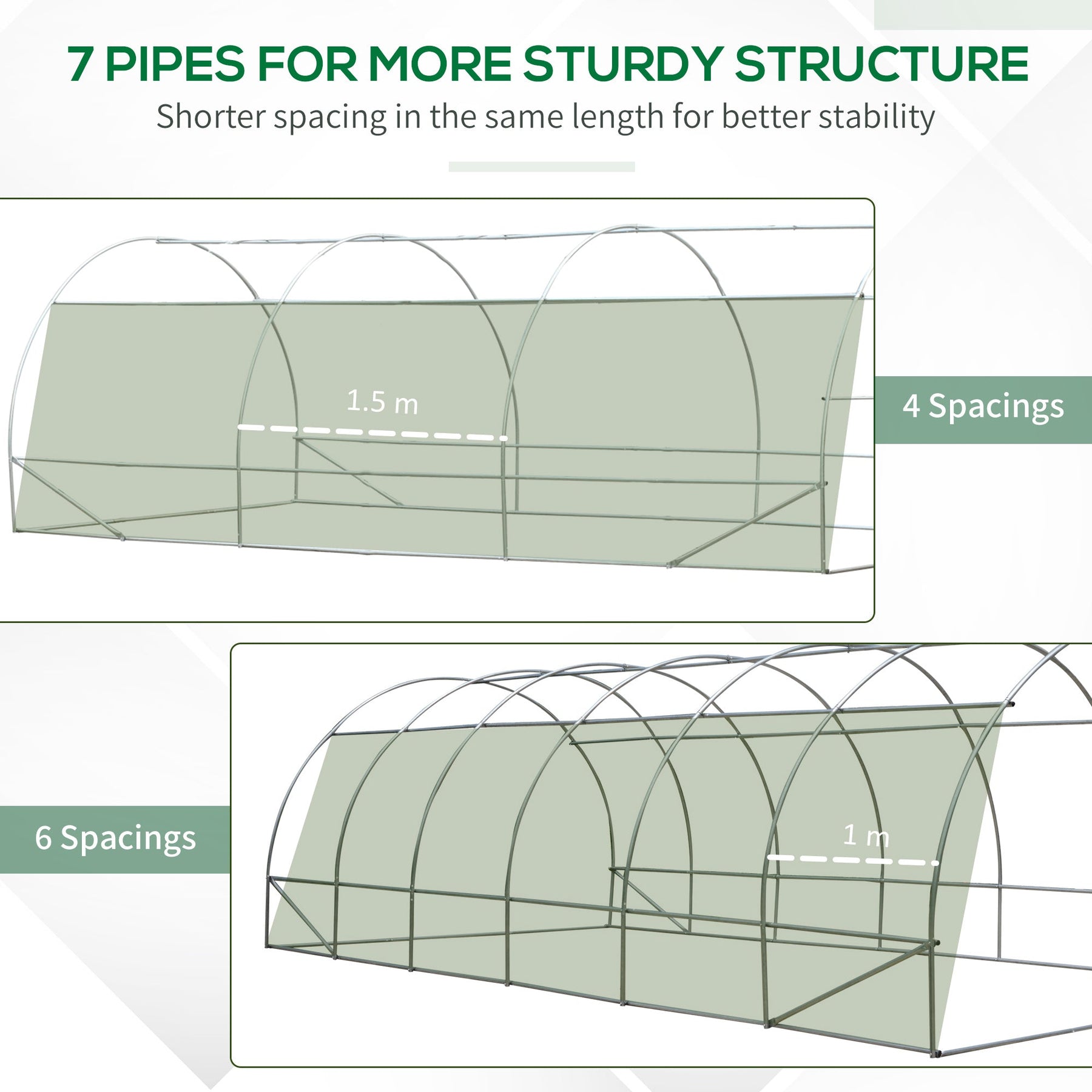 Maximize your gardening potential with this large walk-in greenhouse, designed to extend your growing season by protecting your plants from cold weather and pests. This spacious greenhouse is ideal for growing a variety of plants, including tropical plants, vegetables, fruits, and flowers. The fully enclosed, waterproof, and UV-resistant PE cover helps maintain the ideal humidity levels for your plants while allowing nourishing sunlight to pass through. The cover features 6-inch extended edges that should be deeply buried in the soil for enhanced stability and to prevent rainwater accumulation. The zippered roll-up door offers easy access for transporting plants or tools, while 12 roll-up mesh windows provide excellent ventilation and can also be used for observing plant growth. Built with a sturdy galvanized steel frame, this outdoor greenhouse includes 4 wind ropes that should be tightened and secured to the ground with ground nails to ensure stability in windy conditions. With its spacious design and durable structure, this greenhouse is a perfect addition to any garden, offering ample room for all your plants.