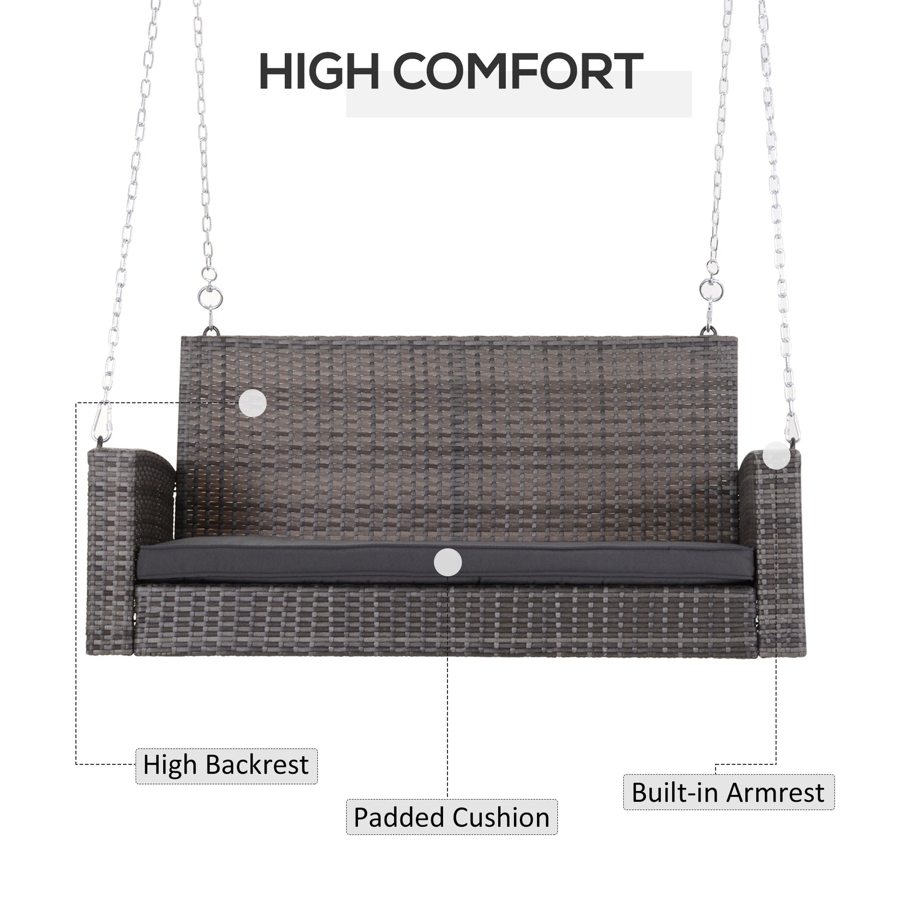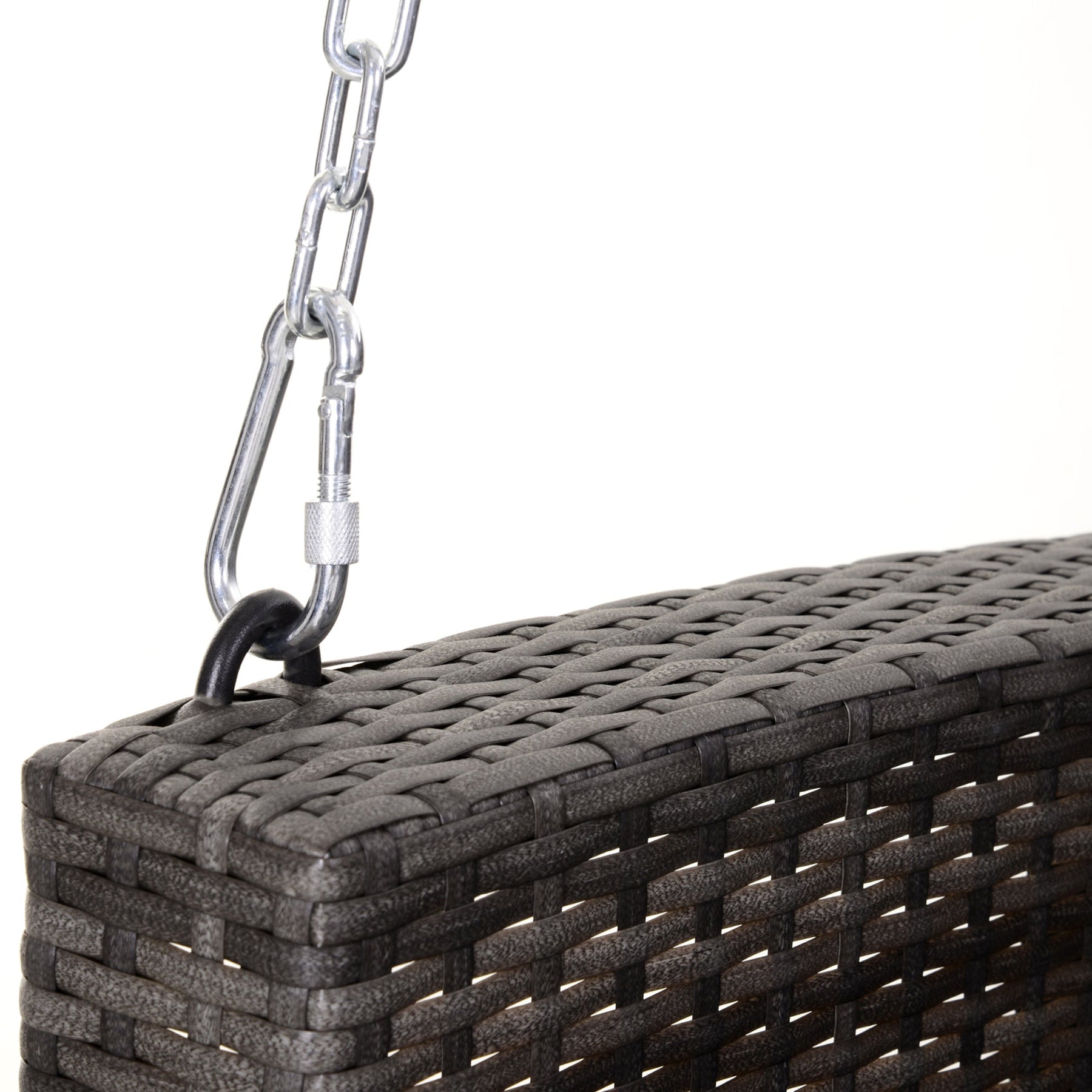 Elevate your outdoor living space with this stylish and comfortable 2-person wicker patio swing chair. With its timeless design, this hanging swing serves as a beautiful focal point for your backyard, patio, or porch. Crafted with weather-resistant PE rattan wrapped over a galvanized steel frame, it offers long-lasting durability and a lightweight structure perfect for outdoor use in any season. The dual-seat design provides ample room for two people to relax, swing, and enjoy each other’s company in comfort. Curved armrests, a high-backrest, and a padded seat cushion with a removable cover ensure an enjoyable and cozy seating experience. This porch swing includes two hanging chains and four catches, offering a solid and secure setup that can support up to 550 lbs. Whether you're enjoying a quiet morning coffee or lounging on a sunny afternoon, this swing chair is the perfect outdoor retreat.