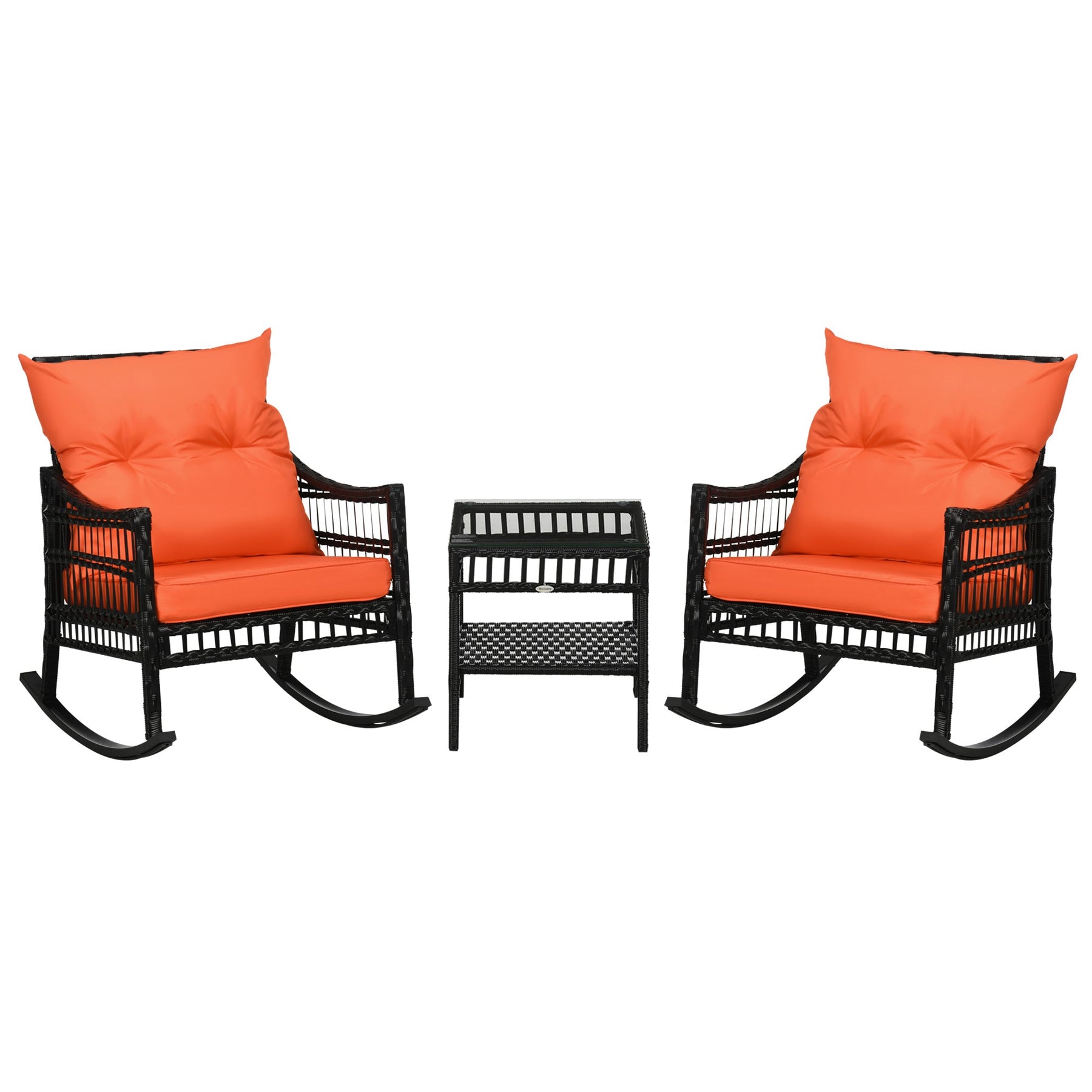 Relax in style with this 3-Piece Outdoor Rocking Chair Set, featuring two comfortable rocking chairs and a stylish matching coffee table. This set is perfect for your patio, deck, poolside, porch, or garden, providing a cozy and functional space for socializing or unwinding. The coffee table is designed with a tempered glass top and features convenient under-table storage, offering both elegance and practicality. With its handwoven PE rattan construction and weather-resistant galvanized steel frame, this set is built to last, ensuring both durability and a refined, sophisticated look. Designed with comfort in mind, the wicker rocking chairs have deep cushions, curved backs, and rocker legs, ideal for relaxing in the great outdoors.
