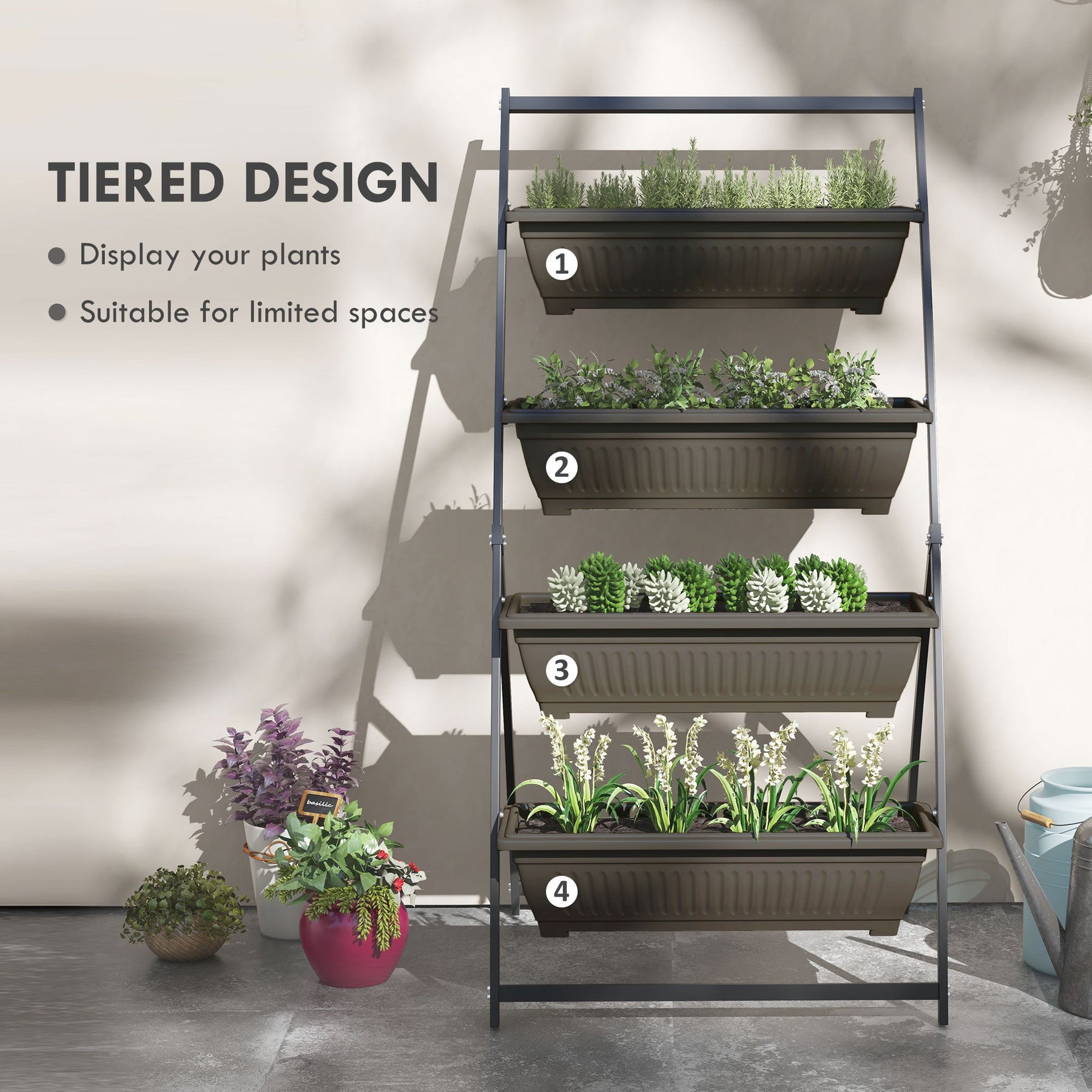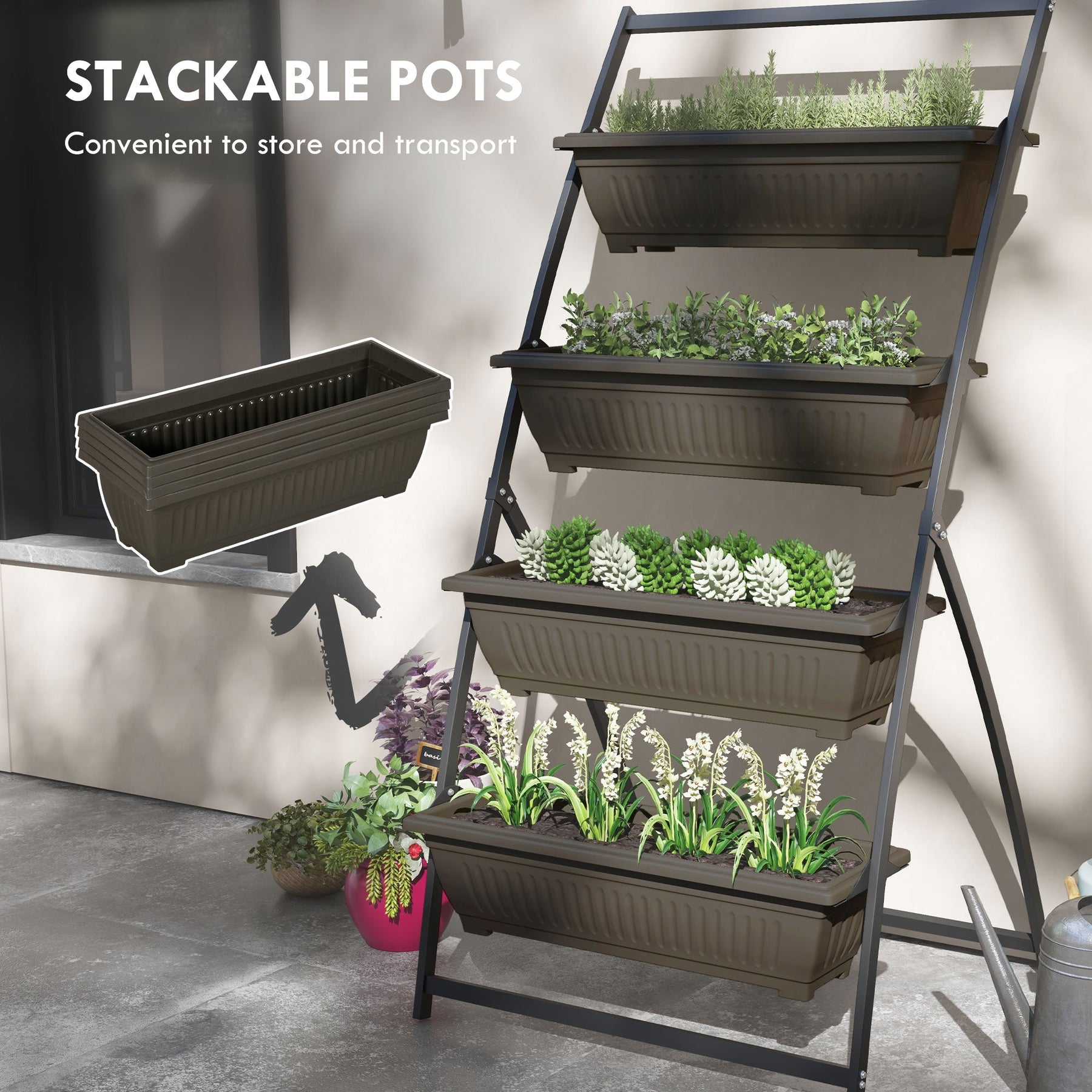 Create a vibrant garden in any space with this four-tier elevated garden bed, perfect for growing vegetables, flowers, and herbs in small areas like balconies, verandas, and terraces. The design offers an elevated height that makes gardening more accessible for seniors or anyone who prefers to avoid bending down while tending to their plants. Each pot is equipped with four drainage holes, ensuring proper water flow and promoting healthy plant growth. Made with a sturdy powder-coated steel frame and durable plastic pots, this planter is suitable for both indoor and outdoor use. Its stackable design allows for easy storage when not in use, making it a practical and space-saving gardening solution.
