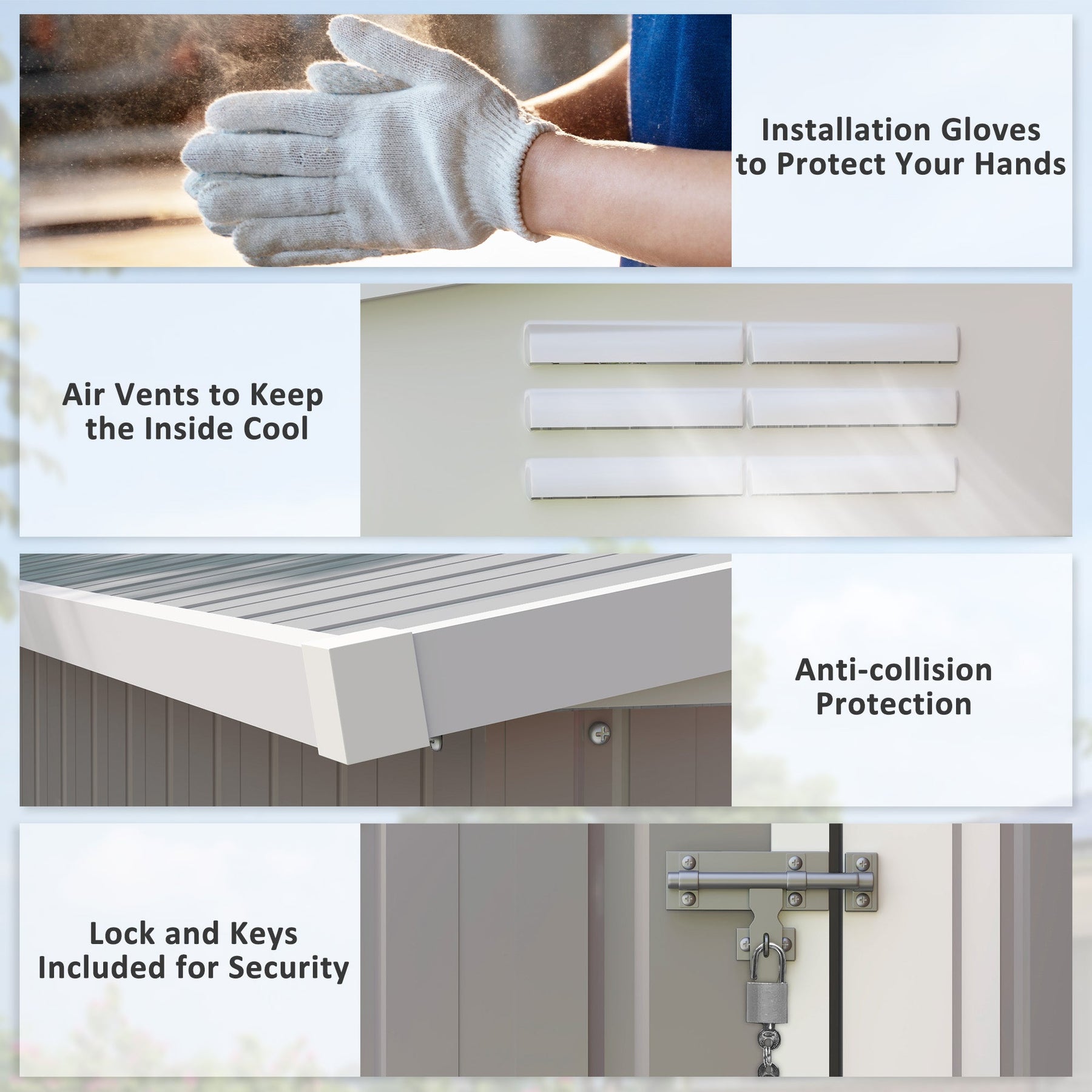 Maximize your outdoor organization with this highly versatile outdoor storage shed, ideal for storing everything from lawnmowers and bicycles to gardening tools and patio equipment. Designed with a practical lean-to-wall structure, this metal shed fits neatly into any backyard corner, helping you save space without sacrificing storage capacity. Crafted from rugged steel panels, it offers reliable protection from sun, rain, and other outdoor elements, ensuring your tools and gear stay safe and dry year-round. For added peace of mind, the shed is lockable (lock included), providing a secure space for your valuables. Built-in front and rear air vents promote excellent ventilation, maintaining a fresh and cool interior even on warm days. With generous dimensions and a thoughtful layout, this garden storage shed is both functional and durable. It also comes with gloves to protect your hands during assembly, making setup safe and straightforward.