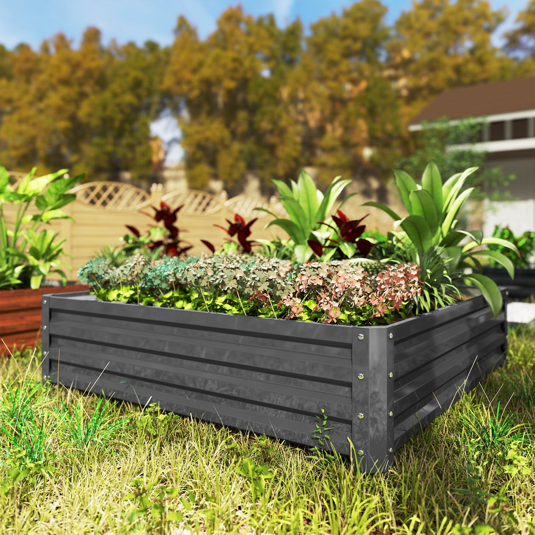 Create a thriving garden anywhere with this galvanized steel raised garden bed, offering generous space for growing fresh vegetables, herbs, flowers, and fruits. Designed with an open-bottom structure, this raised planter allows plant roots to extend deeply into the ground for healthier, more natural growth and improved drainage. Built to last, the powder-coated galvanized steel frame is resistant to water and rust, making it ideal for outdoor environments and year-round use. The planter includes four sturdy panels and connectors, making assembly quick and easy so you can spend less time building and more time planting. With an overall dimension of 47.2" L x 47.2" W x 11.8" H (120 x 120 x 30 cm), and each panel measuring 44.5" L x 11.8" W (113 x 30 cm), this raised garden bed is perfect for any patio, backyard, or garden space. Whether you're a seasoned gardener or just starting out, this raised flower bed provides a reliable and stylish foundation for your growing needs. Assembly is required.