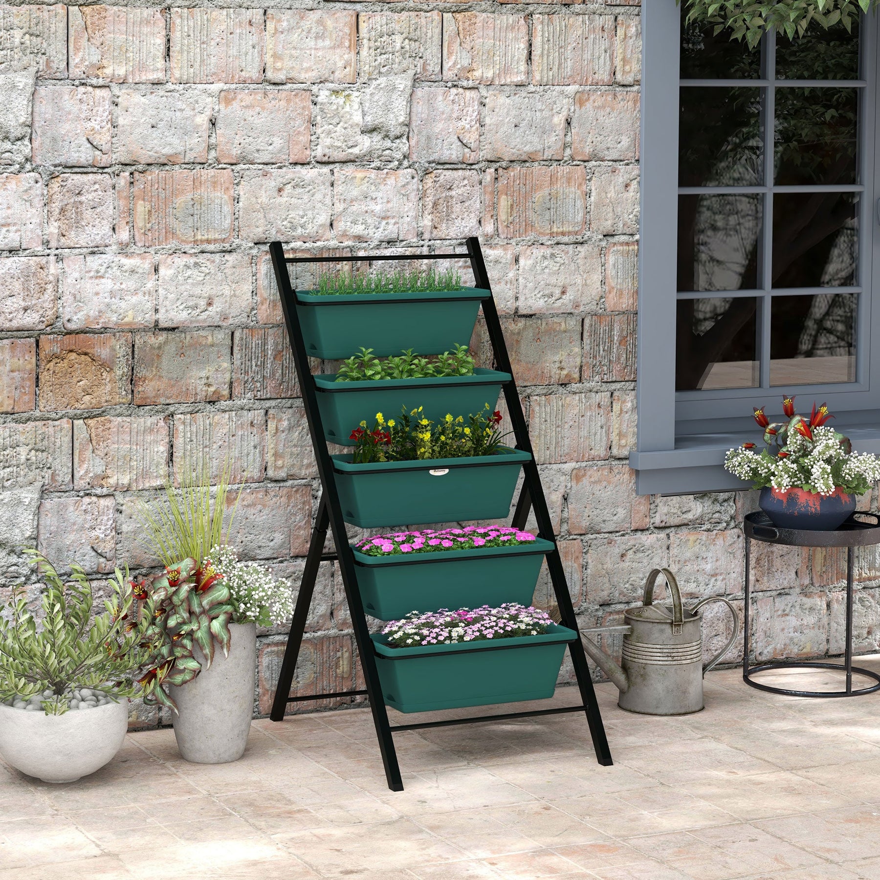 Maximize your gardening potential even in limited spaces with this five-tier elevated garden bed. Perfect for balconies, verandas, terraces, and more, this vertical garden provides ample space to display your plants, flowers, or vegetables. Its thoughtful height design makes it ideal for seniors and anyone who prefers gardening without the discomfort of bending over. Each of the five detachable pots comes with a drainage hole at the bottom, allowing for proper water flow and helping to prevent root rot. The sturdy powder-coated steel frame combined with the durable plastic pots ensures this planter is stable and suitable for both indoor and outdoor use. The detachable pots make it easy to store when not in use, saving you space and making seasonal gardening a breeze.