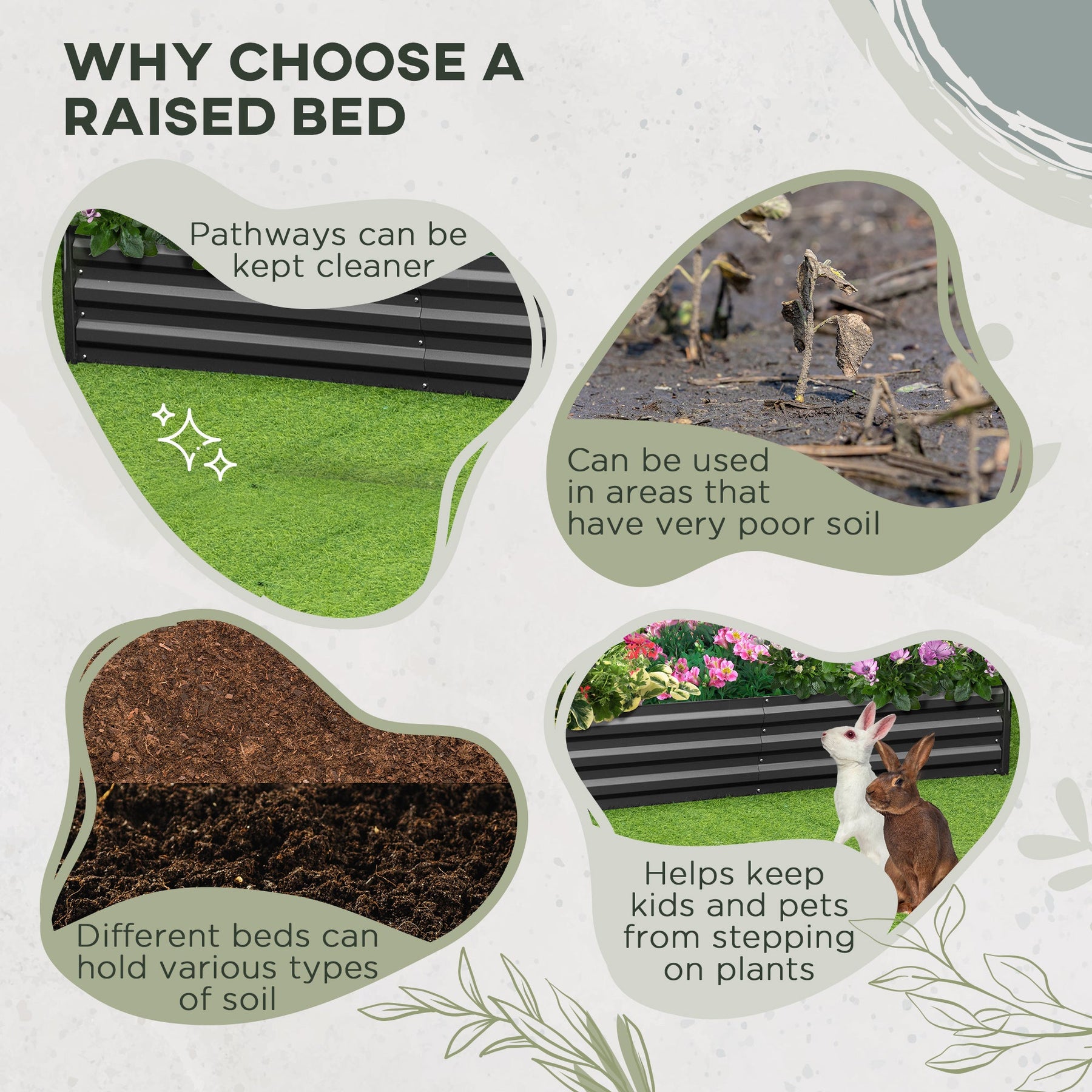 Transform your outdoor space into a thriving garden with this galvanized raised garden bed featuring two adjustable tomato cages. Perfect for patios, condos, or backyards, this elevated planter allows you to cultivate plants without worrying about weeds, waterlogging, or wildlife interference. Its galvanized and powder-coated steel construction ensures long-term durability, resisting rust, rain, and harsh weather conditions. Reinforced with metal rods, this garden bed provides sturdy support for your gardening projects. The open-bottom design promotes natural drainage, preventing water accumulation and encouraging deep root growth for healthier plants. The included two tomato cages offer customizable support for climbing plants like tomatoes, grapes, and vines, helping prevent breakage while maximizing growth. Easy to install and versatile, this raised garden bed is ideal for creating a flourishing green space in small or urban settings.
