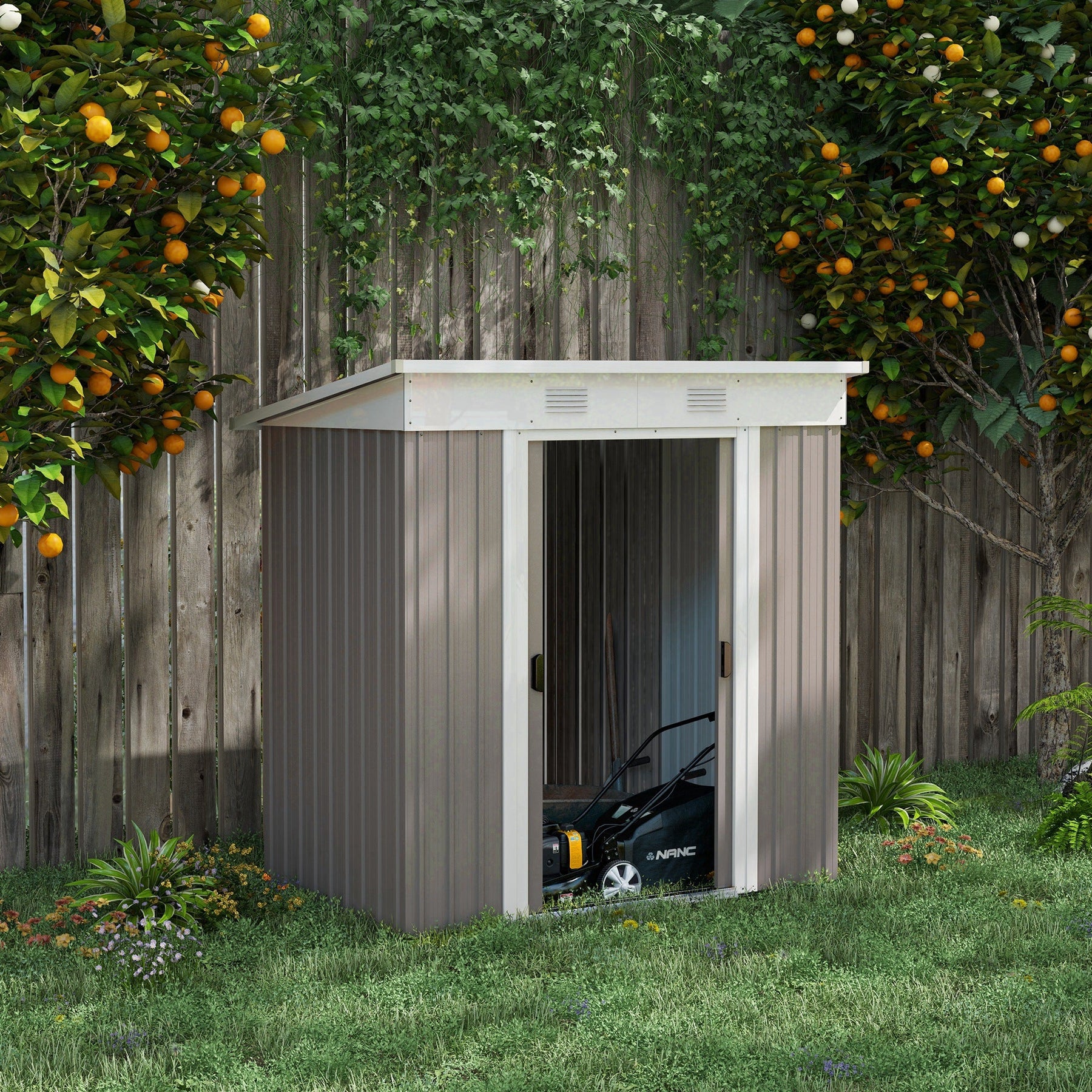 Keep your outdoor space neat and clutter-free with this spacious outdoor storage shed, designed to store garden tools, lawn care equipment, and pool supplies safely. Crafted with durable steel panels on the roof and walls, this shed features a protective film that shields your belongings from sunlight and rain, ensuring long-lasting performance. The structure is well-ventilated, with two built-in vents to maintain a cool and airy interior. A sloped roof provides additional storage capacity while preventing rainwater buildup. The double sliding doors are both space-saving and lockable, offering convenient access while keeping your items secure. Designed for durability and practicality, this metal storage shed is a great addition to any backyard, patio, or garden space. Assembly is required, and the foundation is not included.