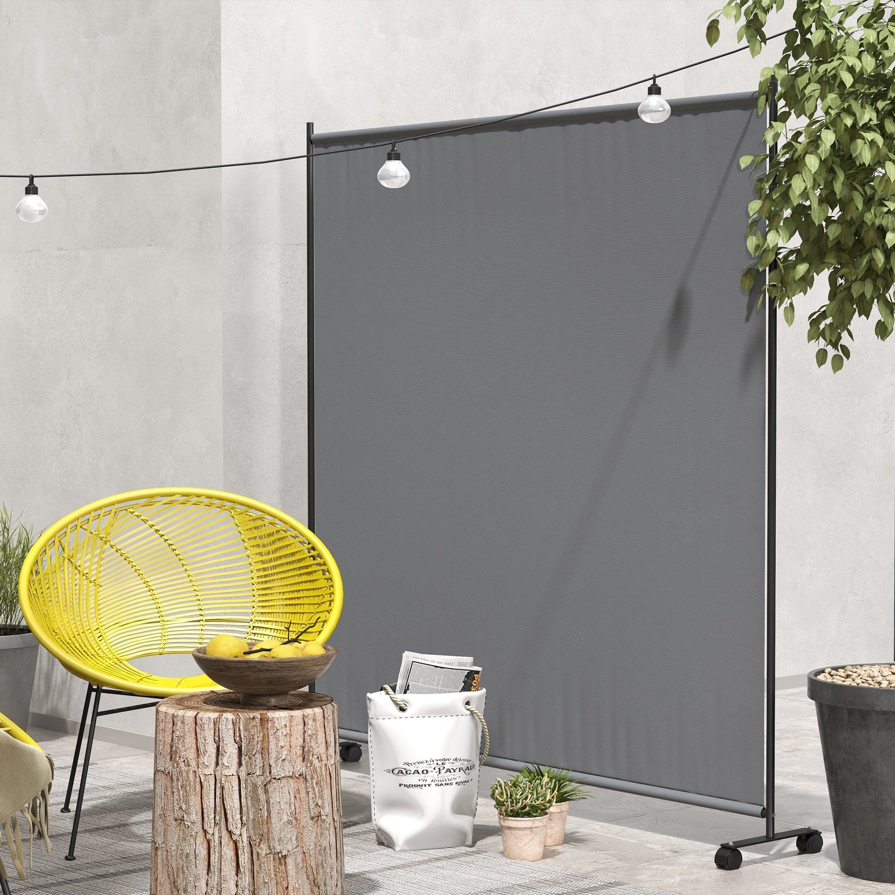 Enhance your living or outdoor space with this practical and multifunctional room divider, designed to provide instant privacy and style wherever you need it. Ideal for creating separate areas in large rooms or sectioning off outdoor patios, this divider also acts as an effective sunshade to block harsh rays during late afternoons. Its flexible design features smooth-rolling wheels that allow you to effortlessly move and position the divider, while integrated brakes ensure it stays securely in place once set. Crafted from a durable metal frame with a rust-resistant powder-coated finish and covered in 180gsm polyester fabric, the screen offers excellent privacy with its opaque, non-see-through material. The elevated base promotes airflow and reduces wind pressure, adding to the structure's overall stability and wind resistance. Measuring 72" L x 11.8" W x 71.3" H (183 x 30 x 181 cm), this versatile divider is quick to assemble and easy to use. Whether indoors or outdoors, it offers a sleek solution to your privacy and shading needs.