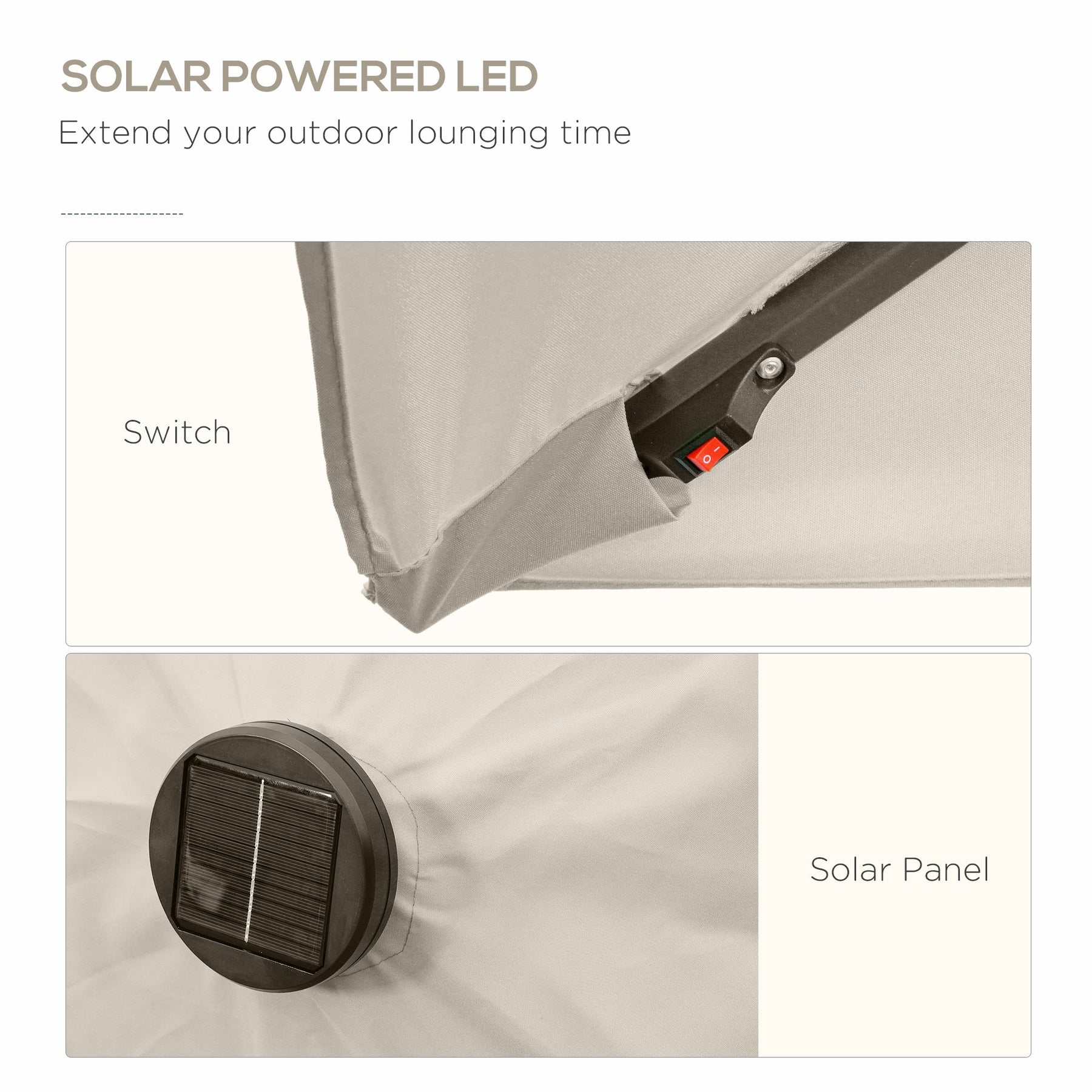 Enjoy the outdoors in comfort with our stylish and functional patio umbrella. Perfect for shading you from the harsh sun, this umbrella allows you to relax, dine, or socialize without worrying about sunburn or harmful UV rays. In addition to offering sun protection, the umbrella features energy-efficient, solar-powered LED lights, making it a great sustainable solution for lighting up your outdoor gatherings in the evening. The built-in solar panels store sunlight in rechargeable batteries, so you can extend your outdoor fun into the night without the need for extra power sources. The umbrella is easy to operate with a convenient hand crank, allowing you to tilt the canopy to your desired angle, ensuring optimal shade throughout the day. Designed for durability, the vented canopy provides wind stability, and the powder-coated metal frame with six ribs and 180 gsm polyester fabric ensures long-lasting outdoor use. Whether you're hosting a backyard BBQ or enjoying a quiet afternoon, this umbrella is a reliable addition to any outdoor space. Note: The umbrella requires a base weight of 110lbs (50kg), which is not included, and should not be used during extreme weather conditions like heavy winds, rain, or snow.
