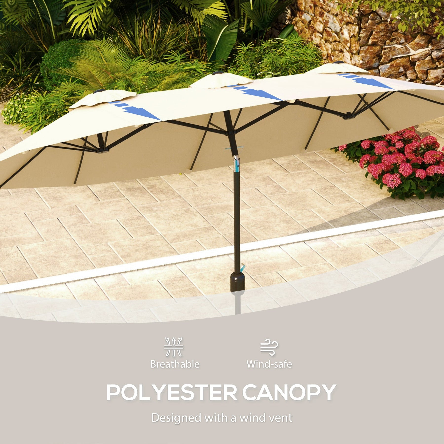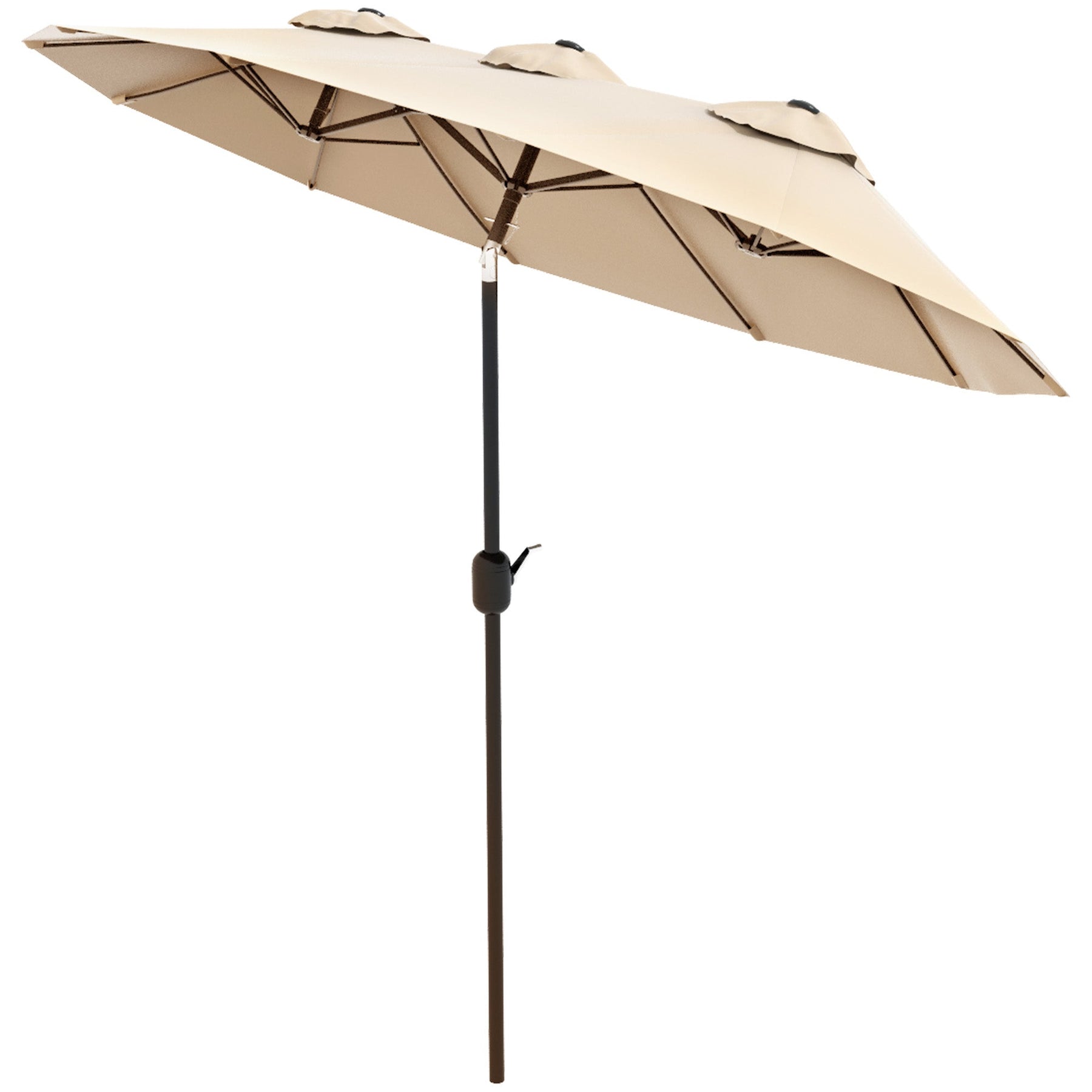 This double-sided patio umbrella is an excellent addition to your outdoor space, providing expansive shade with its 9.7ft dual canopy. Perfect for families or gatherings with friends, it creates a relaxing and comfortable area for your furniture set. The umbrella features a 45° tiltable design, allowing you to easily adjust the angle to suit your preferred sun coverage. Opening and closing the umbrella is simple with the included hand crank, while a convenient latch secures it in place when not in use. Crafted with stability in mind, the umbrella is equipped with three top vents to enhance wind resistance. The durable 180 GSM polyester fabric and steel frame with twelve ribs make this umbrella ideal for reliable outdoor use, withstanding different weather conditions. The overall dimensions of the umbrella are 116.1" L x 59.8" W x 87.4" H (295 x 152 x 222 cm), and it requires a 66 lbs. (30 kg) base (not included) for secure positioning. Please note, the umbrella should not be used during extreme weather such as strong winds, heavy rain, or snow.