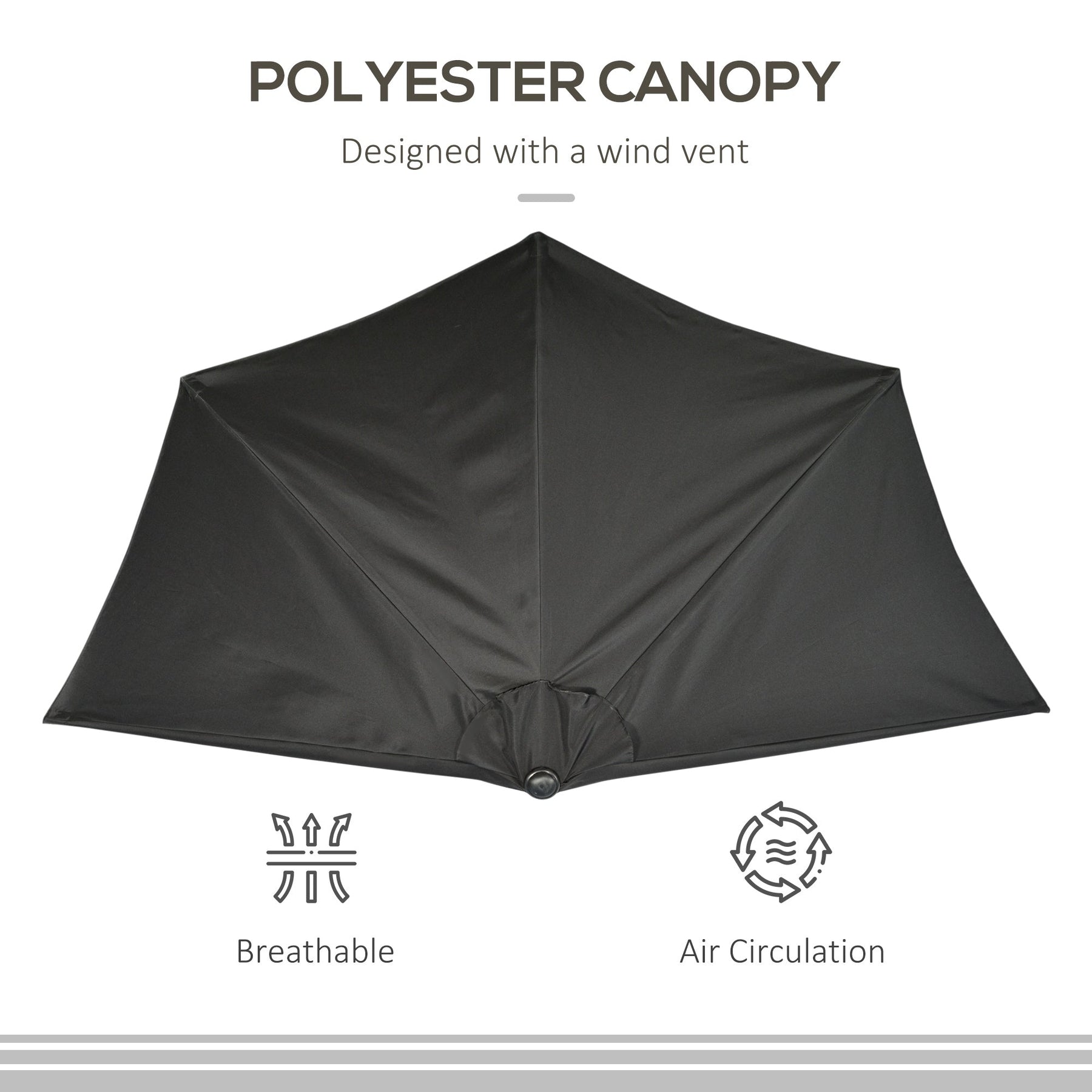 Enhance your outdoor space with this stylish and practical half-round patio parasol. Featuring a solid metal frame with five ribs for reliable support, this parasol is equipped with a UV-resistant polyester canopy, ensuring you stay shaded and protected from the sun. The easy-to-use crank mechanism allows you to open and close the umbrella effortlessly with just a simple turn of the handle. The top vent design promotes air circulation, reducing the risk of the umbrella being overturned by wind, while providing a cool breeze. Its half-round design is perfect for placement against a wall, making it ideal for balconies, patios, and other outdoor areas. Note: This parasol does not include a base and is designed to be used against a wall for optimal stability.