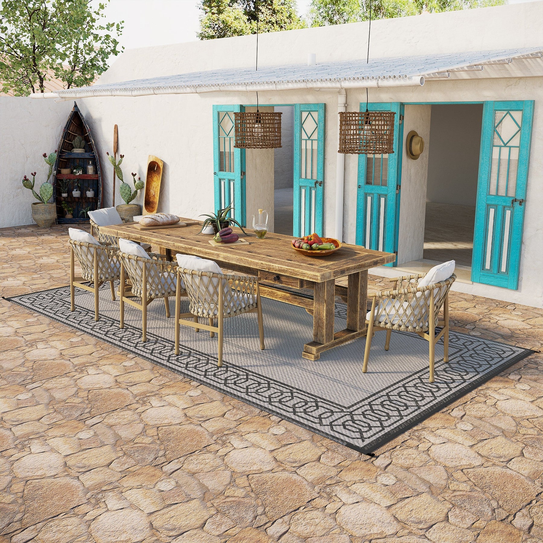 Experience the convenience and versatility of this reversible camping rug, designed to enhance your outdoor adventures. With a double-sided design, this rug offers the flexibility to switch to the other side if one side gets dirty and cleaning is inconvenient, ensuring continued use without hassle. Crafted from 100% polypropylene, it is built for durability and longevity, with a sun protection treatment that helps prevent fading and other sun-related damage. The rug is lightweight and easy to fold into a compact size, and it comes with a complimentary carry bag, making it perfect for RV road trips, camping, picnics, beach outings, or simply relaxing in your garden. Equipped with four corner straps, this rug can be secured using ground stakes or small poles to prevent it from being displaced by wind. Maintenance is easy—simply rinse with water, sweep, or wipe with a damp cloth, and let it air dry. Measuring 9' x 18' (274 x 548 cm), this rug provides ample space for a variety of outdoor activities. Please note, it is not fireproof, so keep it away from open flames, embers, and ashes.