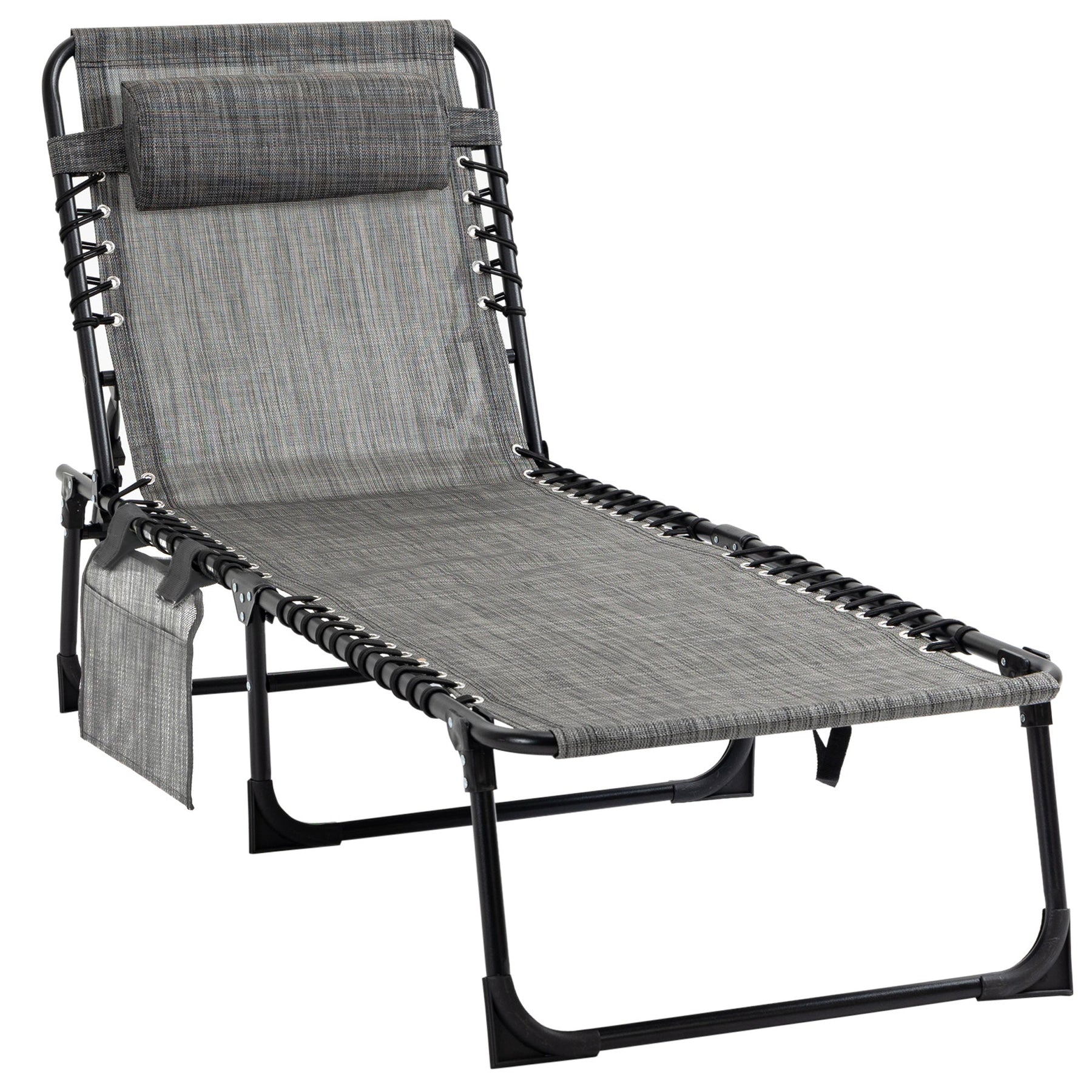 Relax in style with this versatile folding beach lounge chair, designed for ultimate comfort and convenience. Perfect for the patio, poolside, or deck, it features a foldable design for easy transport and compact storage when not in use. The adjustable backrest offers 5 different levels, allowing you to customize your lounging experience and find the perfect relaxation angle. A side pocket is included for convenient storage of magazines, books, or your phone, while the padded headrest adds extra comfort and serves as lumbar support. Made with breathable mesh fabric, this chair keeps you cool even on the hottest days, and the elastic cords conform to your body for optimal comfort. The durable steel frame supports up to 264 lbs. (120 kg) and features non-slip footpads for added stability, making this lounge chair a reliable and comfortable choice for your outdoor relaxation.