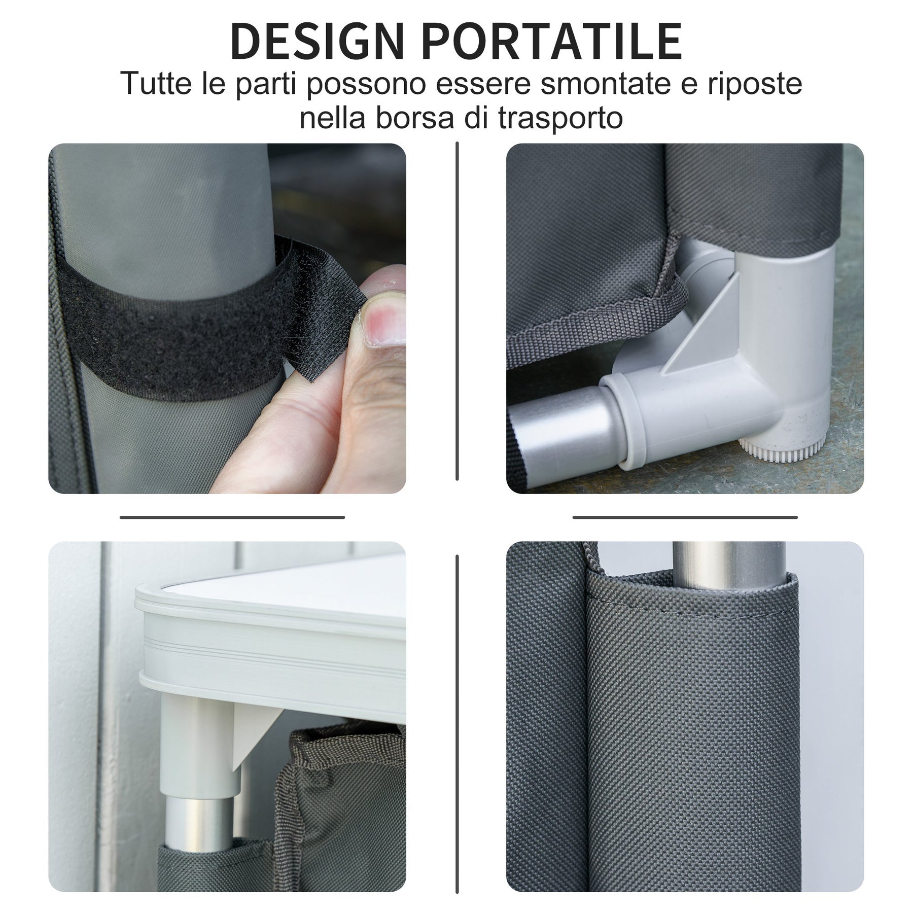 The perfect addition to your camping gear, this versatile camping table with storage offers both a sturdy surface for meal preparation and convenient storage space. Beneath the tabletop, you'll find two spacious 600D Oxford fabric storage compartments with a door, ideal for keeping your outdoor kitchen items, food, and utensils neatly organized and protected. Side storage pockets provide additional room for quick access to smaller items. This camping organizer is easy to set up and break down, making it ideal for camping trips, picnics, or even as an extra storage solution at home. The lightweight yet durable aluminium frame ensures long-lasting performance, while adjustable feet keep the table stable and level. Portable and easy to transport, this camping kitchen table comes with its own carry bag for hassle-free storage and mobility.