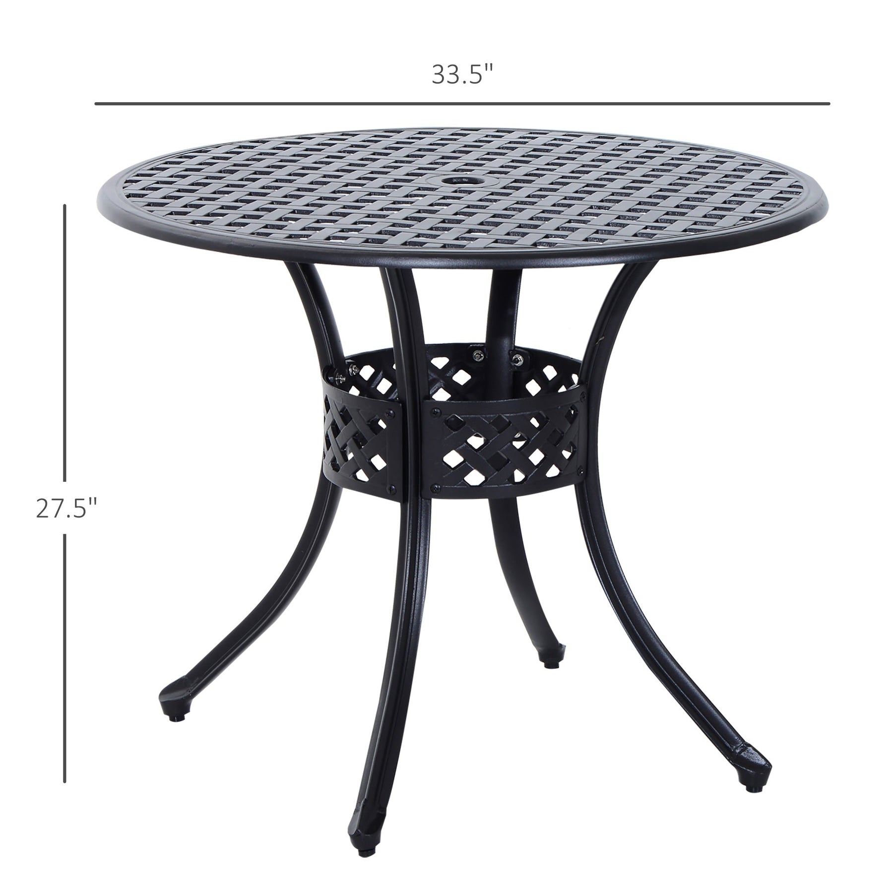 Enjoy outdoor dining in style with this classic black metal patio table. The traditional design complements any outdoor decor, and when paired with matching Outsunny patio chairs, it can create a personalized dining set that suits your taste. Constructed from solid, rust-resistant cast aluminum, this durable table is built to last, providing years of reliable use. The table includes a central umbrella hole, allowing you to add your favorite patio umbrella and stay cool while enjoying your meals, snacks, or beverages. Maintenance is a breeze—simply clean the table with soap and water to keep it looking pristine for seasons to come.