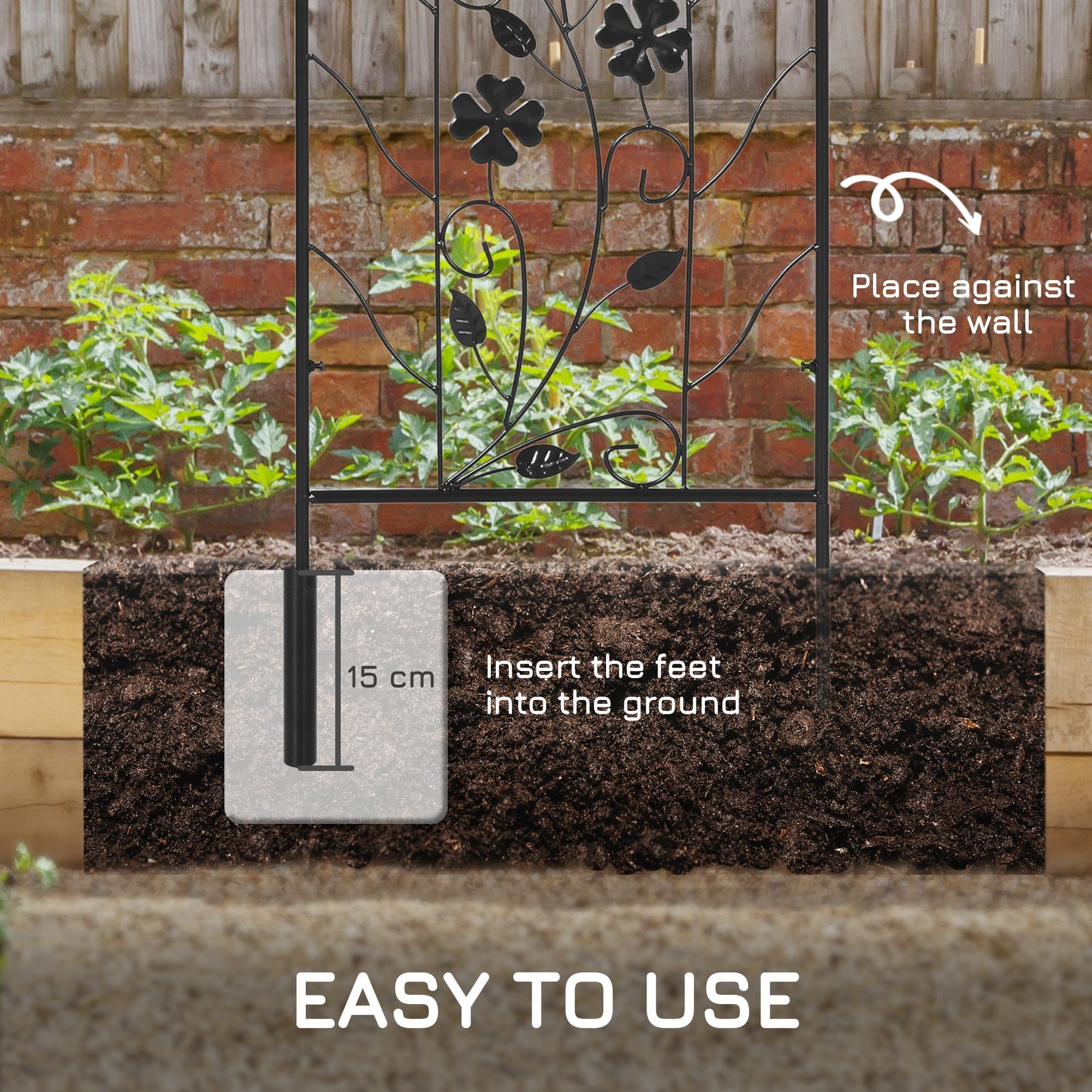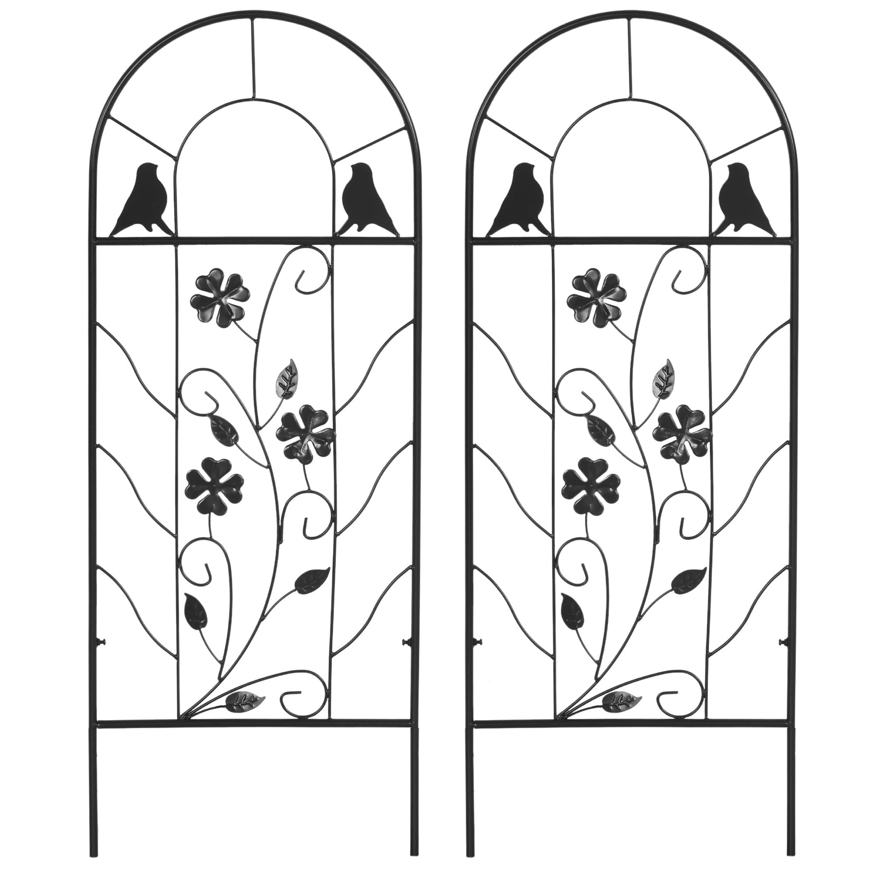 Enhance your garden with this Pack of 2 Trellis, designed to provide optimal space and support for your plants and vines. These trellises help keep your plants organized, preventing tangling and promoting healthy growth. With ground inserts at the bottom, they can be securely placed deep into the soil, ensuring stability even in windy conditions. These versatile trellises can be grouped together to create a striking garden fence or used individually to add privacy and charm to your outdoor space. Made from a durable, powder-coated metal frame, they resist rust and are perfect for daily outdoor use.