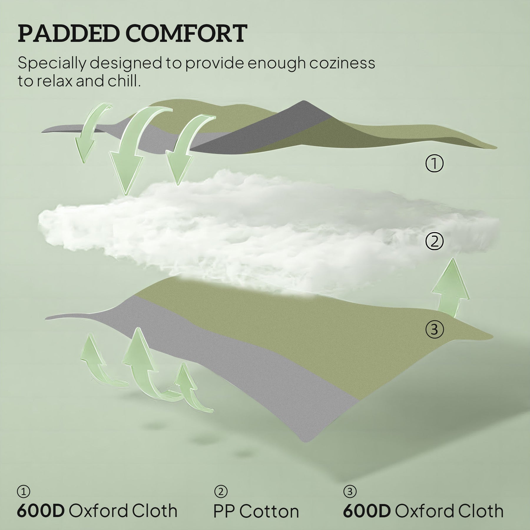 • Padded High Back: 27.6" high back and curved armrests provide maximum comfort, with breathable 600D Oxford fabric and soft PP cotton filling for a cozy outdoor experience.