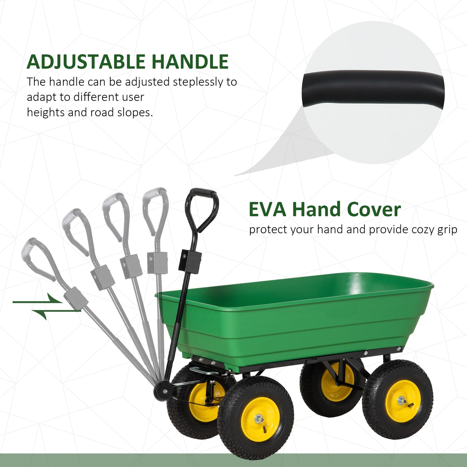 The Garden Cart with a 125L capacity is designed for transporting large amounts of earth, mulch, plants, peat, and garden tools. Perfect for tackling big gardening projects, it offers a tipping function that allows you to unload items conveniently, reducing labor and increasing efficiency. The adjustable handlebar with a soft EVA cover provides a comfortable grip for easy maneuvering. Equipped with 4 durable wheels, this cart is highly mobile and can easily navigate various outdoor terrains. Constructed with a powder-coated steel frame and a PP tub, this garden cart is built for outdoor durability and long-lasting use. Ideal for homeowners and gardeners who need reliable and efficient transport for large loads, this cart helps make gardening tasks easier and more convenient.