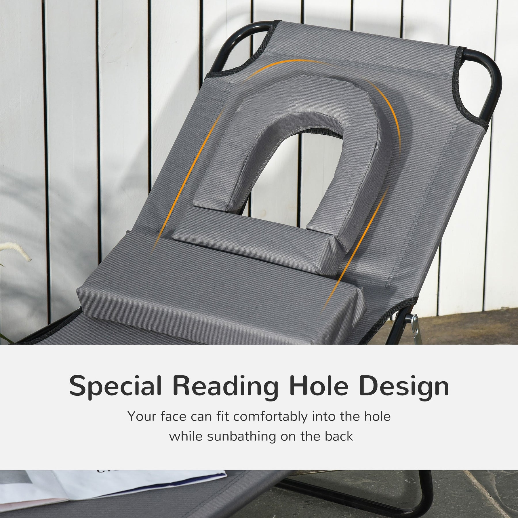 Relax and enjoy the outdoors with this comfortable and stylish outdoor chaise lounge chair, perfect for various outdoor spaces like parks, gardens, patios, poolside areas, conservatories, and beaches. This lounge chair is designed with a strong powder-coated steel frame that resists peeling and corrosion, ensuring long-lasting use. The UV- and water-resistant Oxford fabric is durable, easy to clean, and designed to withstand wear and tear. For added comfort, the chaise lounge includes a padded headrest, a 4-level adjustable backrest, and a soft support pillow. The innovative reading hole at the head of the chair lets you place your books on the ground, keeping your hands free while you relax. The folding design allows for easy storage and transport, making it a convenient choice for any outdoor setting.