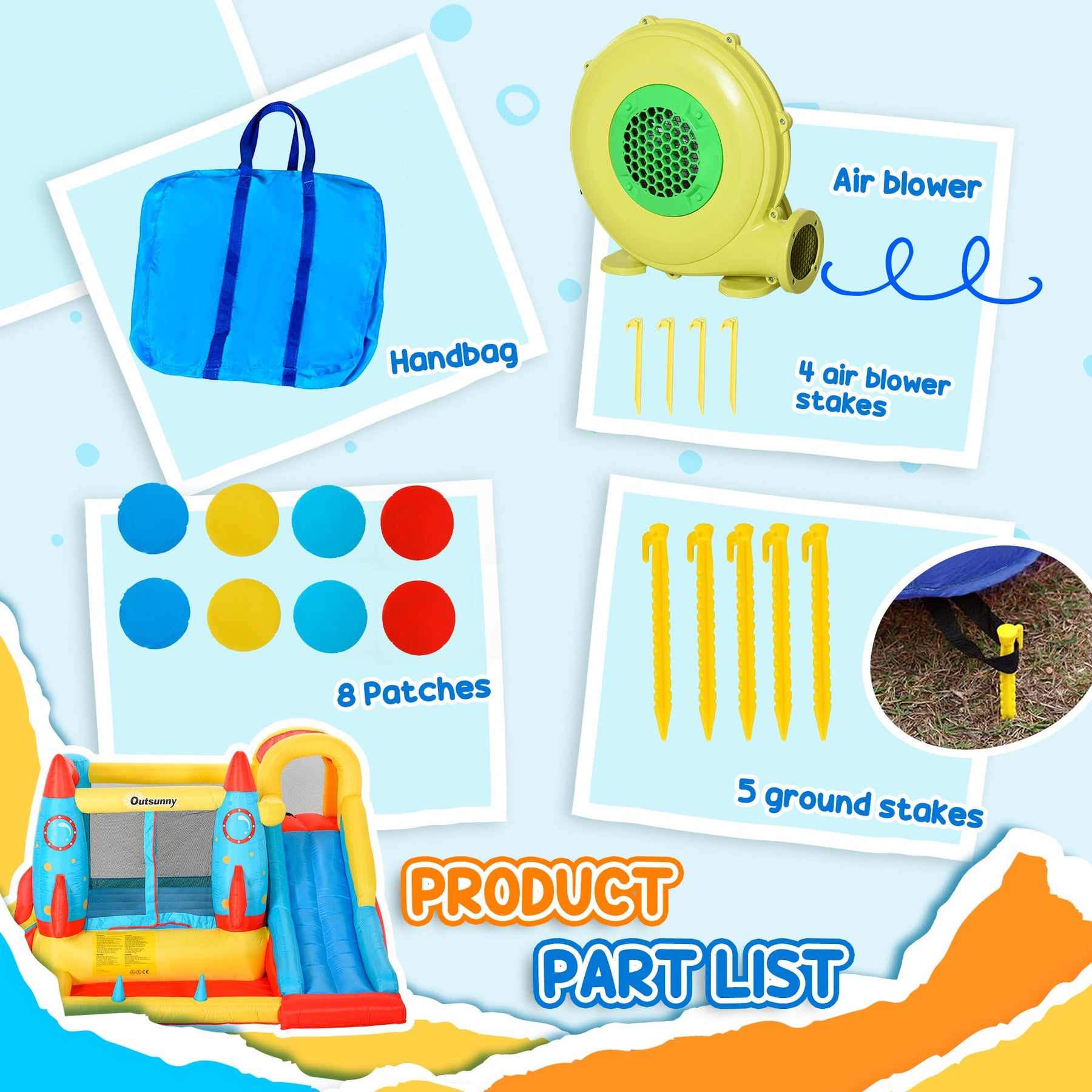Let your kids jump, slide, and play for hours with this Rocket-Themed Inflatable Bounce House. Designed for quick and easy setup, the included high-quality electric air blower inflates the entire castle in just 2 minutes, allowing your children to start having fun in no time. Safety is a top priority with 9 ground stakes for added stability and water-resistant oxford fabric with a high density of 840D used on the jumping and sliding areas. This inflatable castle can safely accommodate up to four children aged 3 to 8, with a weight capacity of 264 lbs (no more than 66 lbs per child). The versatile design features a trampoline, two slides, a climbing wall, and a pool for a variety of exciting activities. It's the perfect way to keep your kids entertained, burn off energy, and reduce screen time. Plus, it’s easy to set up and comes with a convenient handbag for easy carrying and two color-matching patches in case of accidents.