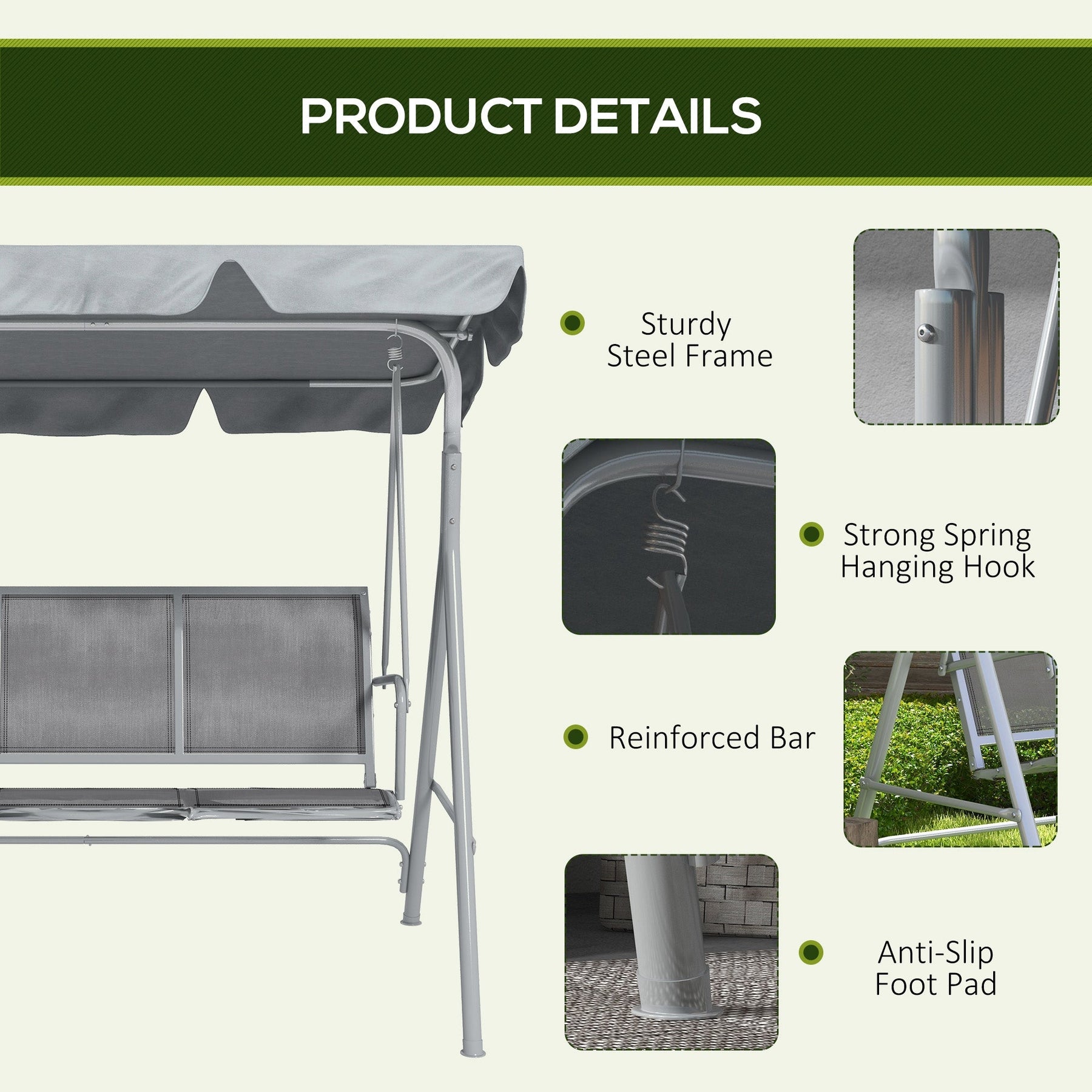 Create a serene retreat in your own backyard with this stylish 3-Person Patio Swing Chair. Designed for ultimate outdoor relaxation, this versatile swing serves as a garden swing, porch swing, lawn swing, or deck swing, providing a cozy spot to unwind solo or with company. The durable, powder-coated steel frame in a sleek black finish ensures lasting stability and rust resistance, supporting up to 528 lbs. Its adjustable weather-resistant canopy offers optimal shade and protection from UV rays, so you can lounge comfortably even on sunny days. The breathable sling fabric promotes airflow, keeping you cool and comfortable by preventing heat and sweat build-up. Whether you're sipping your morning coffee or watching the sunset, this metal swing chair combines comfort, style, and functionality to enhance your outdoor space. Assembly is required but well worth the effortless charm it adds to any patio or garden.