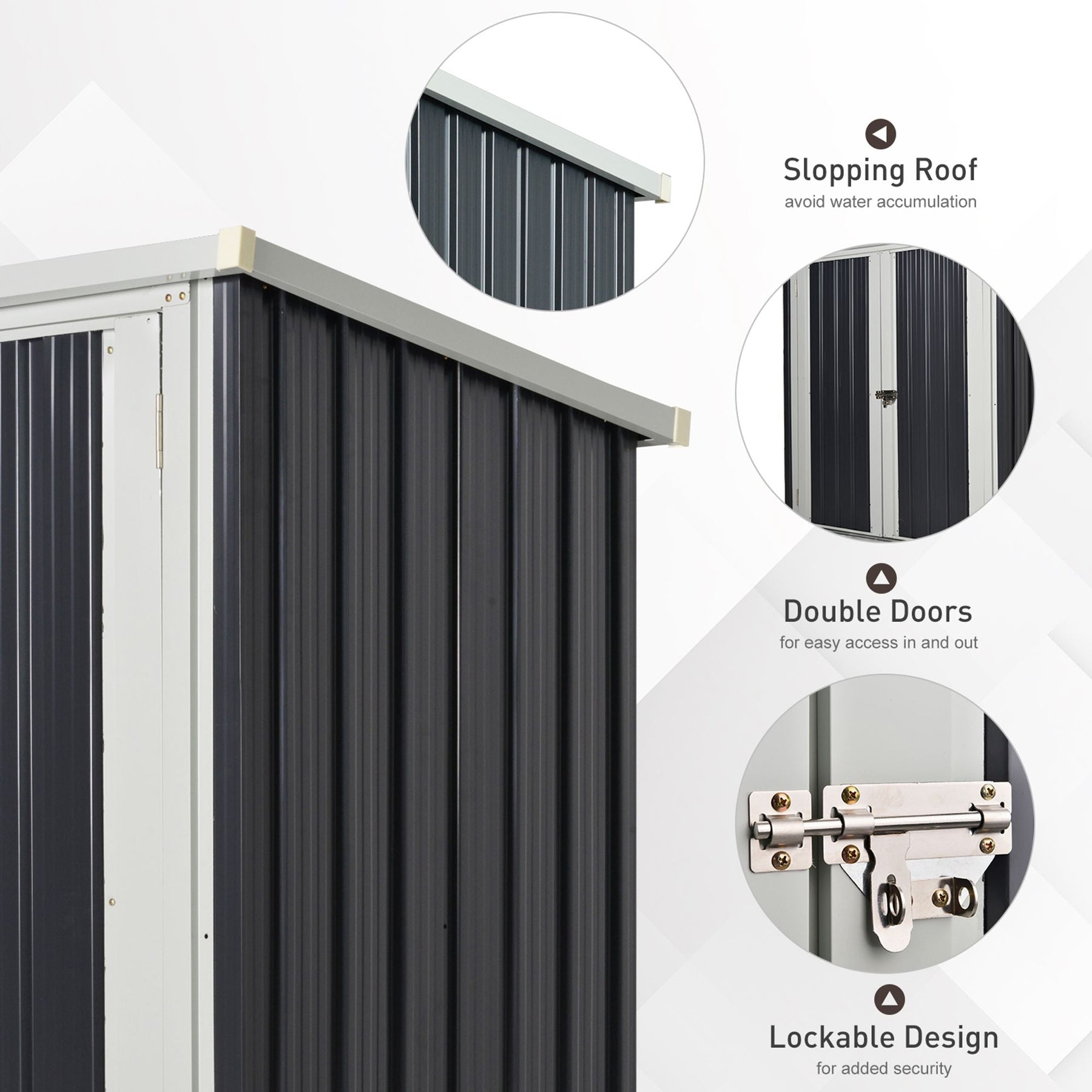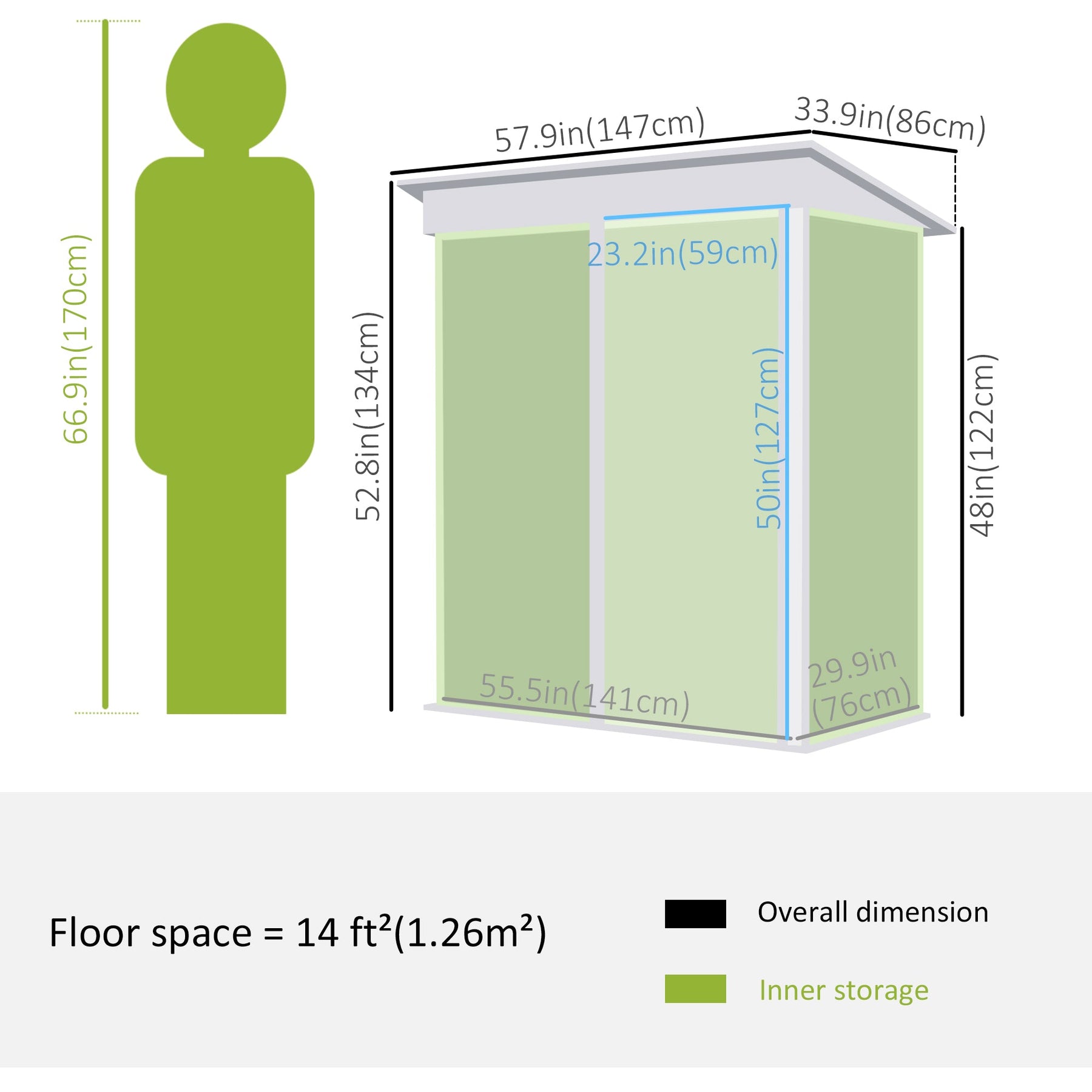 Upgrade your outdoor storage with our spacious and durable garden shed, designed to meet all your storage needs. Whether you need a place for garden tools, lawn care equipment, outdoor toys, or pool supplies, this large shed offers a convenient and secure solution. Constructed with weather-resistant galvanized steel, it’s built to withstand the harshest elements, including wind, rain, snow, and UV rays, ensuring long-lasting durability. With fire-resistant properties, it provides additional peace of mind in high-risk areas. The lockable door with a secure latch offers added security, protecting your tools and equipment from theft while keeping dangerous items out of reach of children and pets. Prioritizing safety, the shed is equipped with an anti-collision and screw protection shell, minimizing the risk of accidents and injuries. The overall dimensions of the shed are 57.9"L x 33.9"W x 48"/52.8"H (147 x 86 x 122/134cm), with an inside space of 55.9"L x 29.9"W (142 x 76cm) and a floor area of 14ft² (1.26m²). Assembly is required and is recommended to be done by 3 individuals within 3 hours. Please avoid installation in windy conditions for safety.