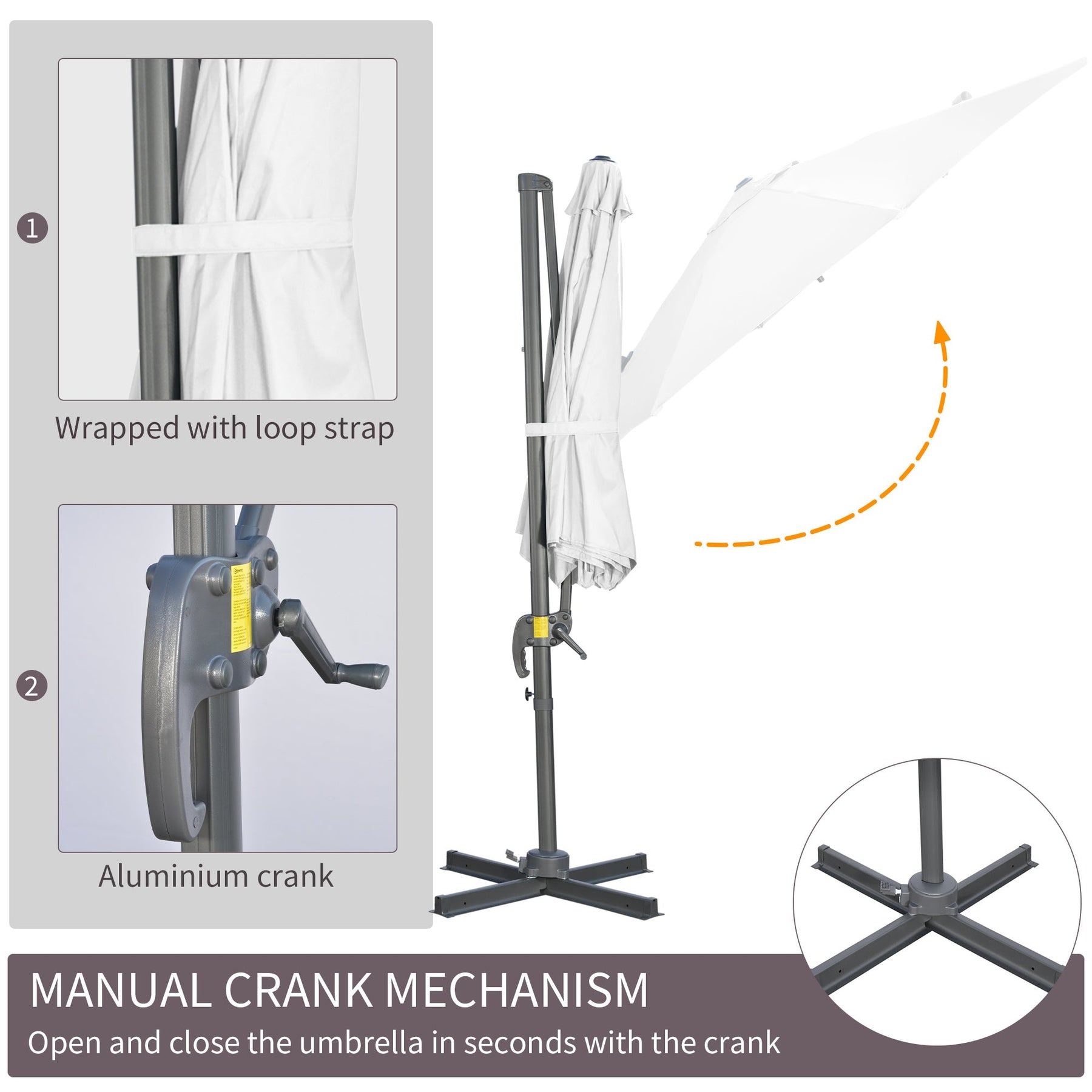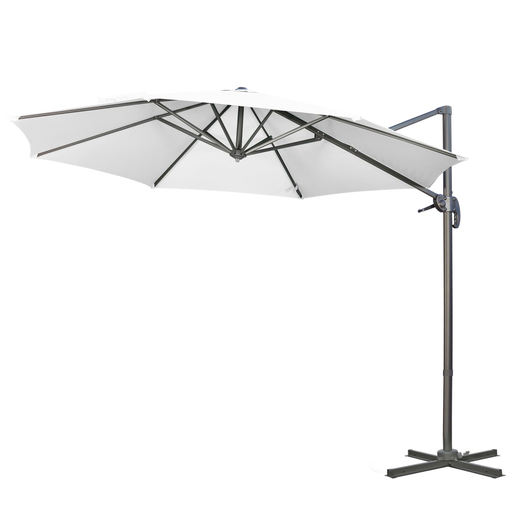 Bring style, durability, and versatility to your outdoor space with this high-performance cantilever patio umbrella. Designed with a sturdy aluminum pole and eight steel ribs, all powder-coated for superior resistance to rust, chipping, and corrosion, this umbrella is built to last through countless seasons. The generous canopy, made from premium polyester fabric, offers 98% UV protection, is fade-resistant, and easy to clean—perfect for your patio, poolside, garden, or deck. Functionality meets ease with a smooth crank lifting system and five adjustable tilt angles to keep you shaded from every direction. A standout feature is the 360-degree rotation, effortlessly controlled by a foot pedal, giving you full flexibility to adjust shade without moving the base. The included cross base adds extra stability, making this umbrella a dependable and stylish solution for long days under the sun.