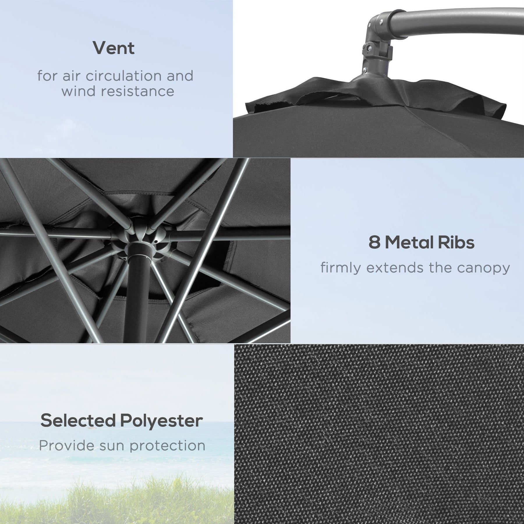 Create a shaded sanctuary in your outdoor space with this 9.6' offset patio umbrella, designed to offer both functionality and durability. Crafted with UV-resistant polyester fabric, the large canopy includes a vented top to promote airflow and increase wind resistance, keeping you cool and comfortable even on breezy days. The robust powder-coated steel pole and 8 rib frame provide exceptional stability and long-lasting use. Effortlessly open and close the umbrella using the user-friendly crank handle for quick sun protection when you need it. With a generous 9.6' diameter, this deck umbrella provides ample shade for your garden set, outdoor dining area, or patio seating, making it an ideal addition to porches, balconies, and backyards. Assembly is easy, and a cross base is included for secure setup (weights not included). Please note: Not intended for use in extreme weather.