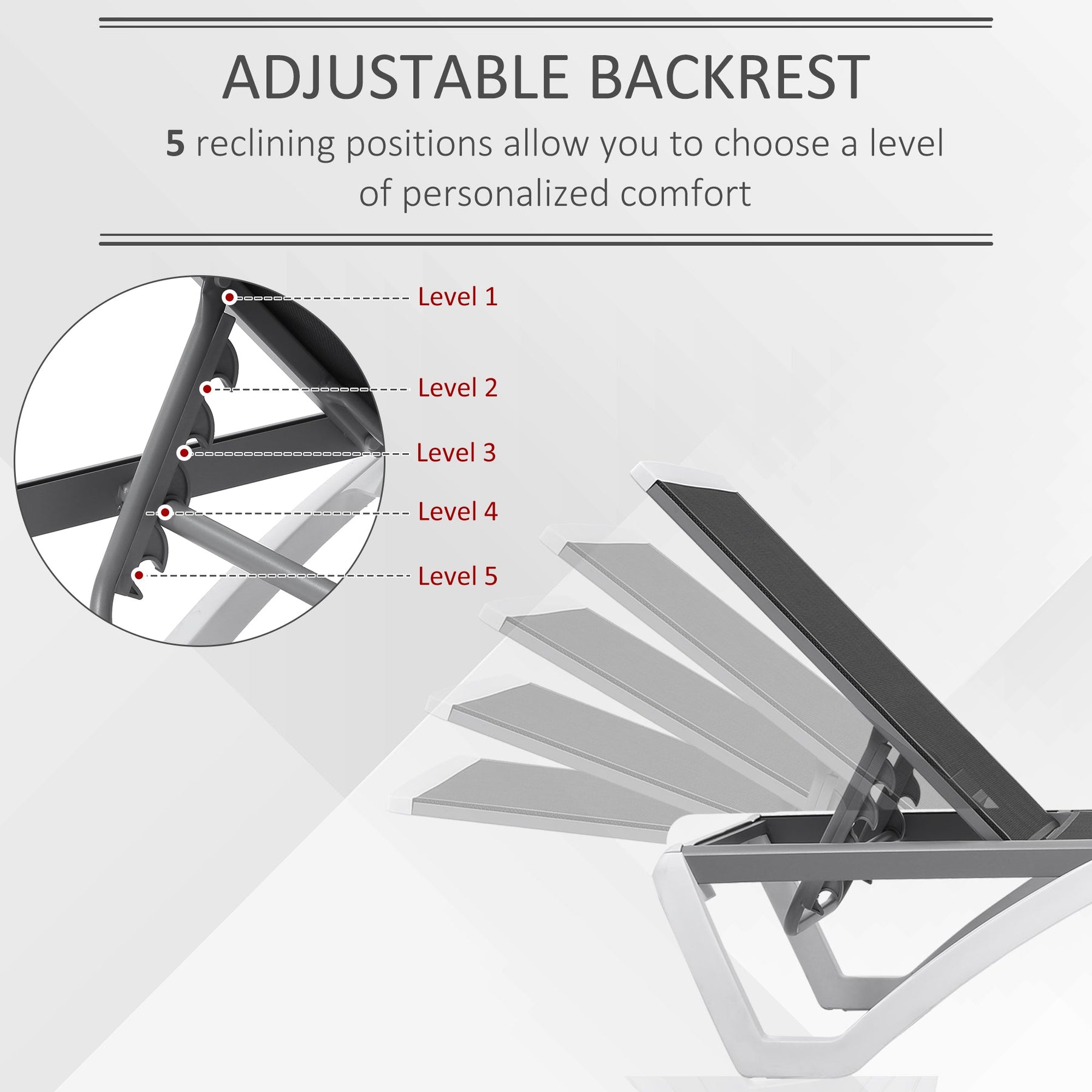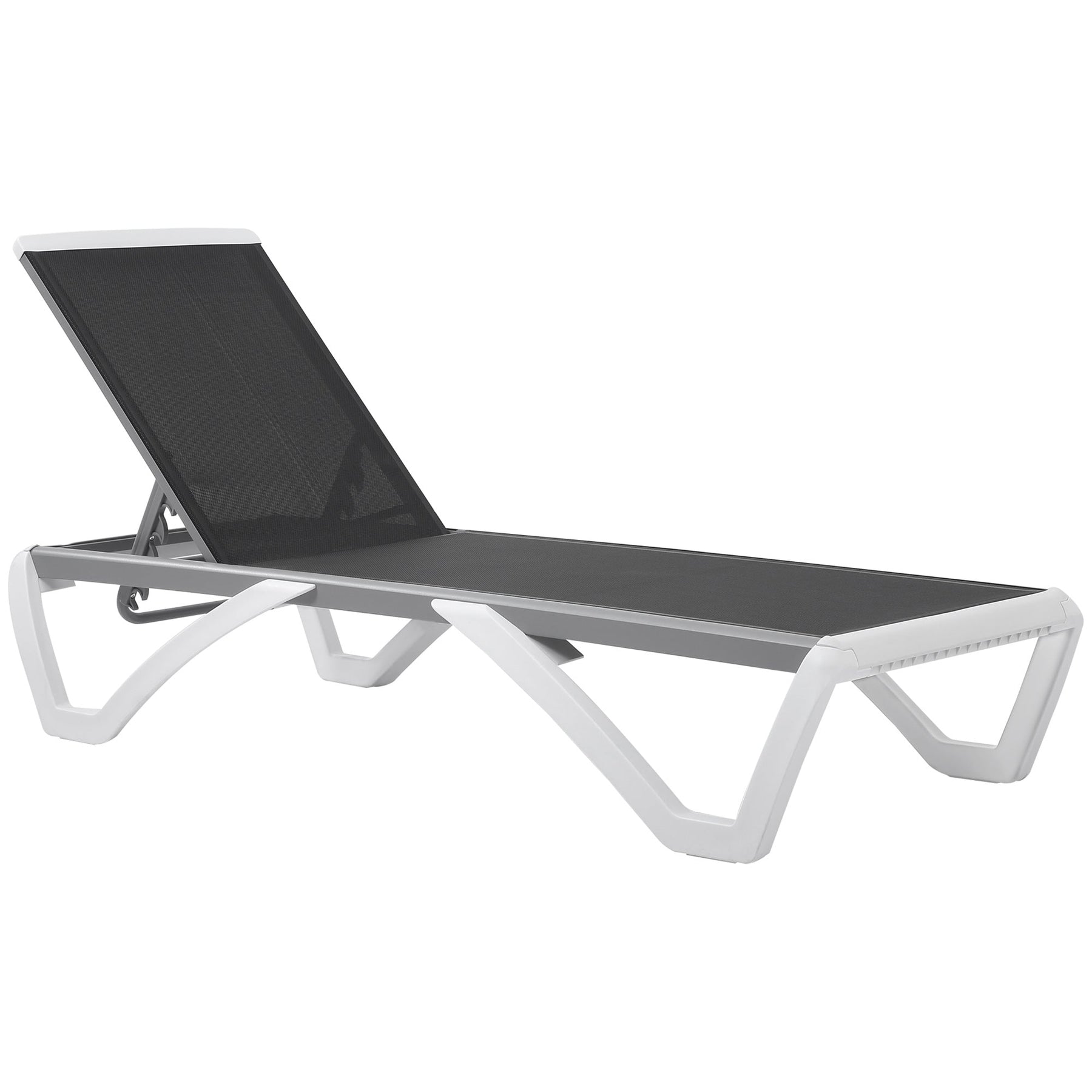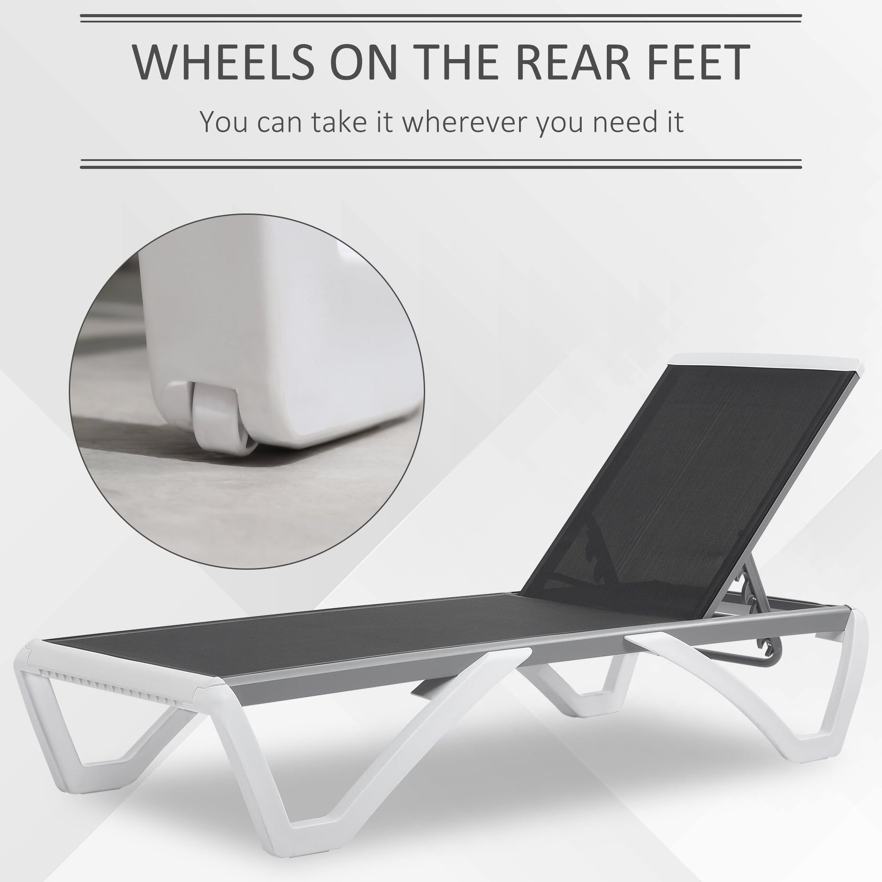 Elevate your outdoor relaxation experience with this modern Chaise Lounge Outdoor Pool Chair, designed for both style and comfort. With a sturdy aluminum frame and weather-resistant PP plastic legs, this lounger is built to withstand outdoor elements while maintaining its sleek, industrial appeal—perfect for poolside lounging, patios, or balconies. The breathable mesh sling fabric and thick padded cushions ensure maximum comfort, whether you're sunbathing or enjoying a quiet afternoon read. The 5-position adjustable backrest offers customizable support, reclining from upright to completely flat for optimal relaxation. Thoughtfully designed with wheels on the back legs, this sun lounger can be effortlessly moved to catch the perfect rays or stored away when needed. Combining durable materials, easy mobility, and a contemporary look, this chaise lounge is your go-to solution for luxury outdoor comfort year-round.
