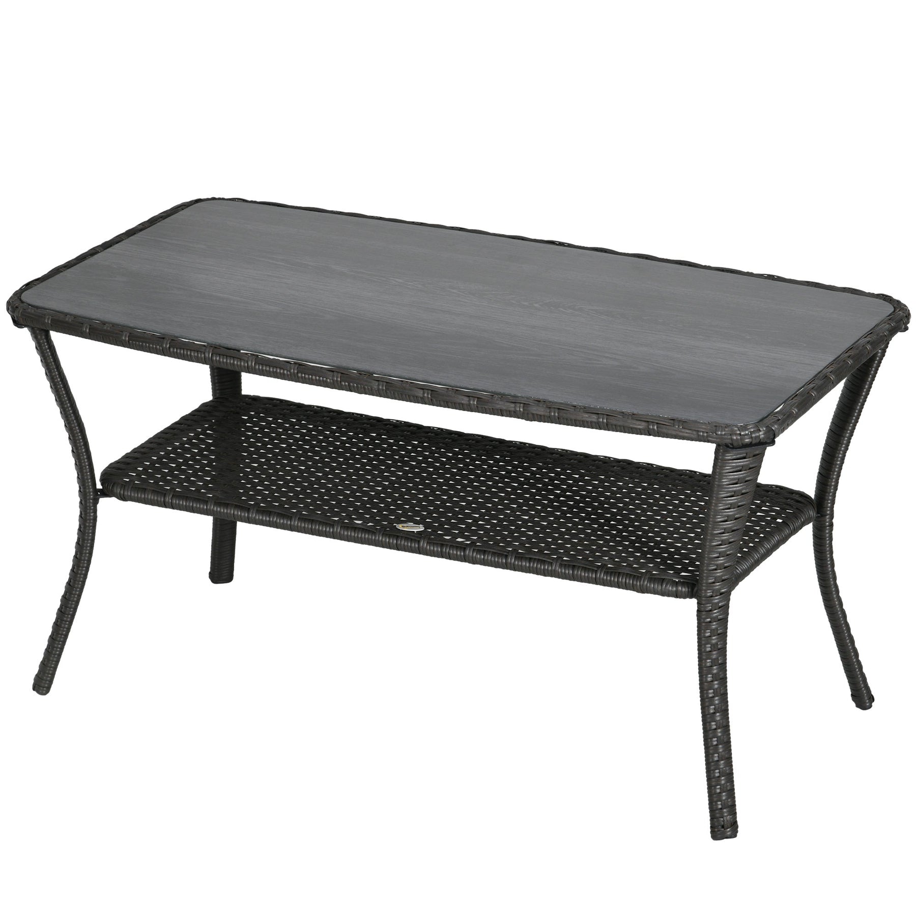 Add a touch of refined charm to your indoor or outdoor space with this stylish wicker coffee table. Featuring a woodgrain glass top, this small table exudes elegance and modern appeal, making it the perfect centerpiece for your patio, sunroom, or living area. Designed with a two-tier structure, it offers both form and function—use the bottom shelf to store books, magazines, or outdoor essentials, keeping your space organized and clutter-free. Built to withstand the elements, the steel frame is wrapped in durable twin half-round PE rattan for a handwoven look that's both weather-resistant and long-lasting. Whether you’re entertaining guests or enjoying a quiet moment alone, this coffee table delivers reliable performance and timeless design.