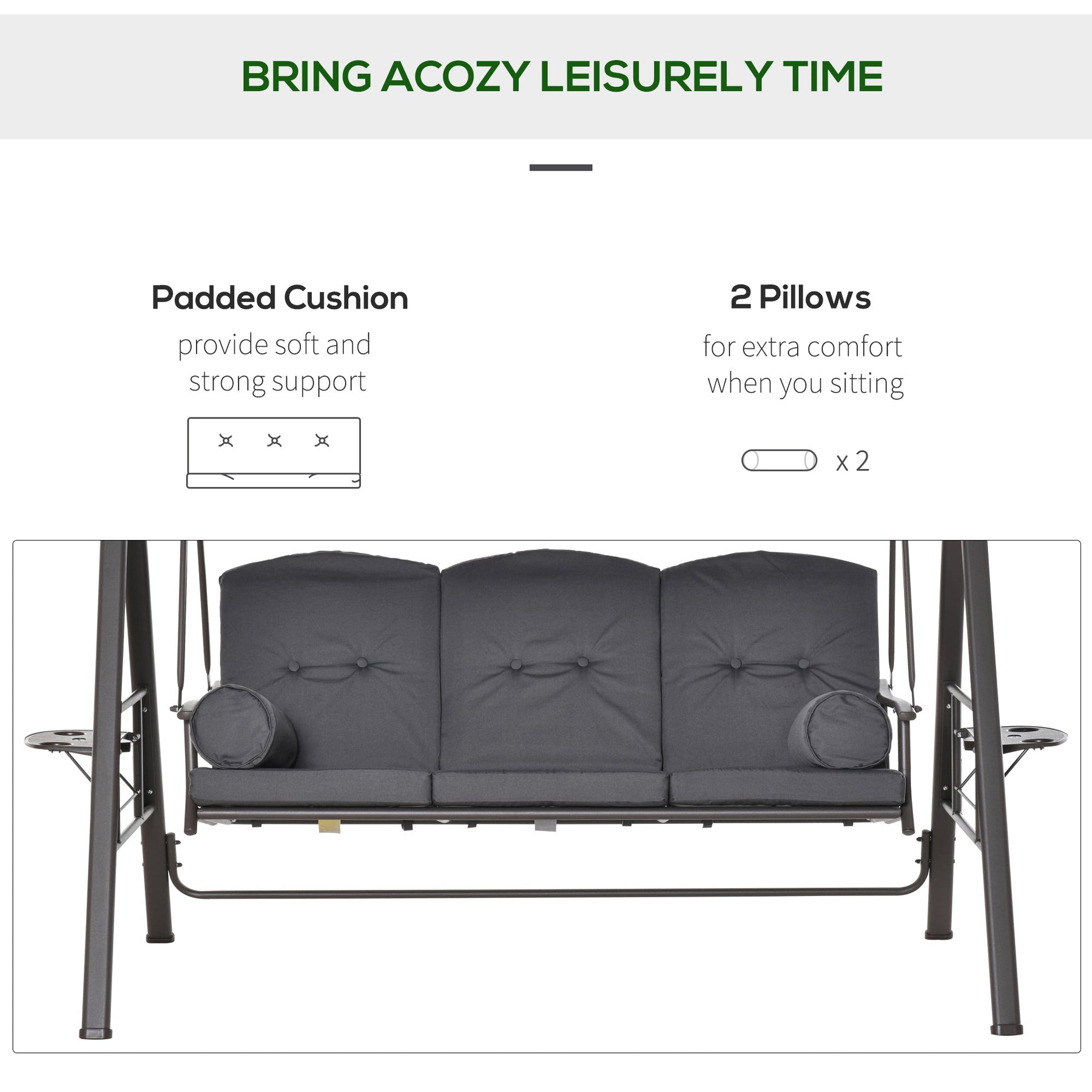 Transform your outdoor space into a relaxing retreat with this stylish 3-person swing chair, perfect for your garden, backyard, lawn, patio, or deck. Built with a sturdy modern arch steel frame and curved handrails, this swing offers a sleek and neutral color scheme that complements a variety of outdoor settings. The weather-resistant canopy provides shade, allowing you to enjoy a cool and comfortable swing, no matter the weather. Designed for ultimate relaxation, this swing comfortably seats up to three people, making it an ideal spot for enjoying time with family and friends. The side trays on both sides of the swing add convenience, providing a perfect place to rest drinks, snacks, or books while you swing. With padded cushions for added comfort and two included arm bolsters, this porch swing ensures you can unwind in complete relaxation.