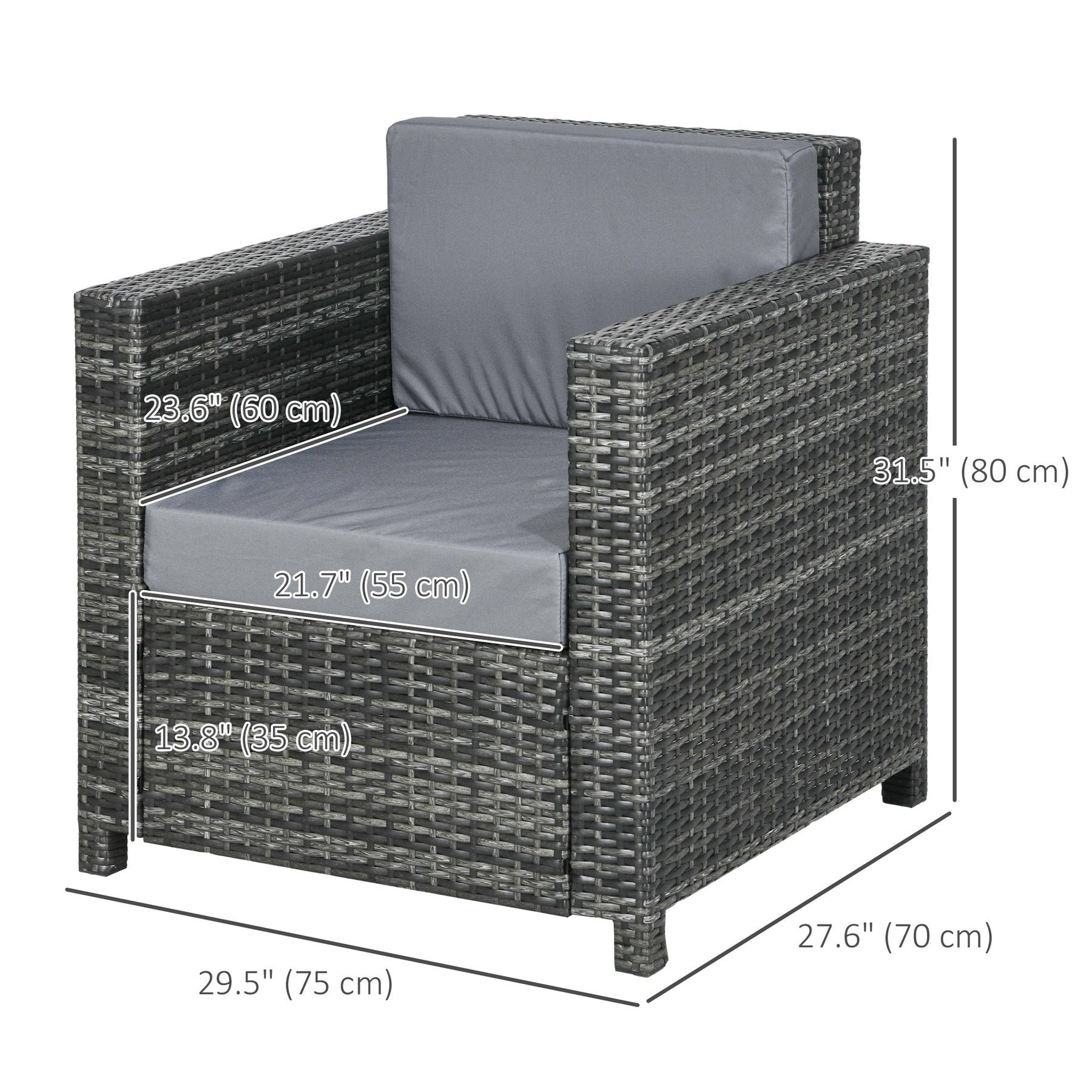 Dimensions: 29.5" W x 27.6" D x 31.5" H; seat size: 21.7" W x 23.6" D x 13.8" H.