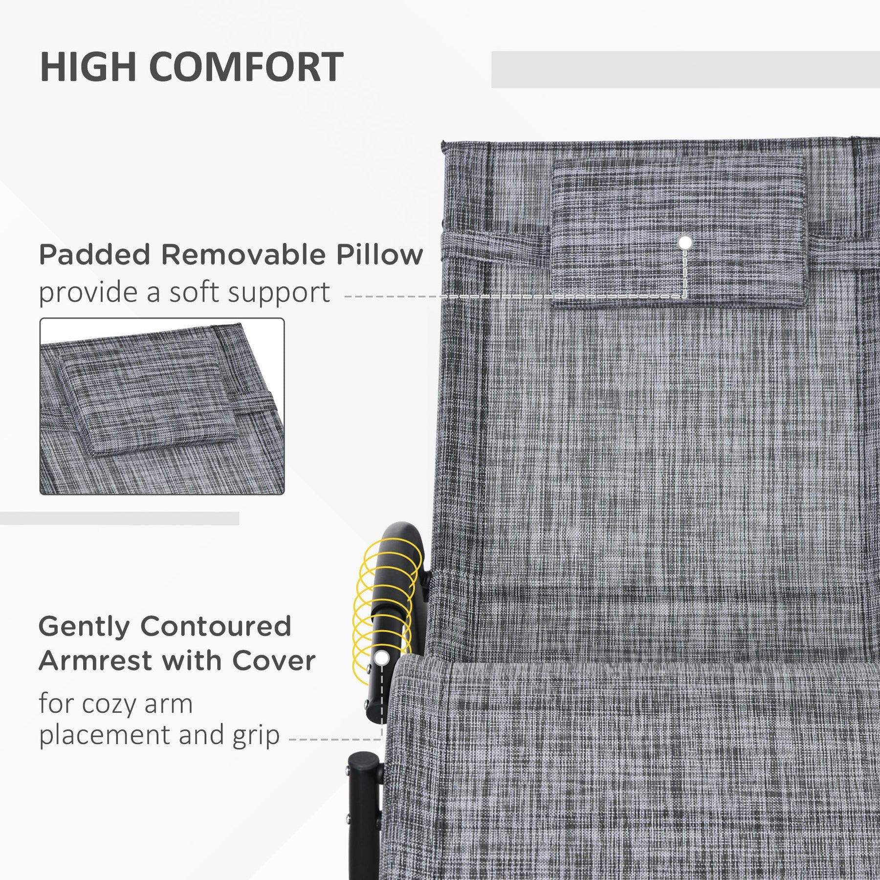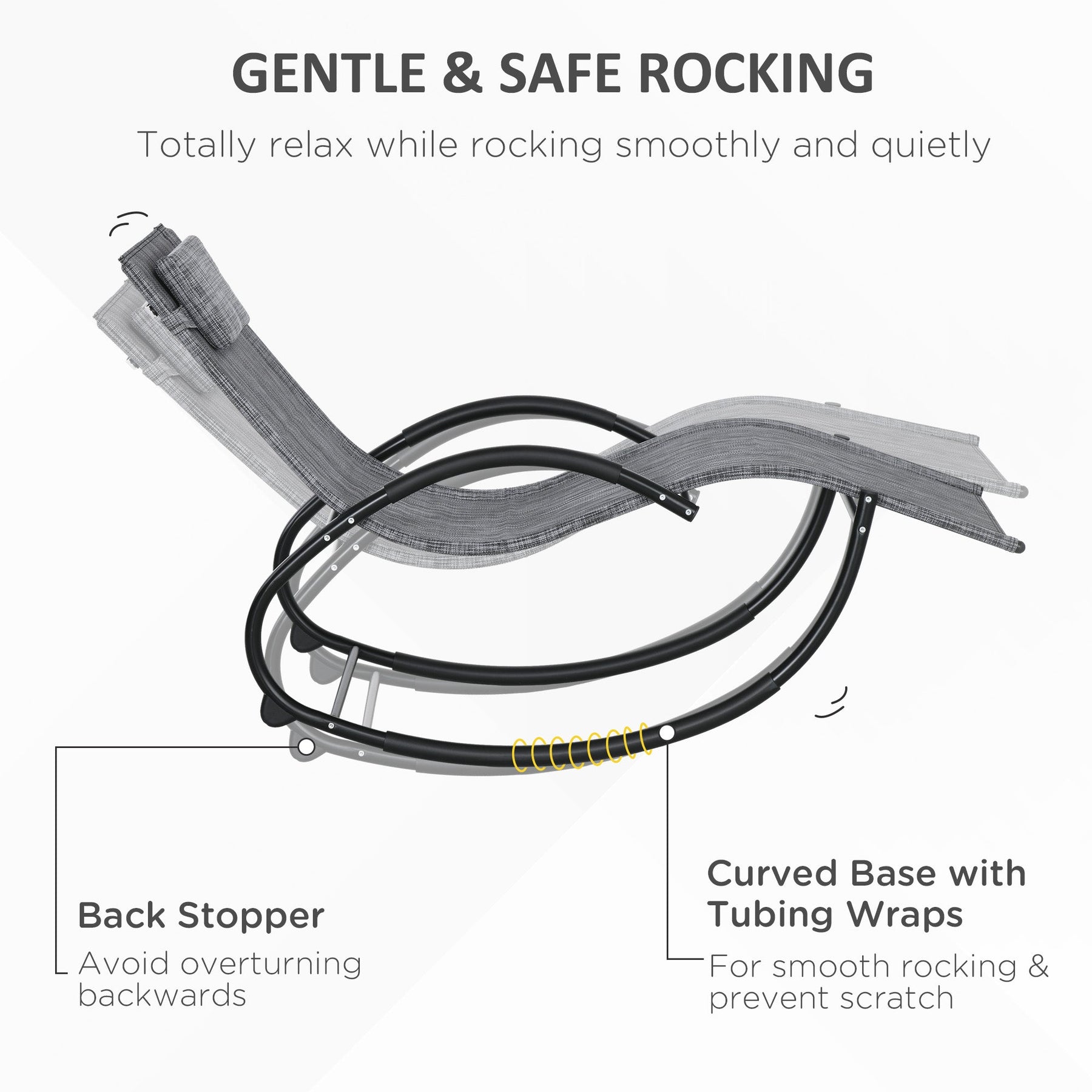 Experience ultimate relaxation with this stylish wave-shaped outdoor rocking chair. Designed with a smooth rocking motion, spacious seating, and a contemporary aesthetic, this chair adds a modern touch to any patio, backyard, garden, or balcony. Padded armrests and bottom protection prevent scratches while enhancing comfort. The stable base allows for gentle rocking, and curved plastic foot pads act as swing limiters for extra safety. The breathable, anti-UV, and water-resistant mesh fabric ensures durability, while the sturdy metal frame provides long-lasting support. A removable padded headrest offers additional comfort, making this the perfect spot for hours of lounging. Easy to maintain, simply wipe down with mild soap and water when needed.