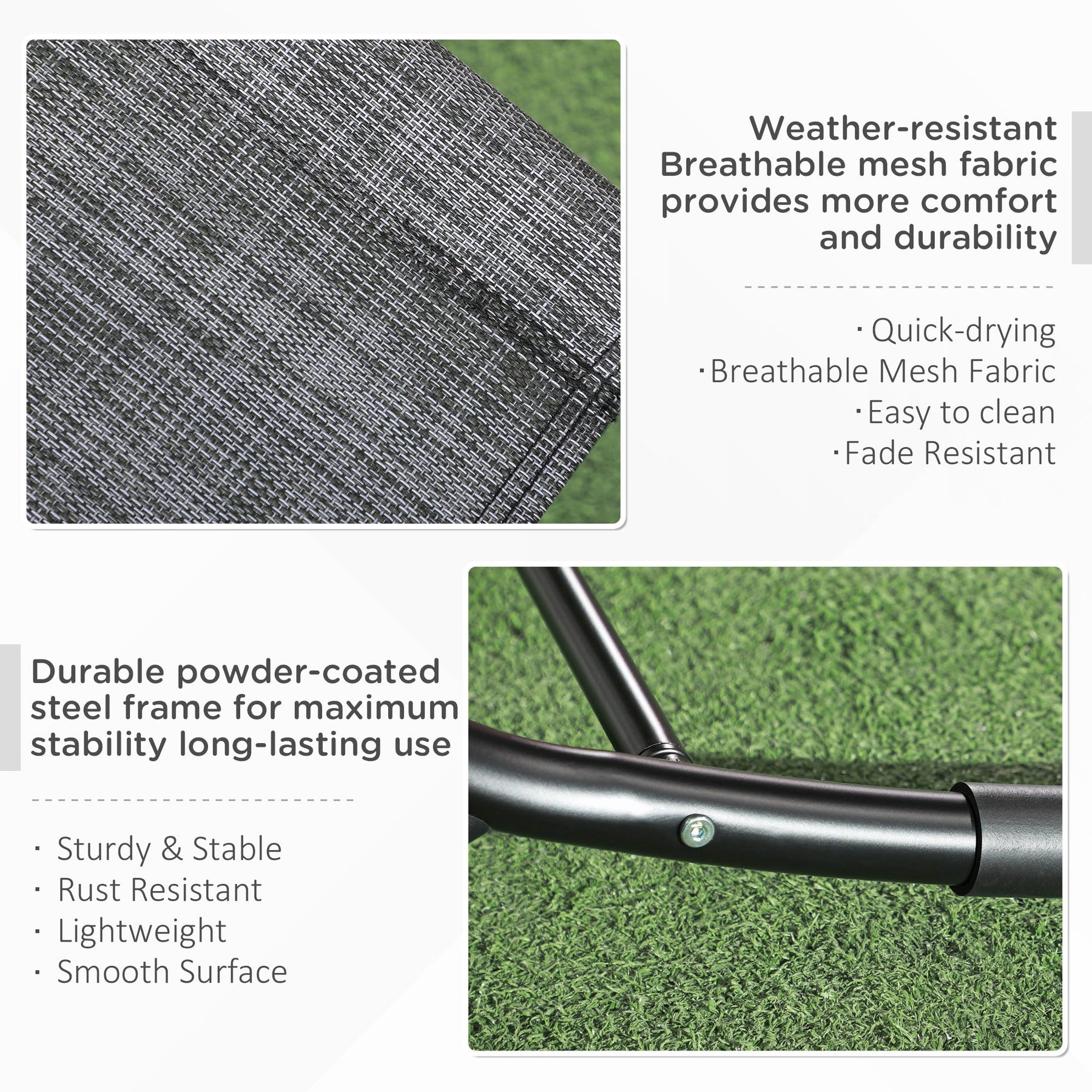 • Stable metal frame with anti-UV, water-resistant breathable mesh fabric.