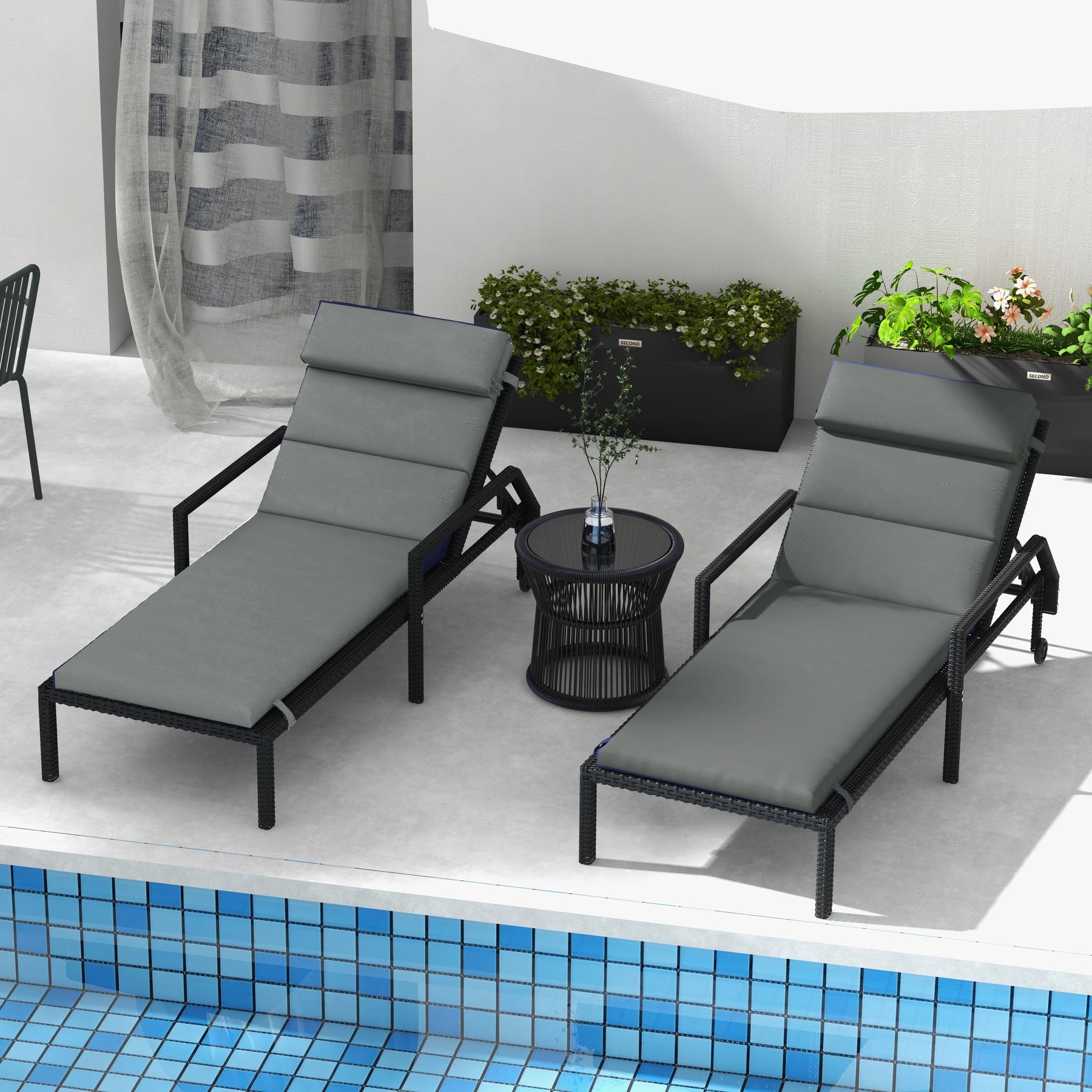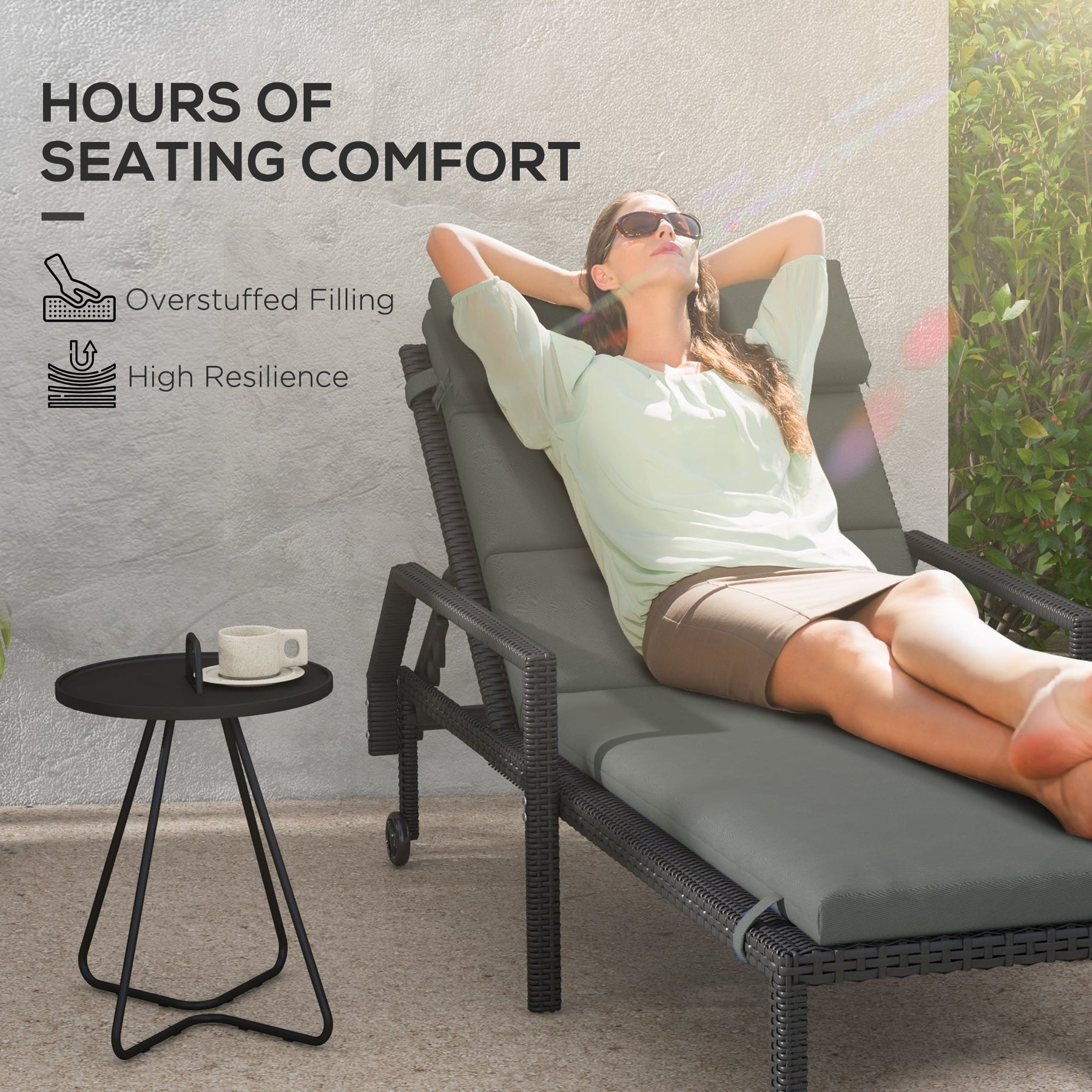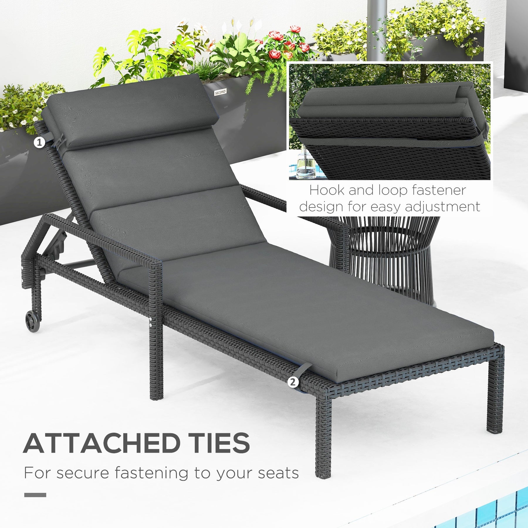 Enhance your outdoor lounging experience with this set of two plush chaise lounge cushions, designed to provide maximum comfort and durability. Whether you’re replacing old cushions or upgrading your patio furniture, this set creates a soft and inviting space for relaxation. Each cushion is thoughtfully crafted with a built-in headrest to provide excellent neck and head support, making it perfect for enjoying long hours under the sun. The dual-filling design combines two different types of materials, offering both high resilience and softness to ensure lasting comfort and shape retention. Wrapped in a durable polyester cover, these cushions are smooth to the touch while being tough enough for both indoor and outdoor use. The fabric is resistant to light stains and water splashes, allowing for easy cleaning with a damp cloth. To ensure they stay securely in place, the cushions include built-in ties and a hook-and-loop fastener system, preventing any slipping or movement due to wind. Designed to fit chaise lounges with a width of 23.6" - 25.6" (60-65 cm), this set is perfect for patios, gardens, and poolside seating. Each cushion measures 77.2 inches in length, 24.8 inches in width, and 2.4 inches in thickness, offering a plush and stylish touch to your outdoor space.