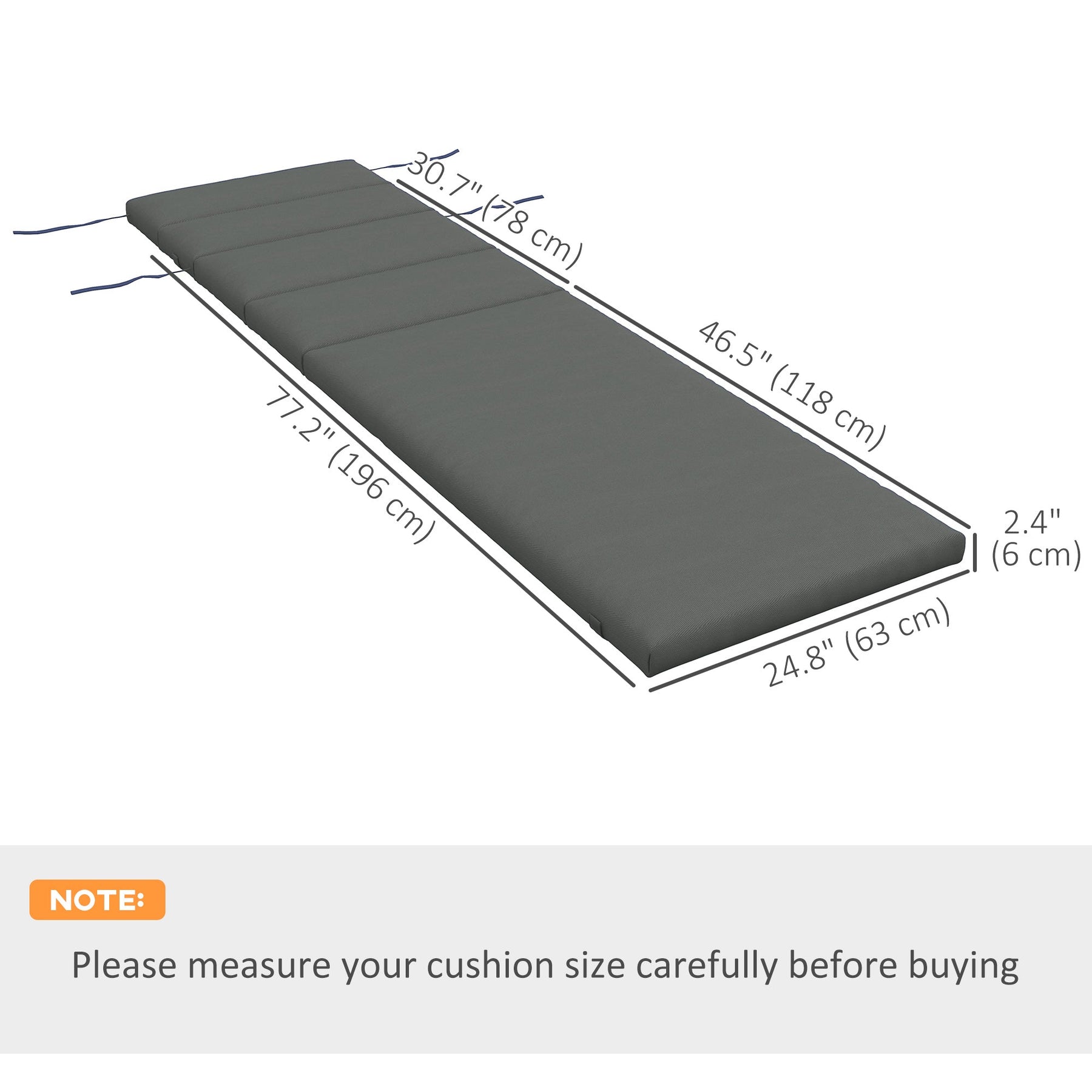 Overall dimensions (each cushion): 77.2" L x 24.8" W (196 x 63 cm), thickness: 2.4" (6 cm)
