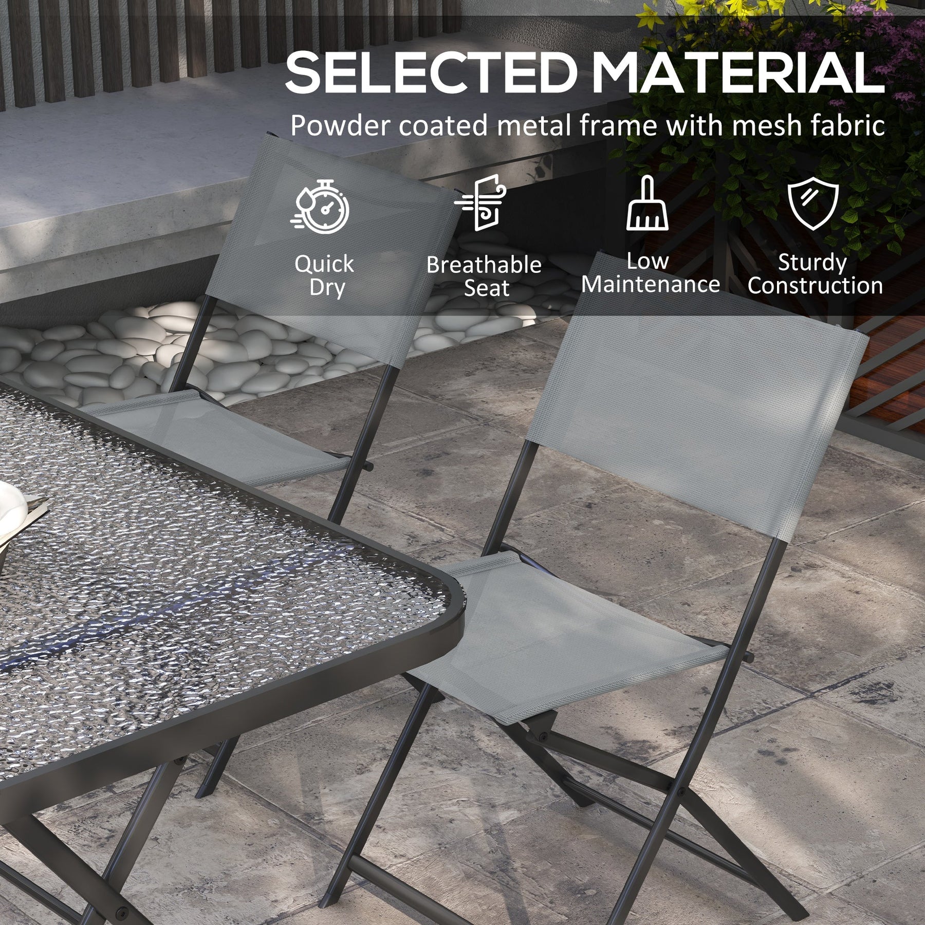 Create a stylish and functional outdoor dining space with this 5-piece patio dining set, designed for comfort and convenience. The set includes a sleek rectangular dining table with a 5mm thick tempered glass top featuring a watermark effect, adding a touch of elegance while making cleaning effortless. Accompanying the table are four matching folding chairs, crafted with breathable mesh fabric for a comfortable seating experience. The entire set is built with a sturdy metal frame coated with a protective powder finish, ensuring resistance to UV exposure and light water damage, making it perfect for outdoor use. When not in use, the chairs and table fold easily for compact storage, making this dining set ideal for patios, balconies, gardens, and small outdoor spaces. Whether you're enjoying a family meal, sipping coffee, or entertaining guests, this set combines durability, modern aesthetics, and practicality to enhance your outdoor lifestyle.
