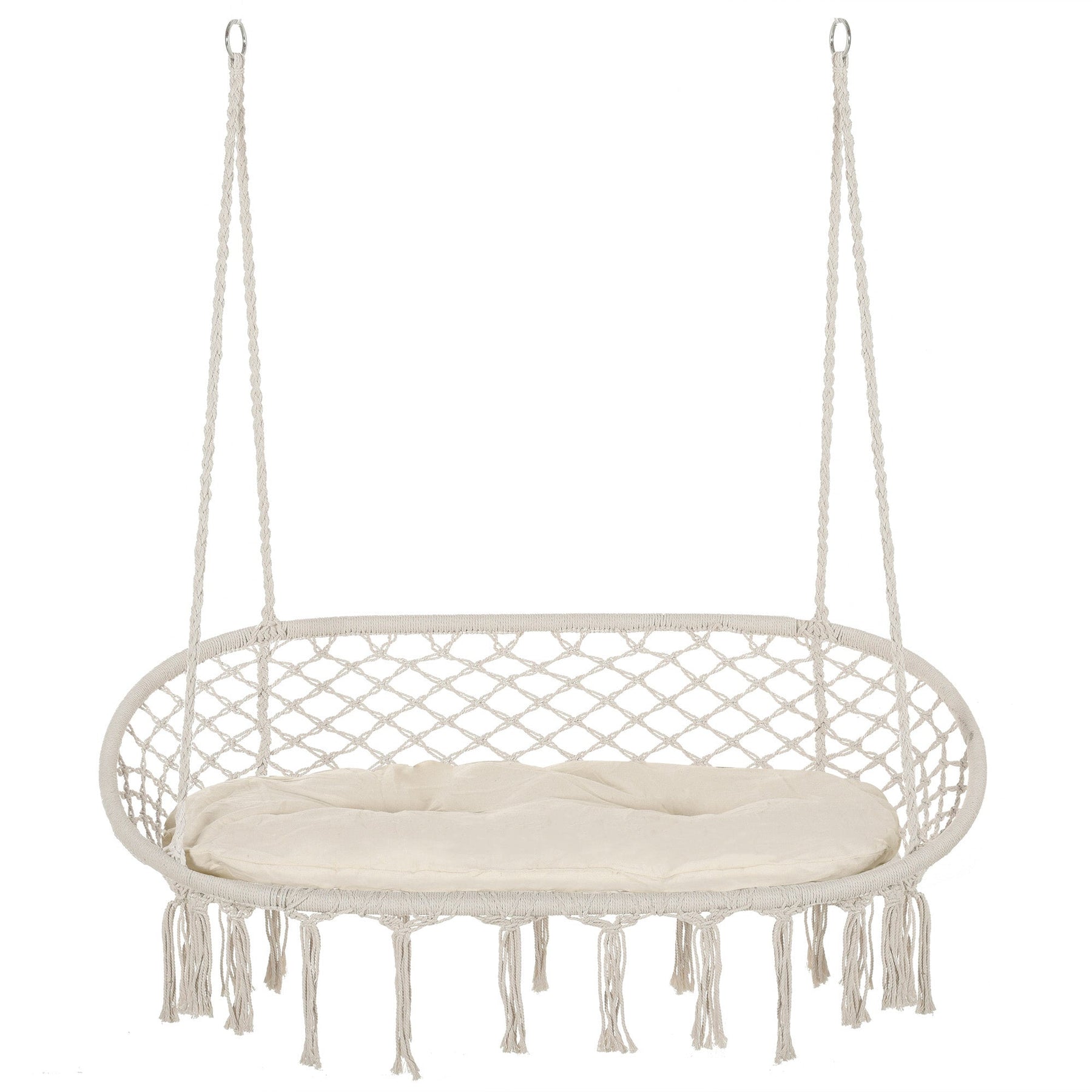 Bring a touch of boho elegance to your indoor or outdoor space with this stylish hanging chair, designed to accommodate two people comfortably. Featuring a beautifully handwoven macrame net pattern and hanging fringe tassels, this double-seat hammock swing chair makes a striking decorative statement while offering a cozy retreat. Ideal for relaxing with a friend or enjoying peaceful solitude, it's perfect for porches, gardens, bedrooms, balconies, or living rooms. The soft handmade cotton composition and included seat cushion provide a plush, supportive sitting experience for reading, chatting, or simply unwinding. Built with a reinforced metal frame, this hammock chair offers outstanding stability and durability for long-term use. The open net design enhances airflow to keep you cool during warmer days. With an overall dimension of 51.25"W x 29.5"D x 13.75"H and a weight capacity of 396 lbs, this boho-inspired hanging chair brings both comfort and charm wherever it’s placed.