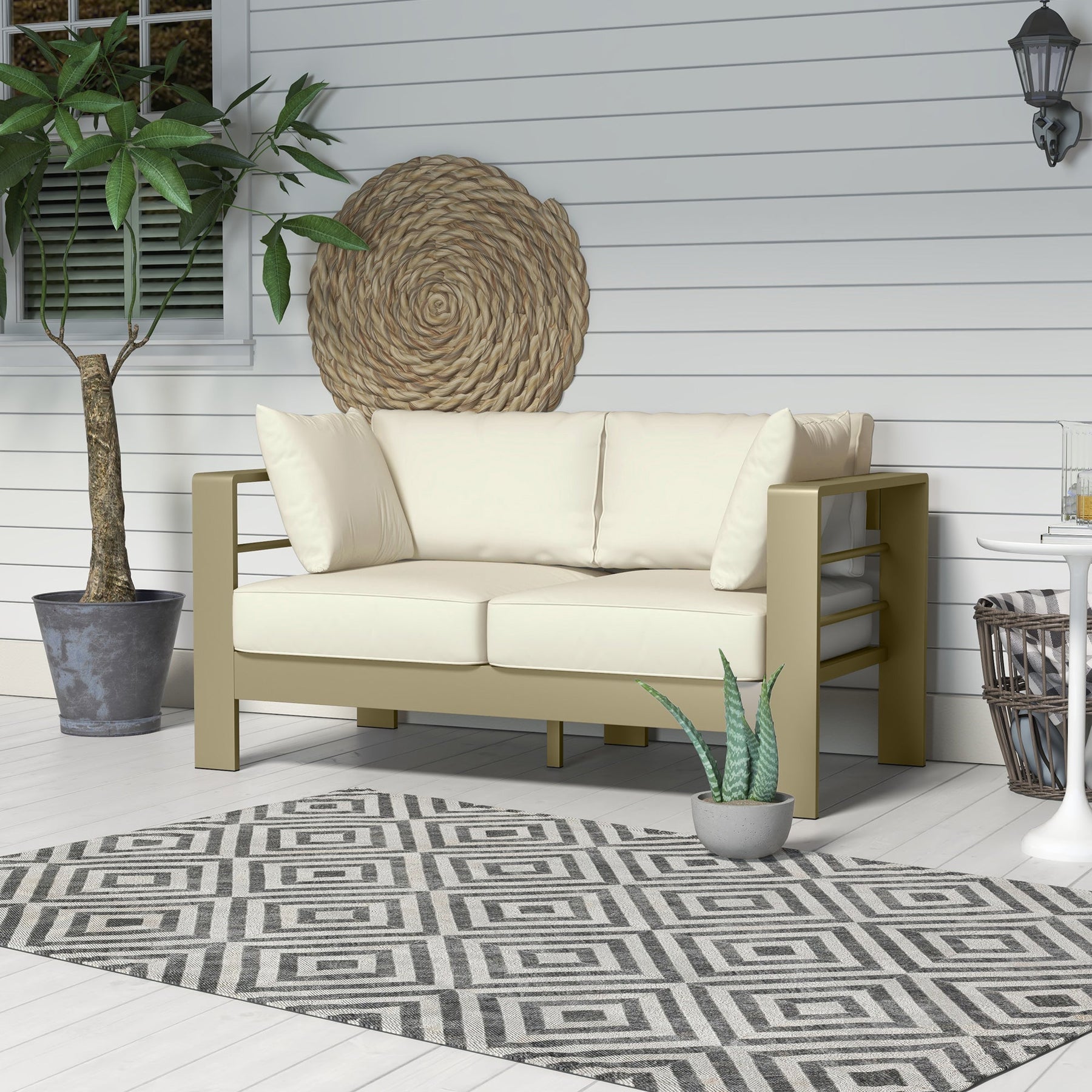 Create a cozy and stylish retreat in your outdoor space with this spacious and comfortable garden loveseat. Designed to seat two people with ease, the generously sized 45.3" wide seat (115 cm) provides ample room for relaxing conversations, reading, or enjoying a drink in the fresh air. The ergonomic design includes wide armrests that offer added support and comfort, making it easy to sit and stand while adding a touch of contemporary charm to your balcony or patio décor. This balcony loveseat comes complete with plush 5.1" thick padded foam cushions and soft pillows that are both removable and washable, delivering a luxurious and comfortable seating experience that lasts through the seasons. Built on a powder-coated aluminum frame, the loveseat is lightweight, rust-resistant, and strong enough to support up to 573 lbs (260 kg). Whether placed in your garden, patio, or balcony, this outdoor sofa adds both function and flair to your outdoor living area. Overall dimensions are 54.3"L x 27.6"W x 24.6"H (138 x 70 x 62.5 cm) with a seat height of 9.8" (25 cm). Assembly required.