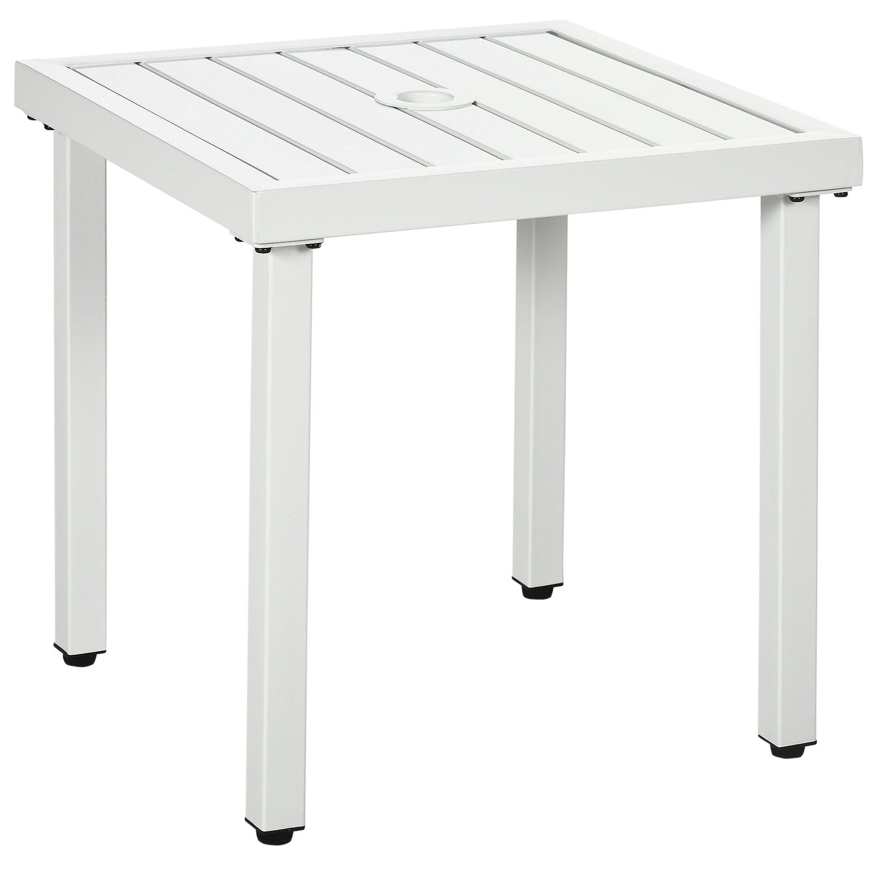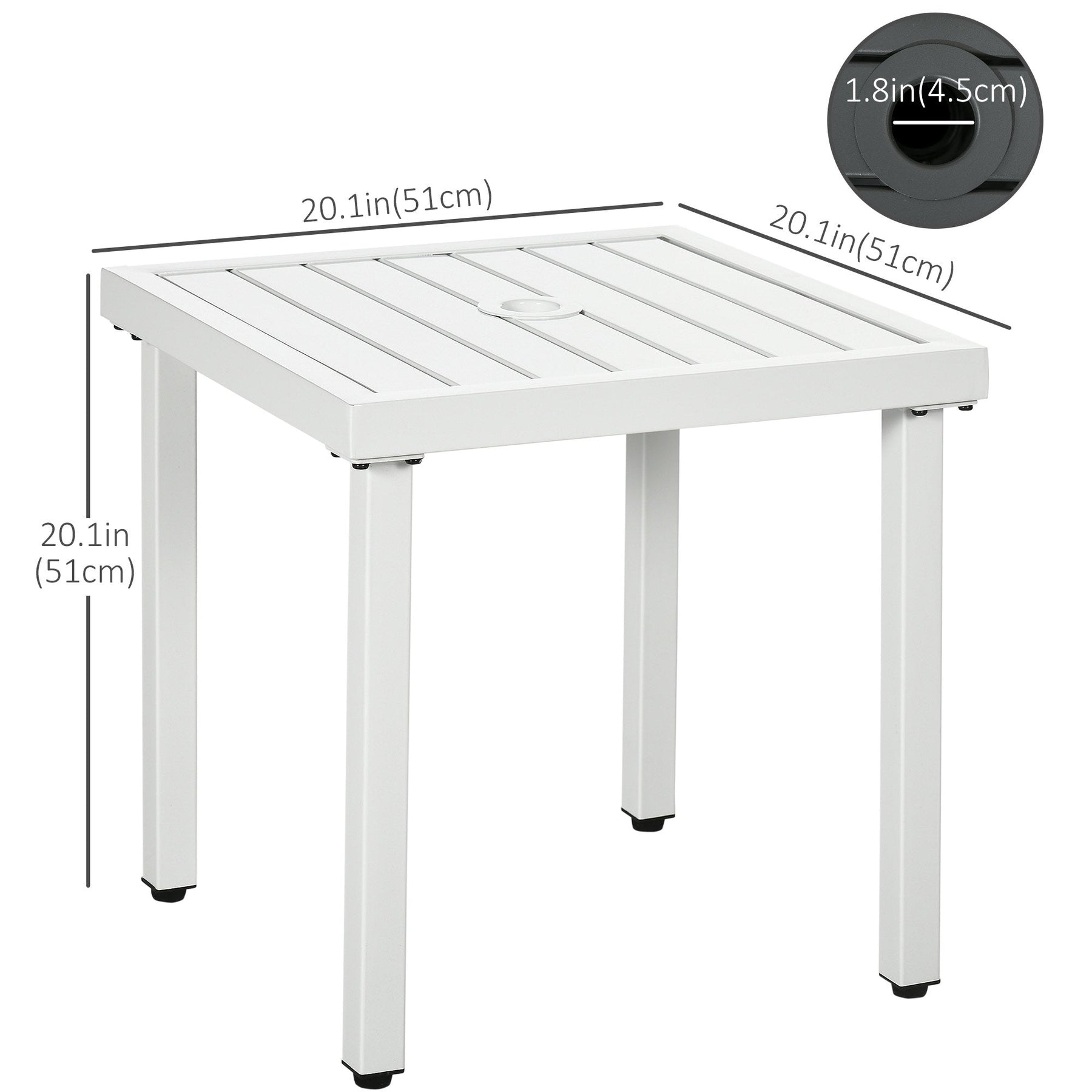Maximize your outdoor space with this versatile and compact accent table, designed to hold drinks, snacks, books, or flowers while freeing up your hands to enjoy the outdoors. The table features a central Φ1.8" (45mm) umbrella holder, keeping your parasol securely in place for sun protection (umbrella not included). It also comes with adjustable anti-slip feet to ensure stability on uneven surfaces, while protecting your floor from damage. Constructed from durable steel with a powder-coated and electrophoresis finish, this table is perfect for long-lasting use in all weather conditions. Ideal for small patios, gardens, or balconies, it offers both style and functionality.