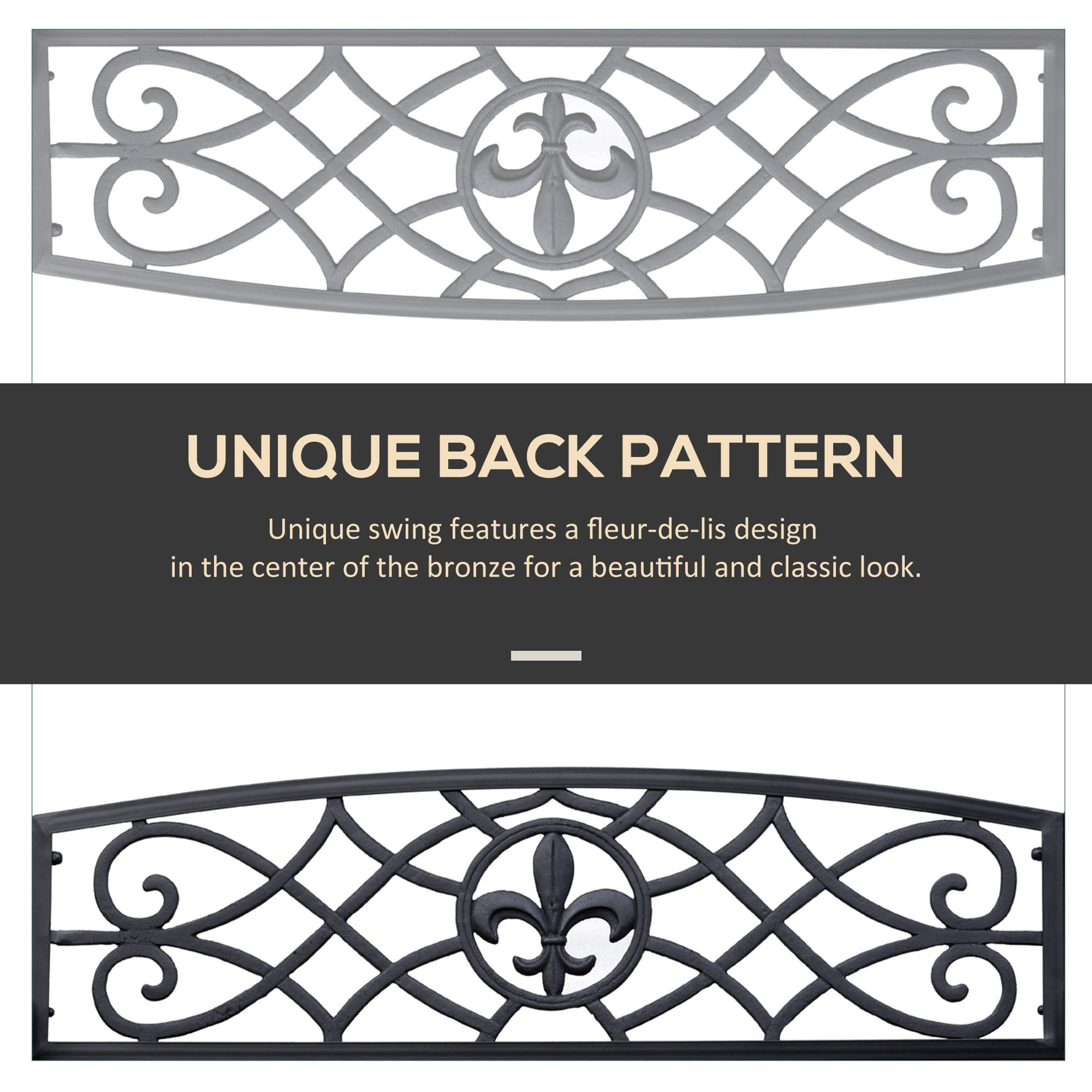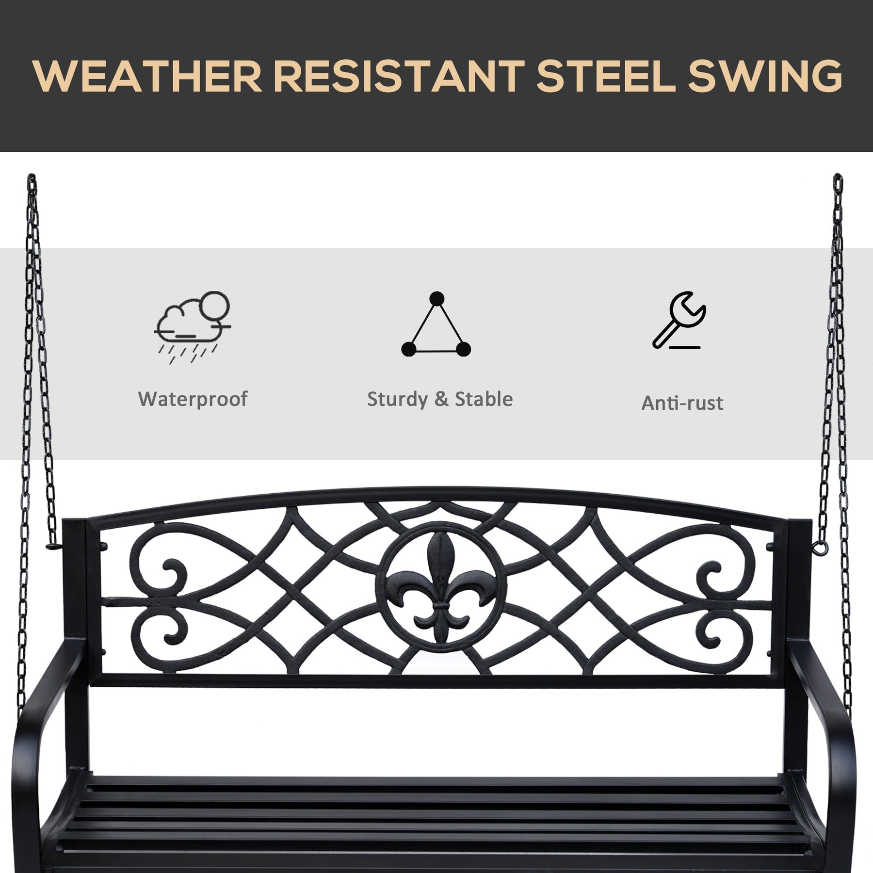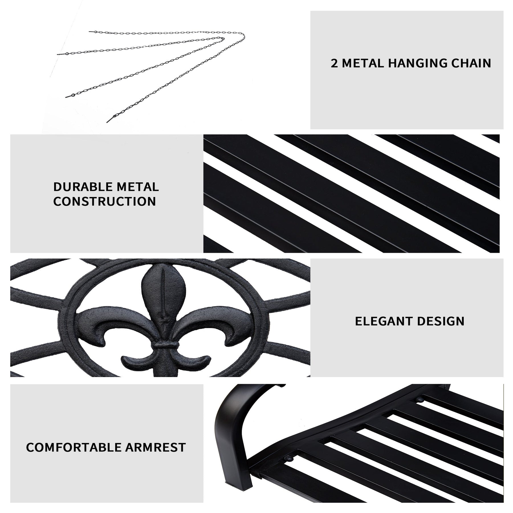 Add timeless elegance and comfort to your outdoor space with this beautifully designed hanging steel porch swing. Featuring a classic fleur-de-lis motif in the backrest, this swing creates a charming focal point for your backyard, patio, or garden. Constructed from rust-resistant steel with a powder-coated finish, it’s built to withstand the elements and provide years of enjoyment. The wide seat comfortably accommodates up to two adults, and the included 11.5 ft adjustable steel chains offer flexible installation options. Hang it beneath a patio, gazebo, or on a compatible swing frame to create your perfect outdoor retreat.