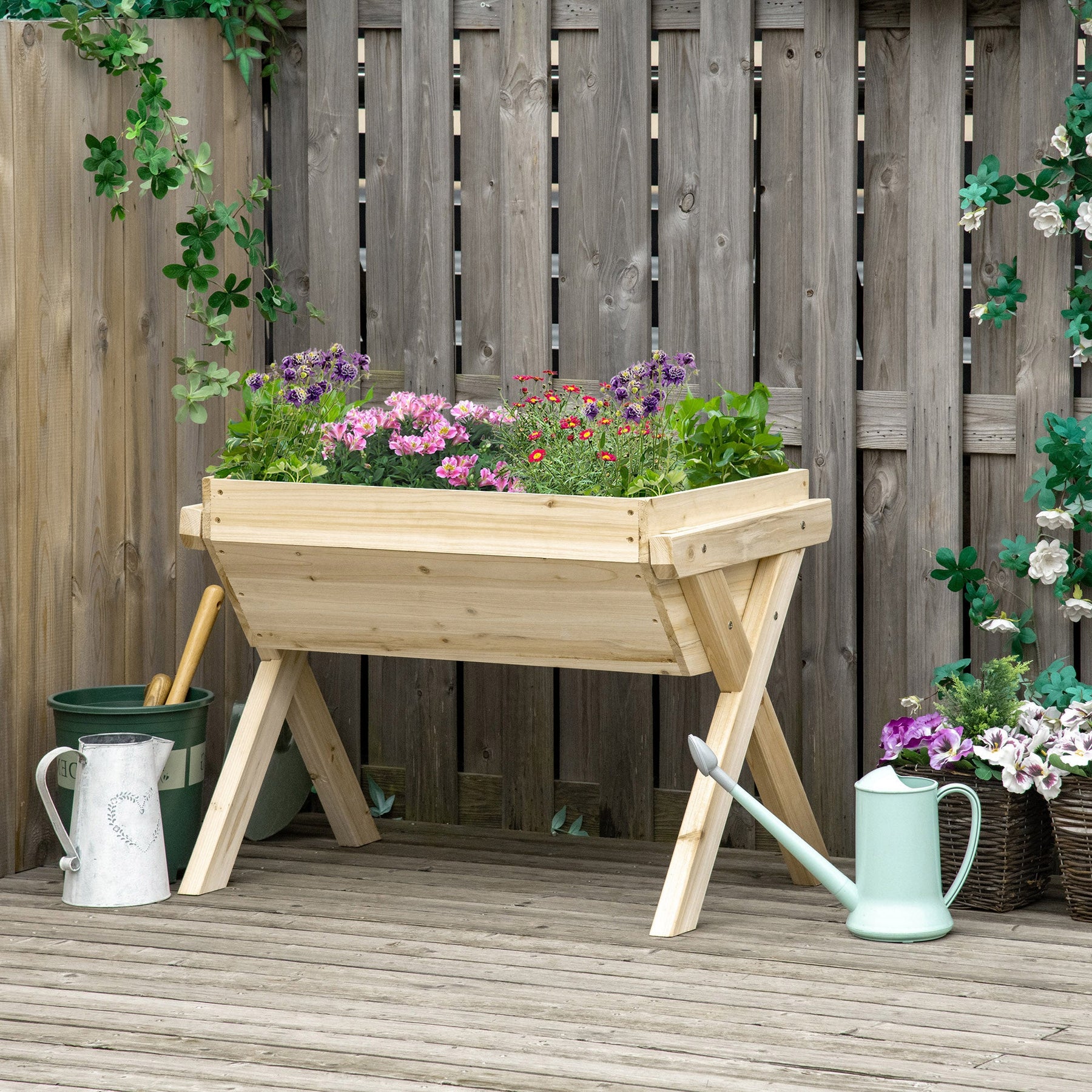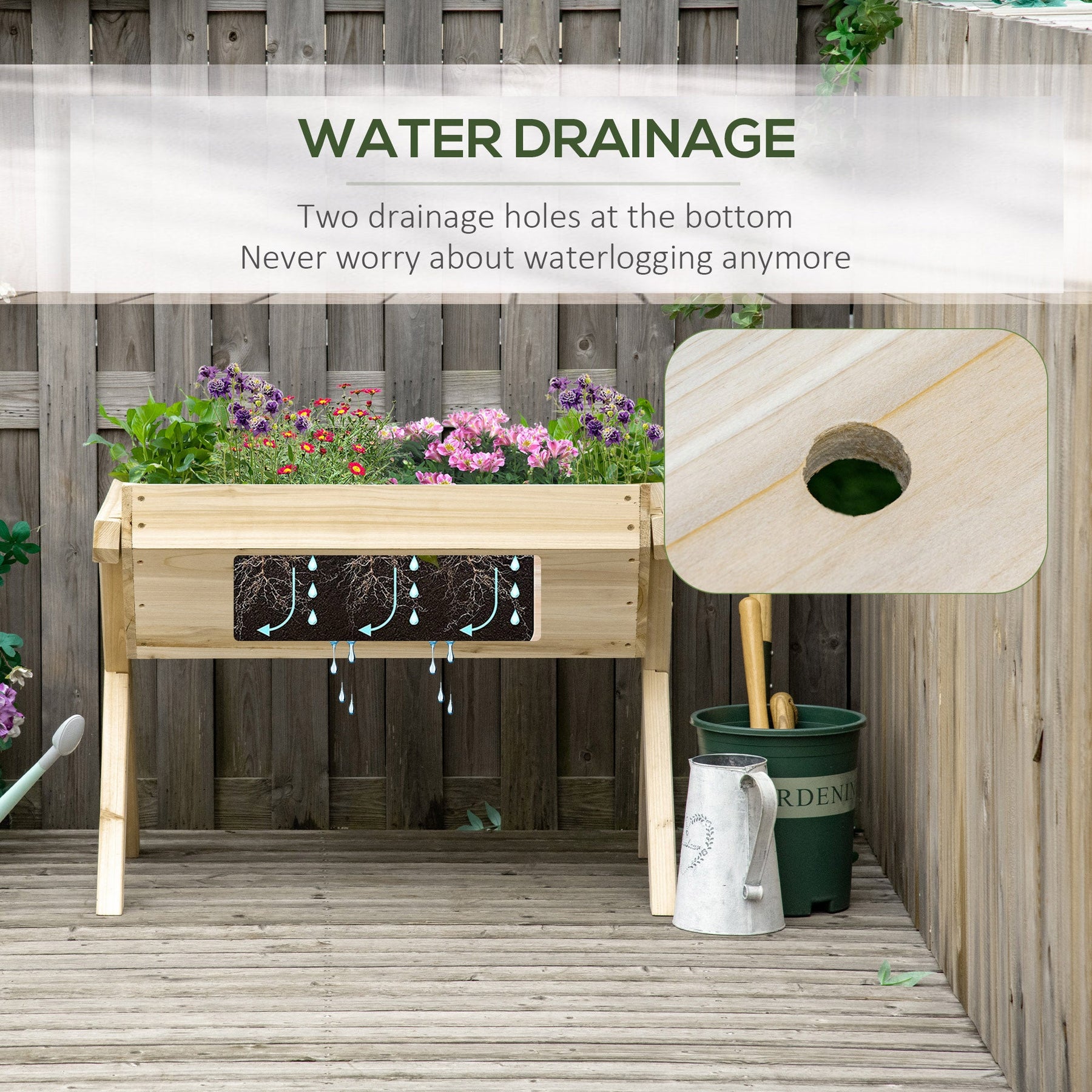 Grow your garden in comfort and style with this elevated raised garden planter bed. With a large-capacity funnel-shaped design, it offers plenty of planting space while promoting optimal water drainage. Equipped with leaking holes and a non-woven fabric bottom, this innovative bed keeps soil fresh, prevents overwatering, and reduces erosion. Standing at 23.5" tall, it’s the ideal height for tending to plants without bending or straining—perfect for those who prefer ergonomic gardening. Crafted from natural fir wood with a protective finish, this planter is built for durability and outdoor use. Whether you're planting flowers, herbs, or vegetables, this raised bed makes gardening easier and more enjoyable.