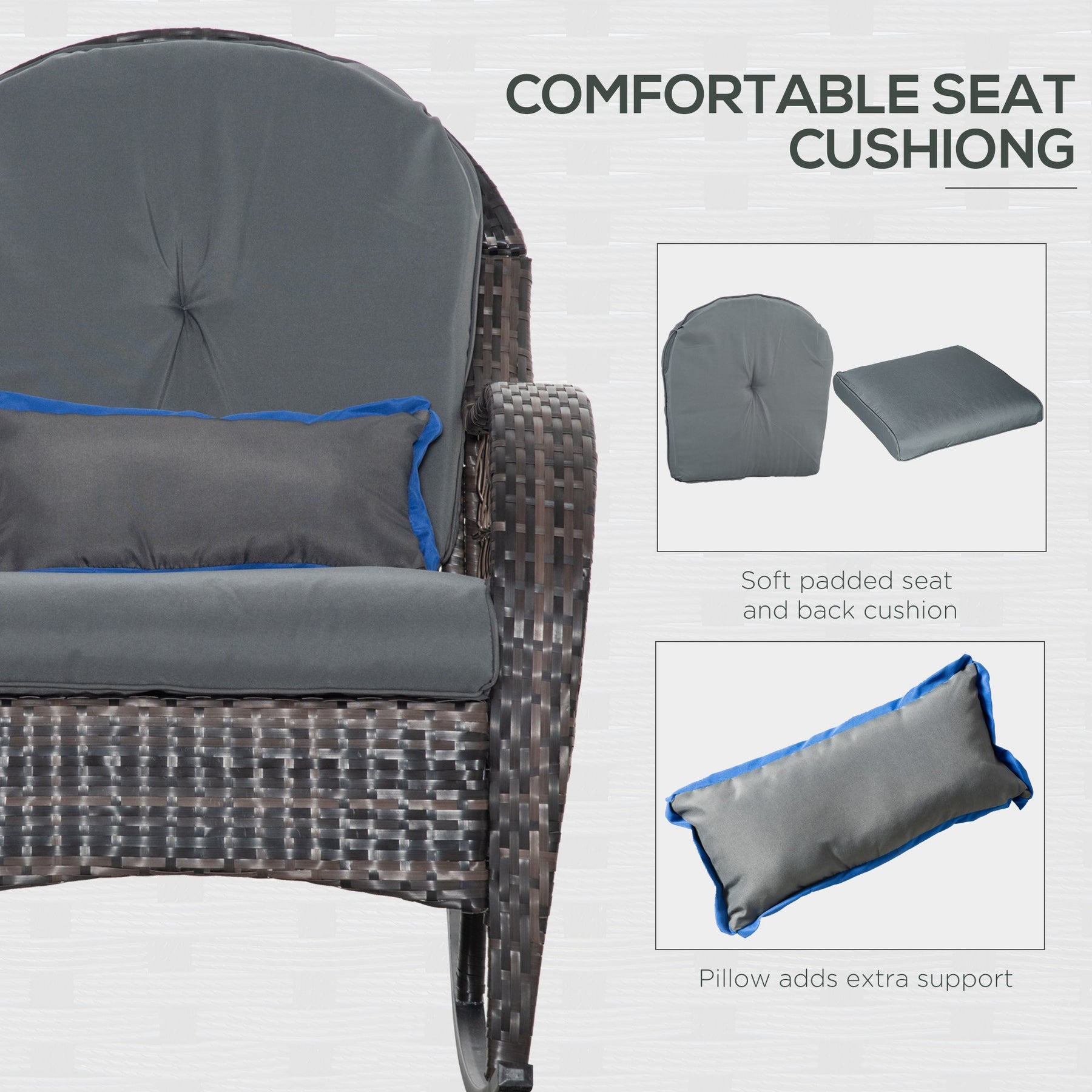 Enjoy a perfect blend of style and comfort with this high-end indoor and outdoor rocking chair. Designed with spacious seating for ultimate relaxation, it offers a smooth rocking motion ideal for use in the living room, garden, patios, backyards, or poolside. The stable base ensures a gentle rocking experience, and curved plastic foot pads act as swing limiters for added safety. The chair is outfitted with curved armrests, an extra-deep back-support cushion, and a thick seat cushion, all contributing to a luxurious seating experience. The cushions feature removable zippers for easy cleaning, while being durable and long-lasting. Built to withstand the elements, this rocker chair is constructed with a rust-resistant powder-coated steel frame for high stability and durability, and it is wrapped in hand-woven PE rattan wicker. Whether you're relaxing indoors or outdoors, this stylish and functional chair offers hours of cozy lounging.