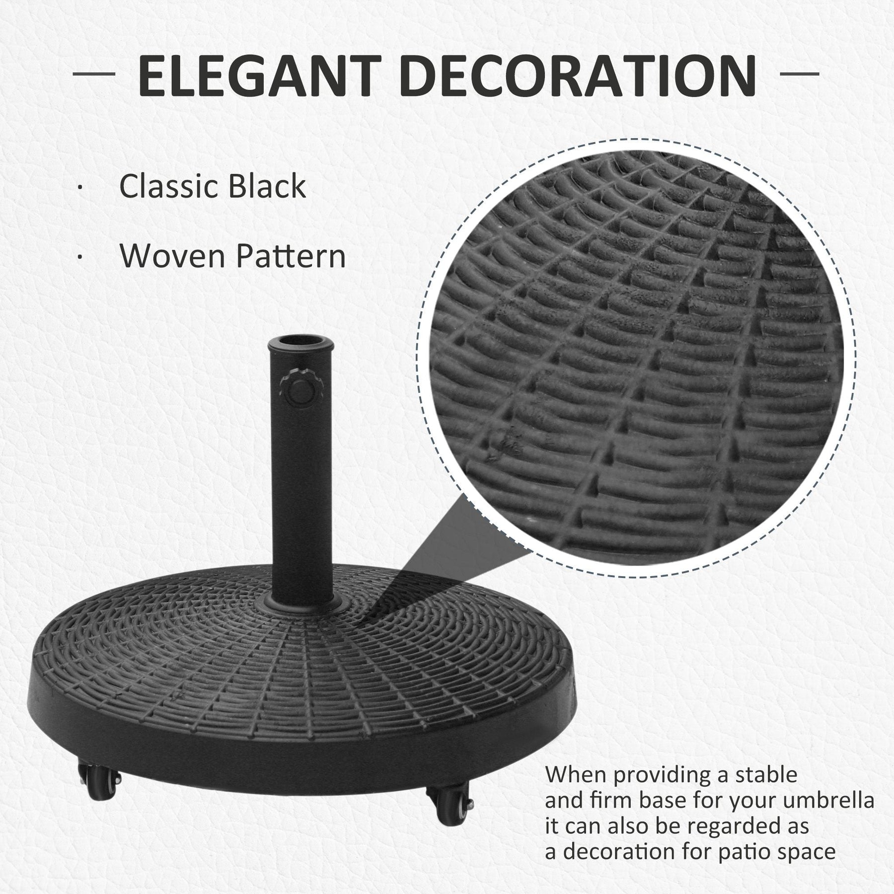Secure your patio umbrella with style and stability using this versatile umbrella base. Designed to fit umbrella poles with diameters of 1 1/2" or 1 8/9", it features an adjustable tightening knob to keep the pole securely in place. Constructed from durable resin and reinforced with steel, this base is built to last through many seasons of outdoor use. Four built-in wheels allow for easy repositioning, and the integrated brakes ensure the base stays exactly where you want it. With a decorative, nature-inspired design, this umbrella stand enhances the look of your patio, garden, or backyard setup.