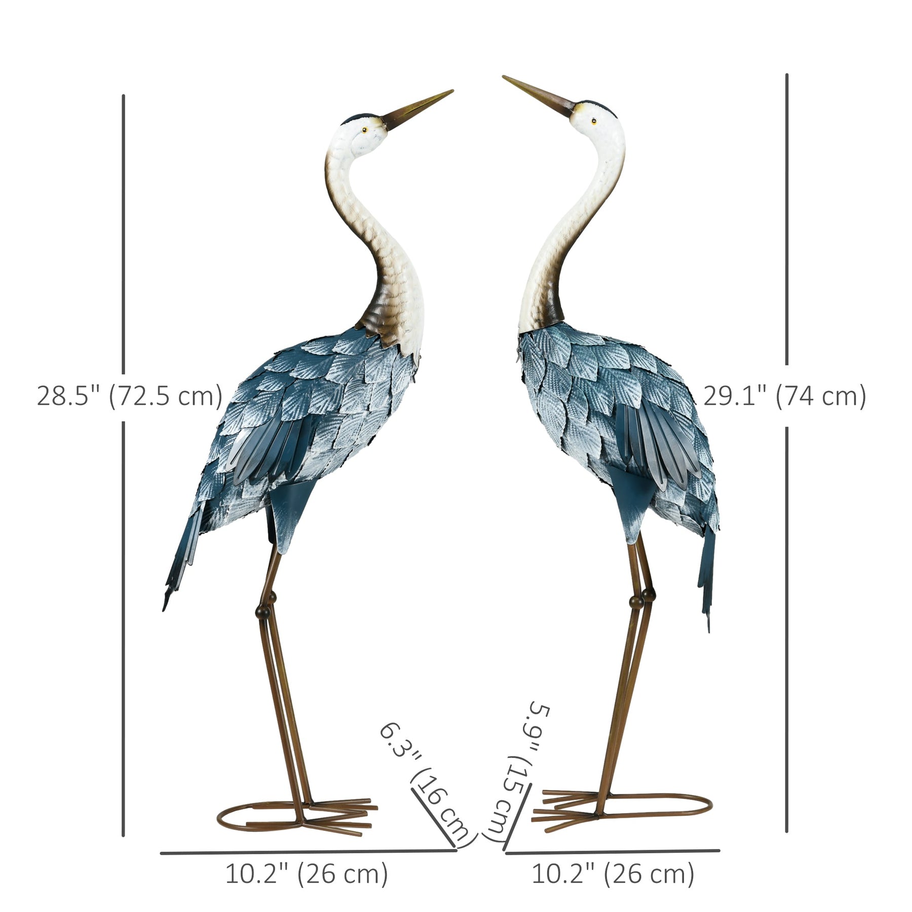 Add a touch of chic and natural elegance to your garden with these two cranes in graceful poses. Each crane features lifelike feathers with intricate texture, hand-painted in vibrant colors and an enchanting gradient effect. Crafted from steel, these statues are built to withstand the elements, making them a perfect outdoor decor choice. Electrophoresis and powder coating ensure that the cranes resist sun, rain, wind, and cold, remaining tough and fade-resistant for long-lasting beauty. Designed with circle feet and four U-shaped ground stakes, they are stable and less likely to be knocked over. These statues make delightful gifts for garden enthusiasts, bird lovers, or anyone looking to brighten their outdoor space.