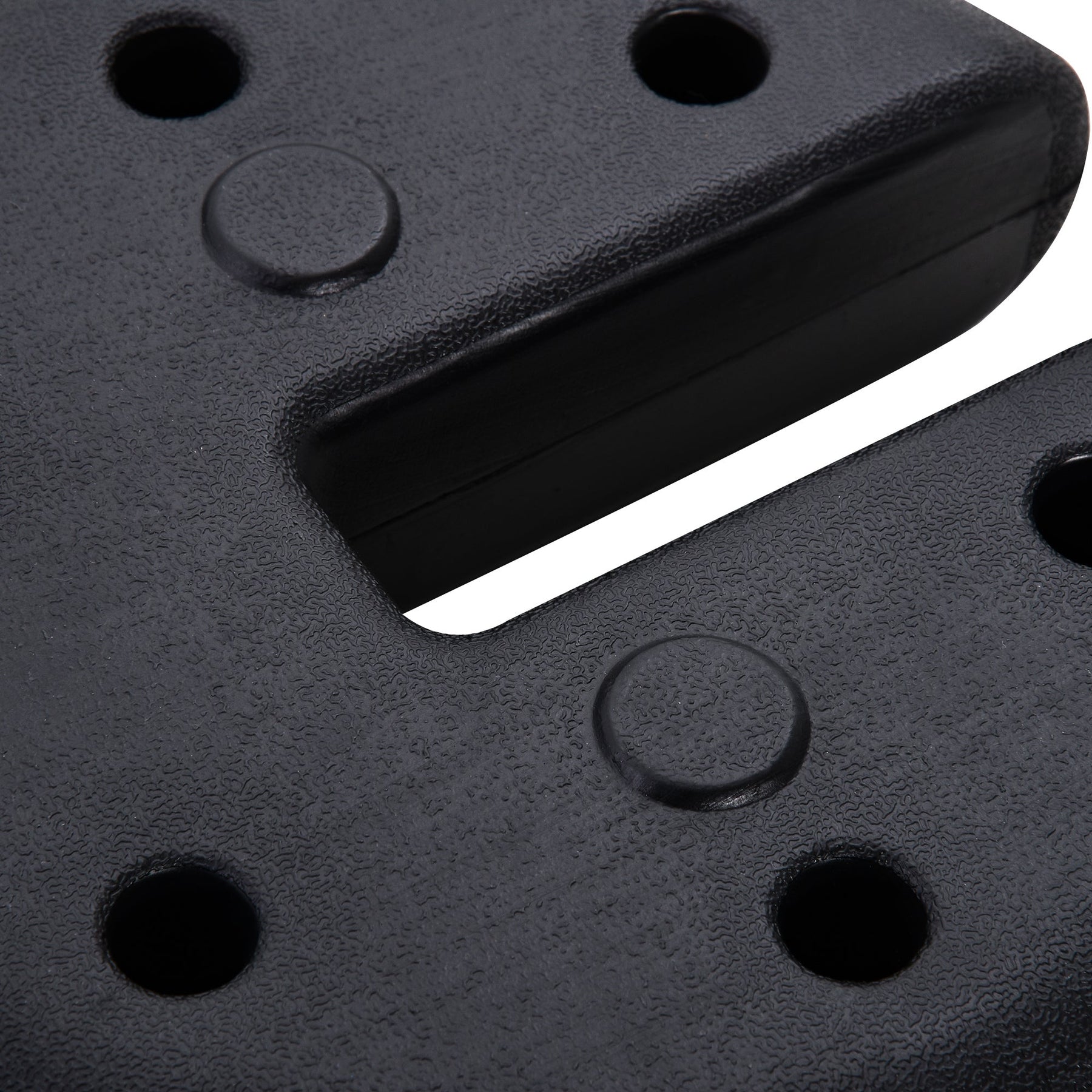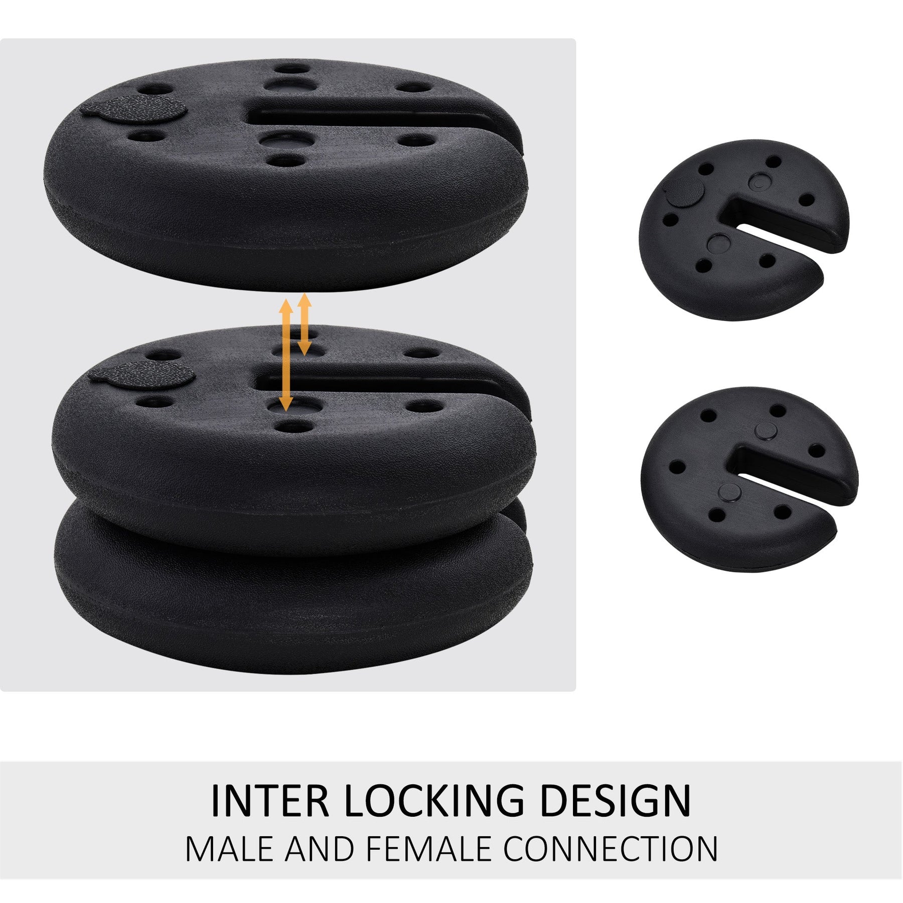 Secure your canopy setup with this high-quality set of four disc-shaped weight plates. Made from durable HDPE material, these weights are designed for use with instant canopies or similar tent structures. Each plate features a fillable design that can be loaded with sand, cement, or water to add stability. When filled with cement, each disc weighs approximately 5kg (11lbs); with sand, 4kg (8.8lbs); and with water, 3.5kg (7.7lbs). The universal interlocking design fits canopy poles ranging from 20x20mm to 25x25mm and ensures a secure, no-slip fit. The no-pinch design also allows for quick, safe, and hassle-free installation and removal.