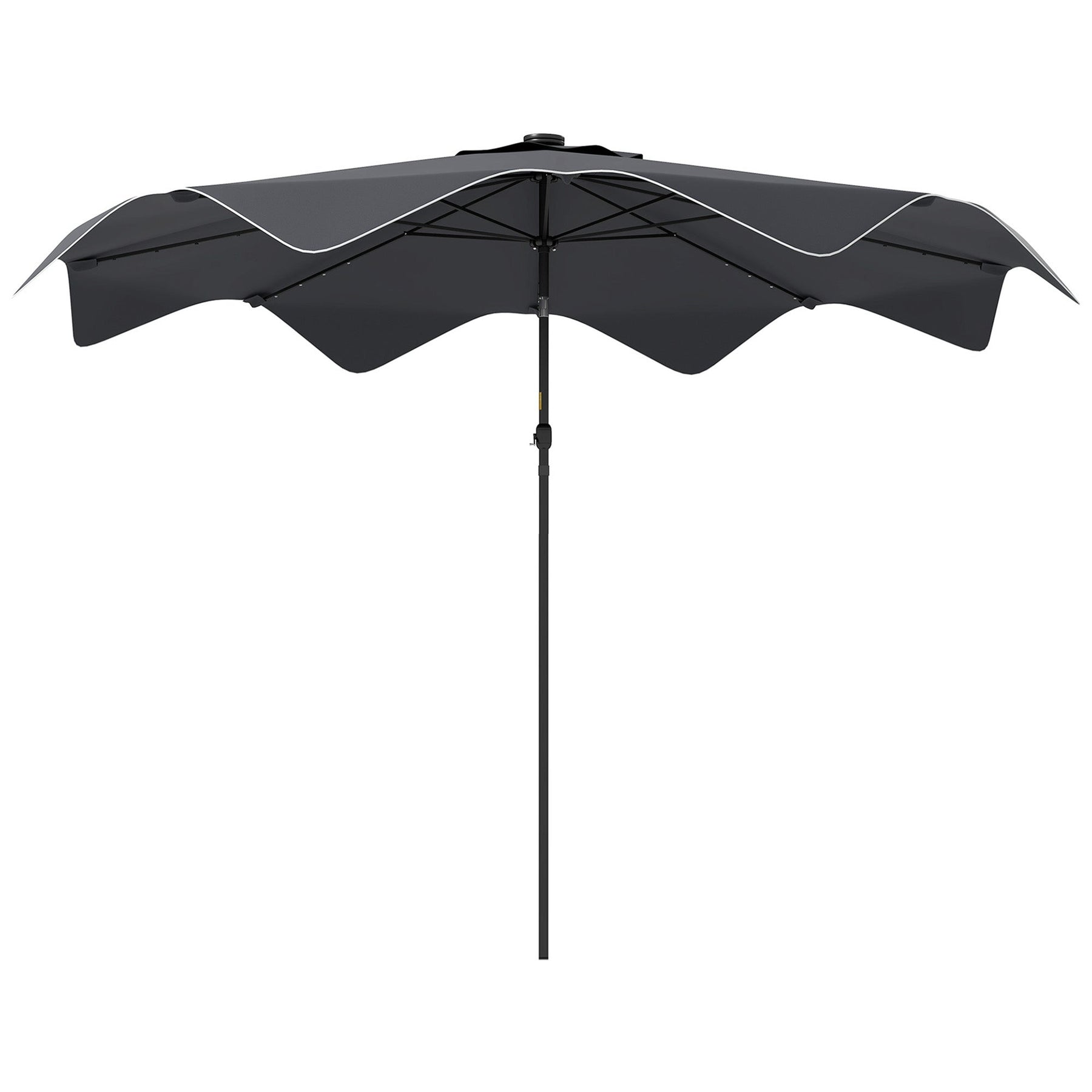 Stay cool during the day and enjoy soft lighting at night with this solar-powered patio umbrella. Designed to fit through a patio table or stand alone on a weighted base, it provides shade and comfort for outdoor dining, chats, and games. The canopy includes built-in LED lights on each rib, powered by a solar panel that stores energy for evening ambiance. Easily adjust the tilt and open/close the umbrella with the smooth hand crank. Crafted for durability, the umbrella features a vented 180gsm polyester canopy and sturdy powder-coated metal frame with eight ribs.